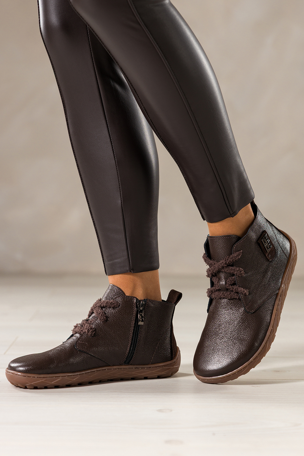 Czekoladowe botki barefoot skórzane damskie szerokie na elastycznej płaskiej podeszwie stalowa ozdo
