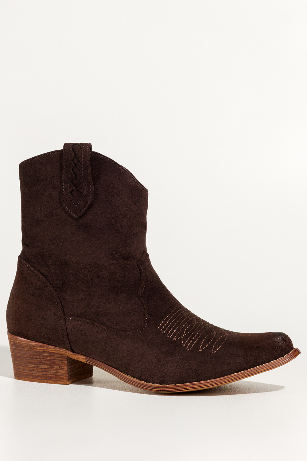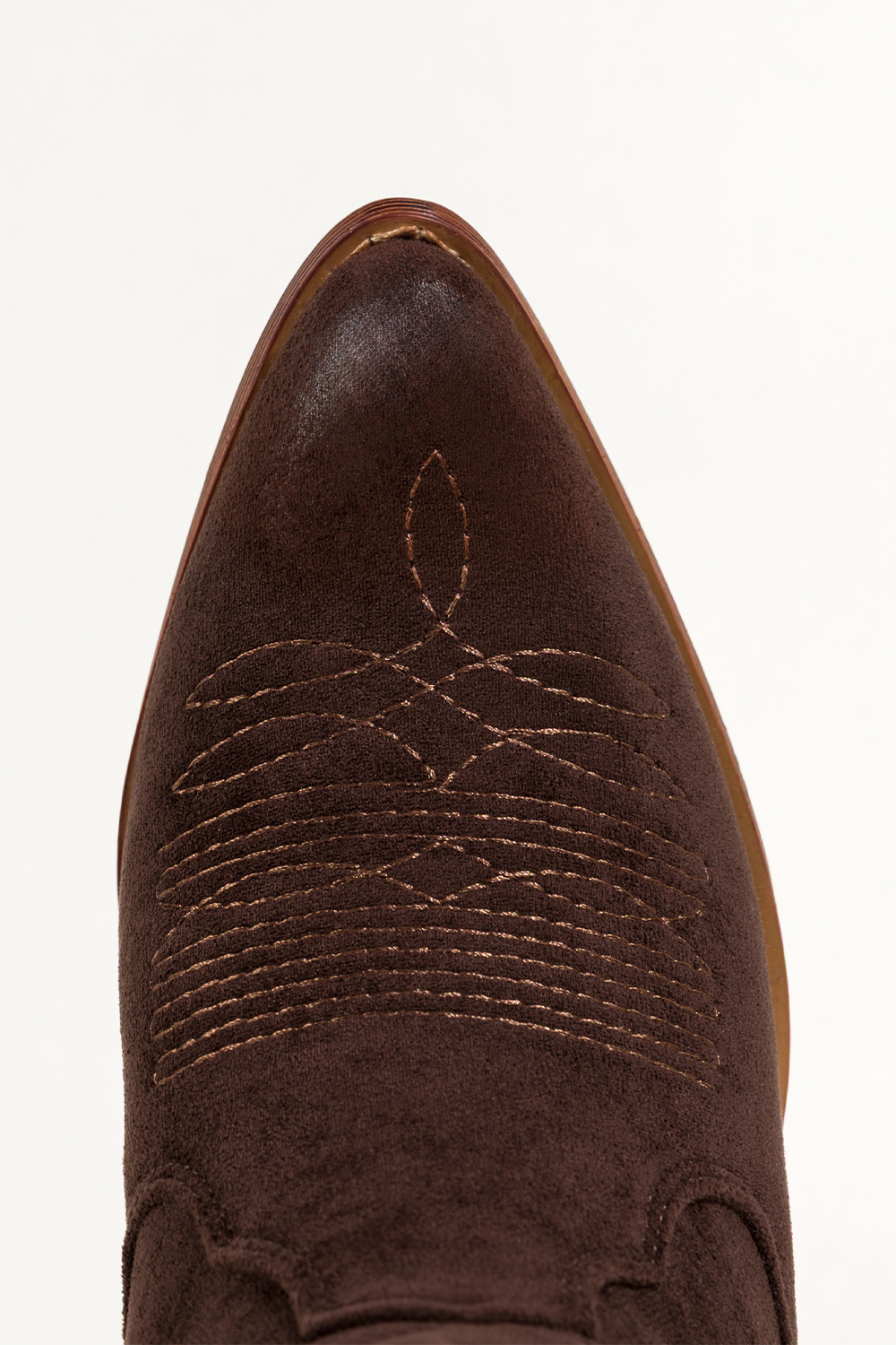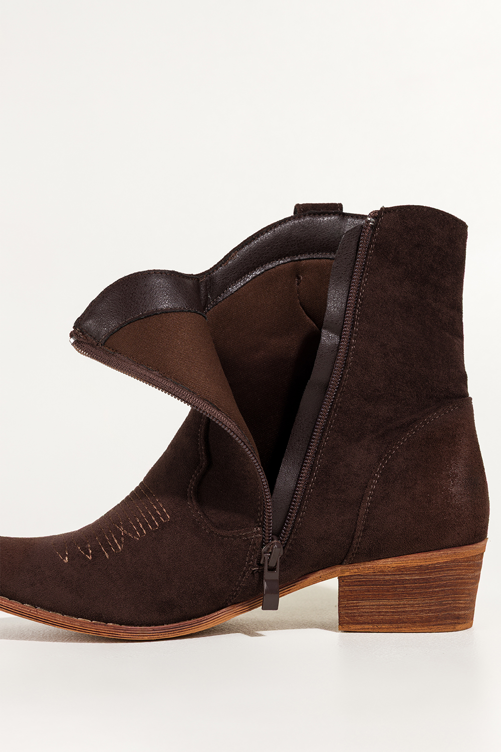 Czekoladowe botki damskie kowbojki na ściętym klocku cholewka z ozdobnymi przeszyciami skórzana wkł