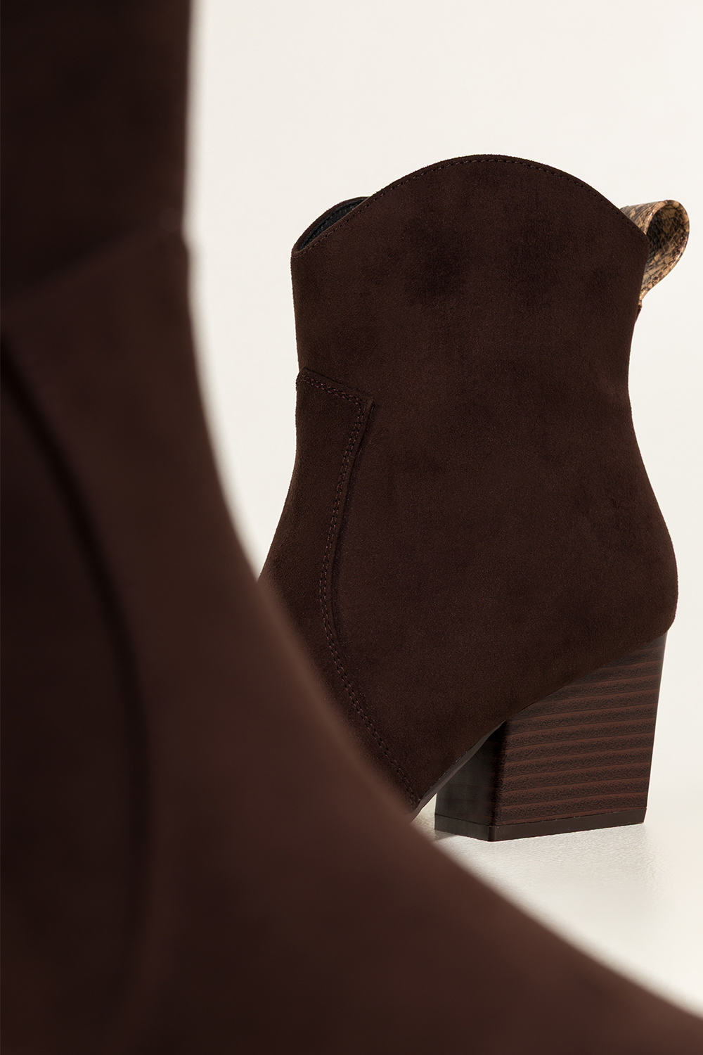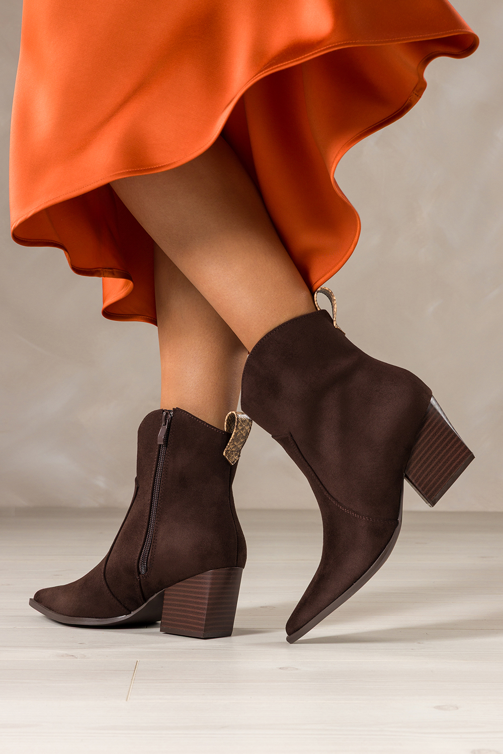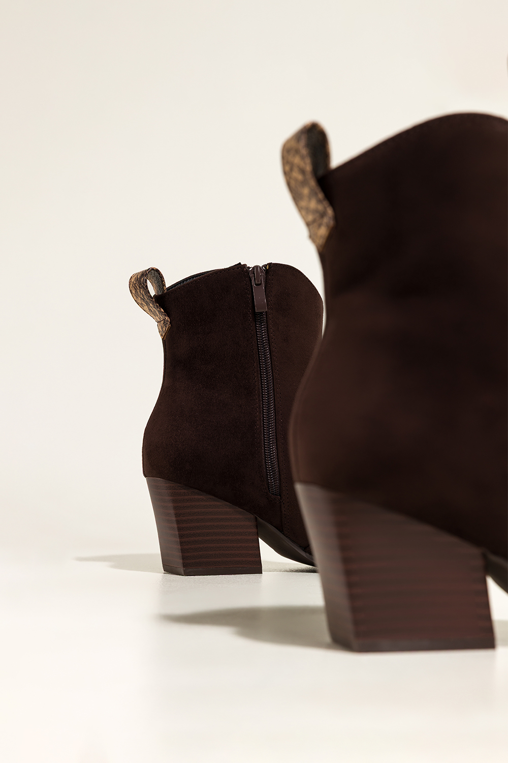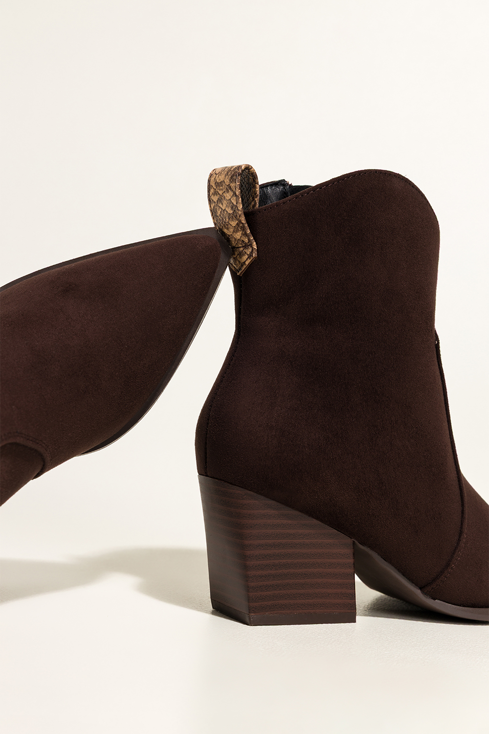 Czekoladowe botki damskie kowbojki ozdobny pasek z wzorem wężowym szeroki ścięty obcas Casu D25WX4-