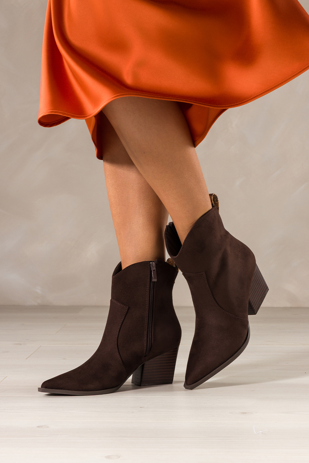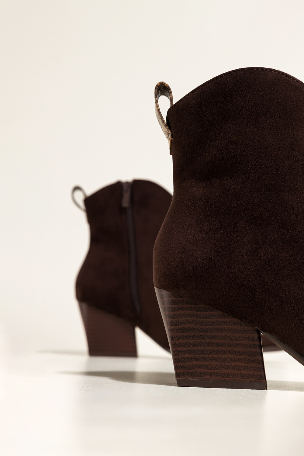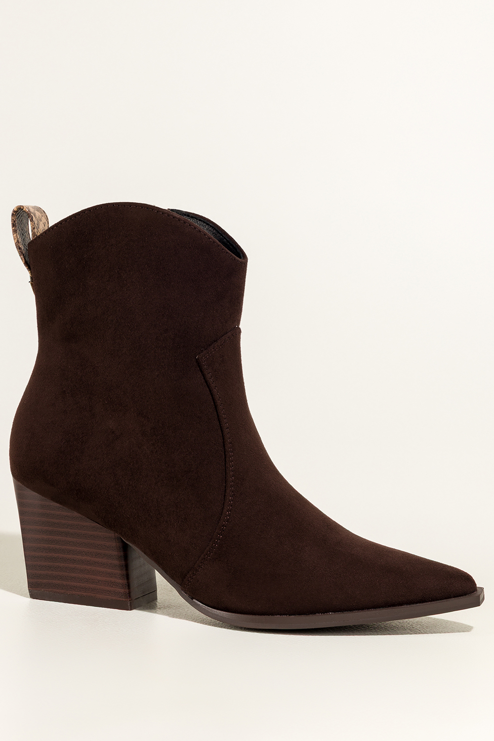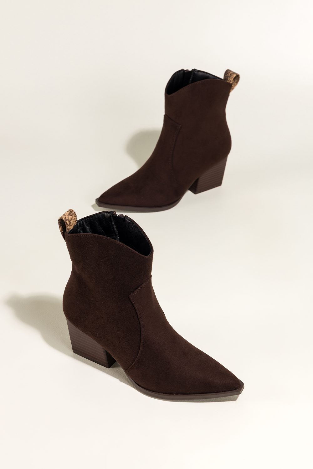 Czekoladowe botki damskie kowbojki ozdobny pasek z wzorem wężowym szeroki ścięty obcas Casu D25WX4-