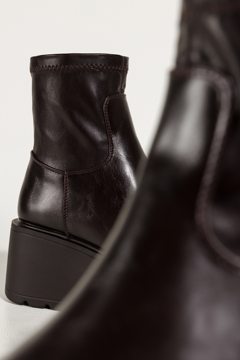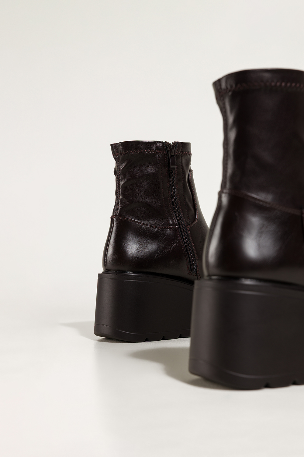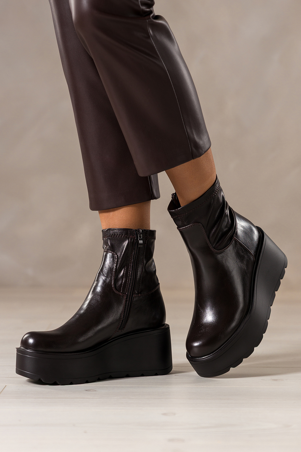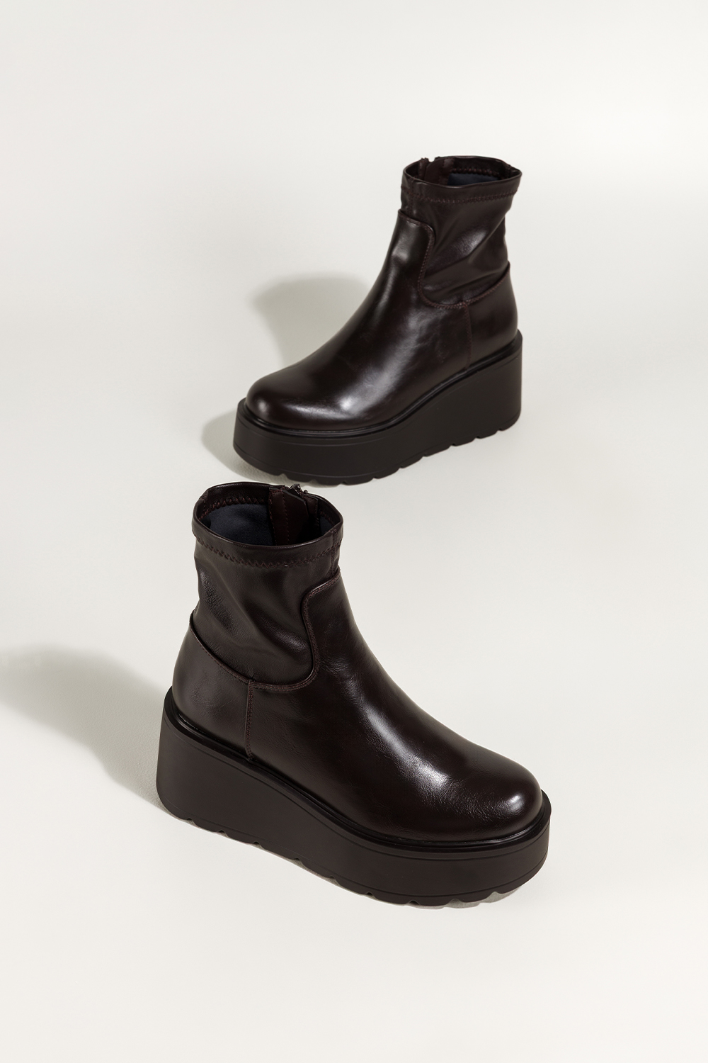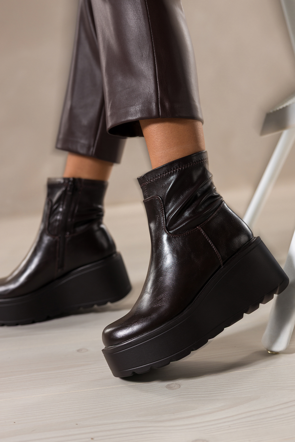 Czekoladowe botki skórzane damskie na bieżnikowanej platformie guma w cholewce PRODUKT POLSKI Casu