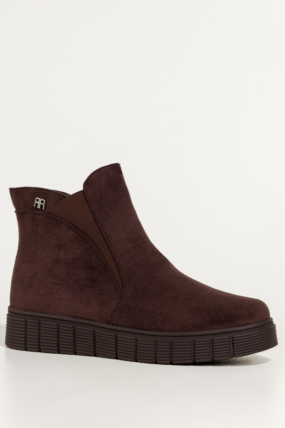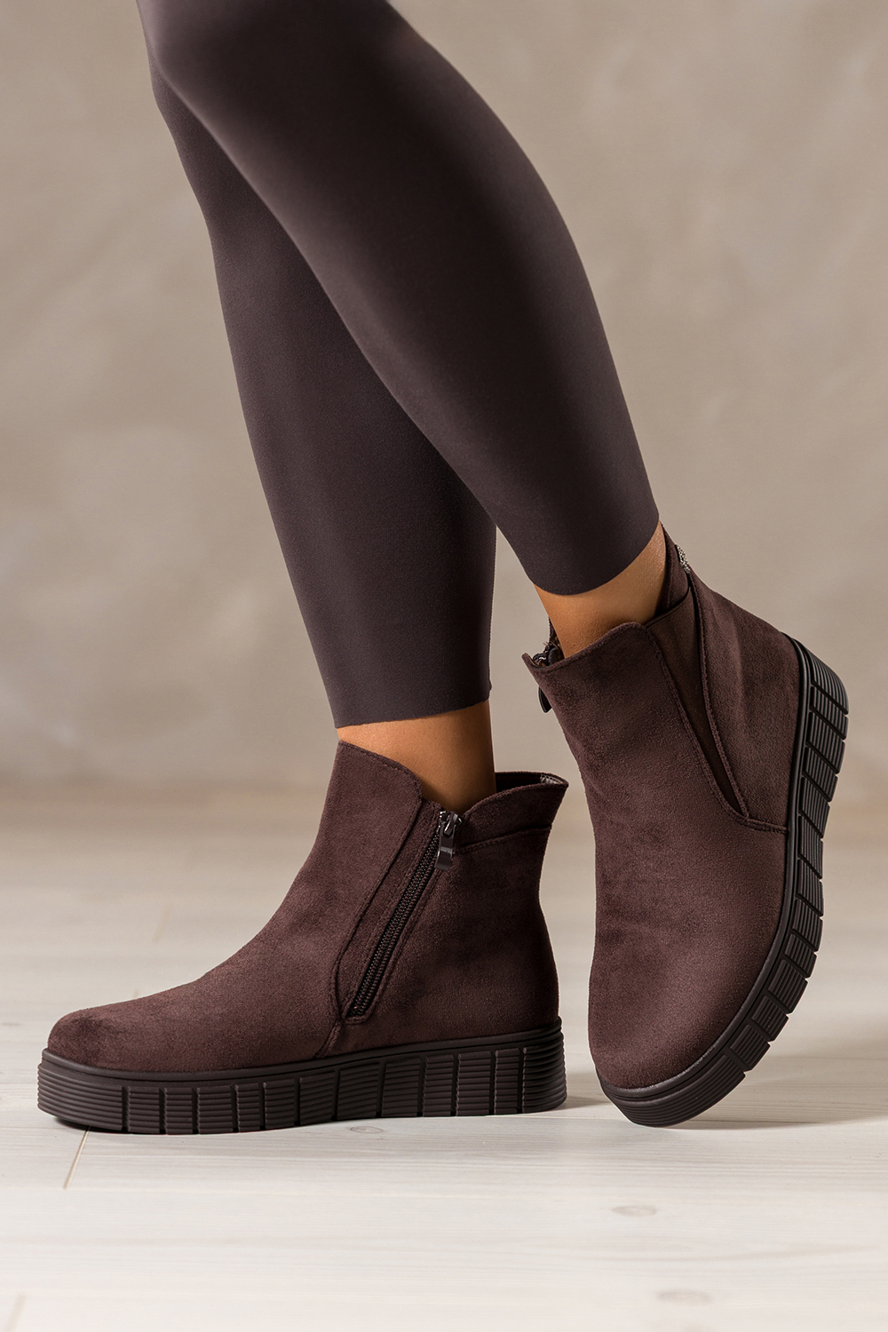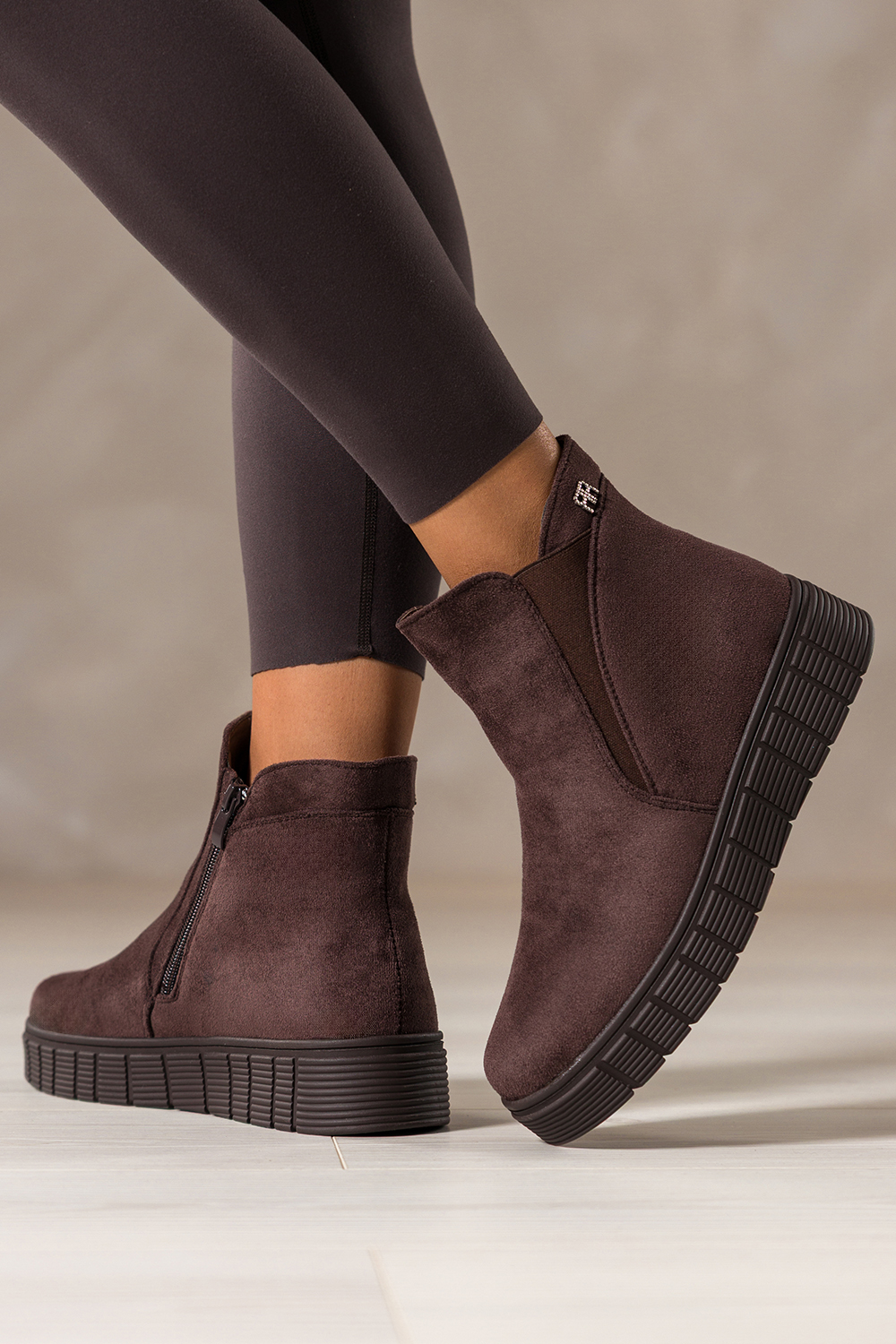 Czekoladowe botki damskie na żłobionej platformie guma w cholewce ozdoba z cyrkoniami Casu 2238-7