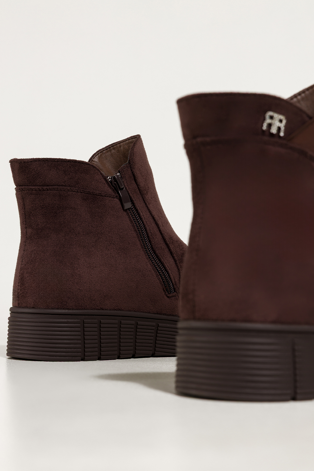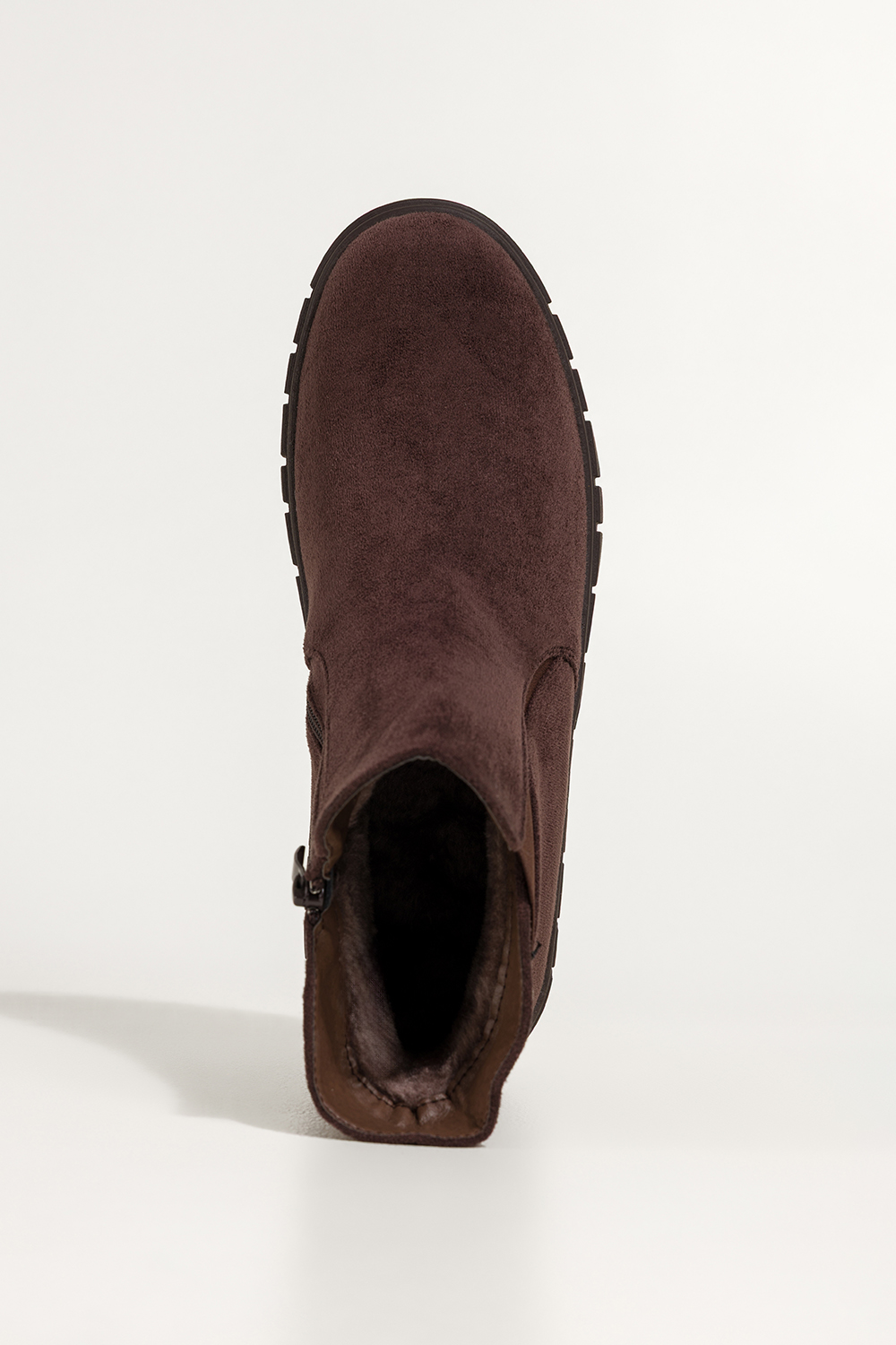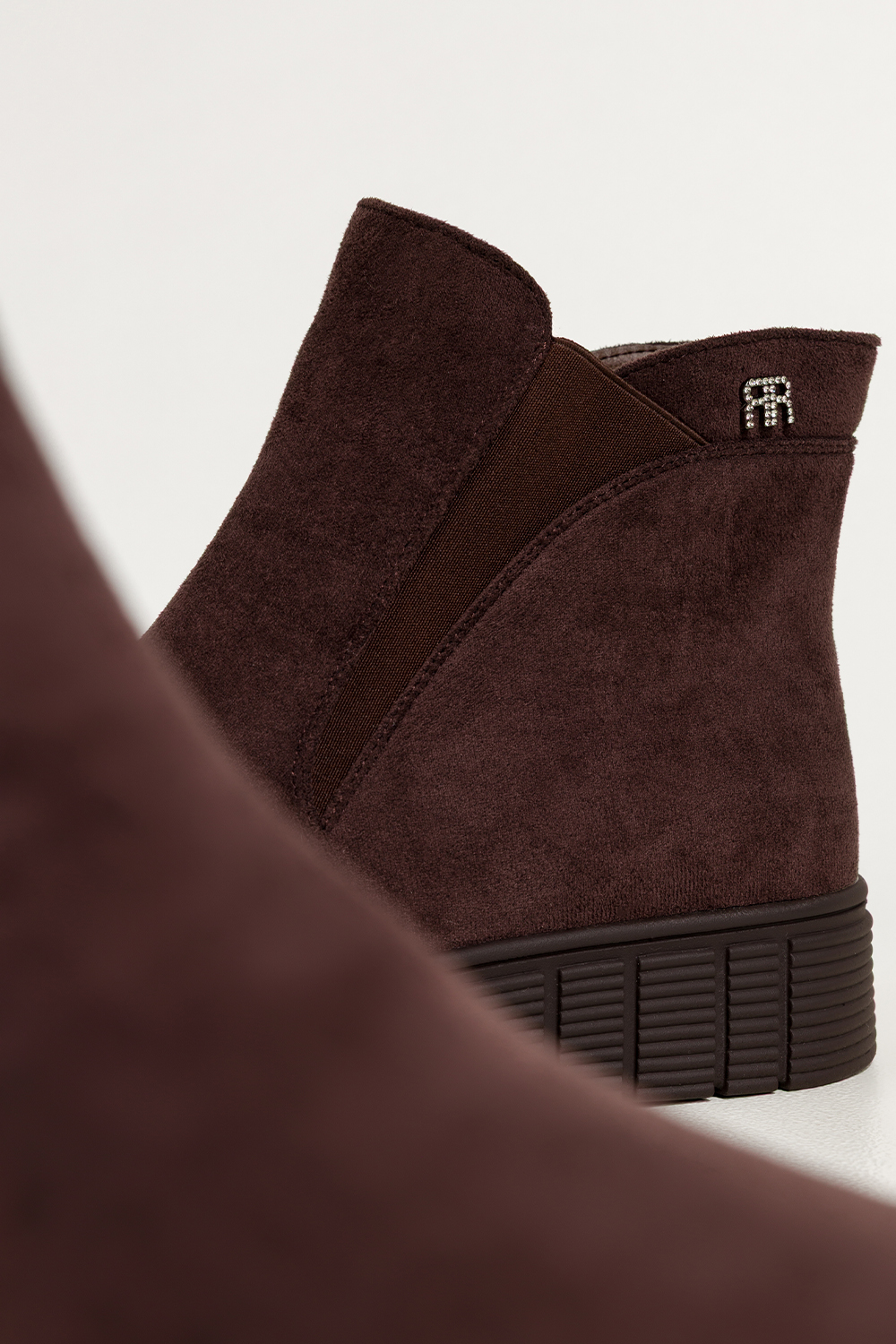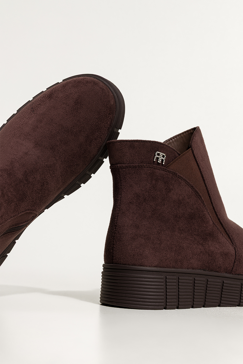 Czekoladowe botki damskie na żłobionej platformie guma w cholewce ozdoba z cyrkoniami Casu 2238-7