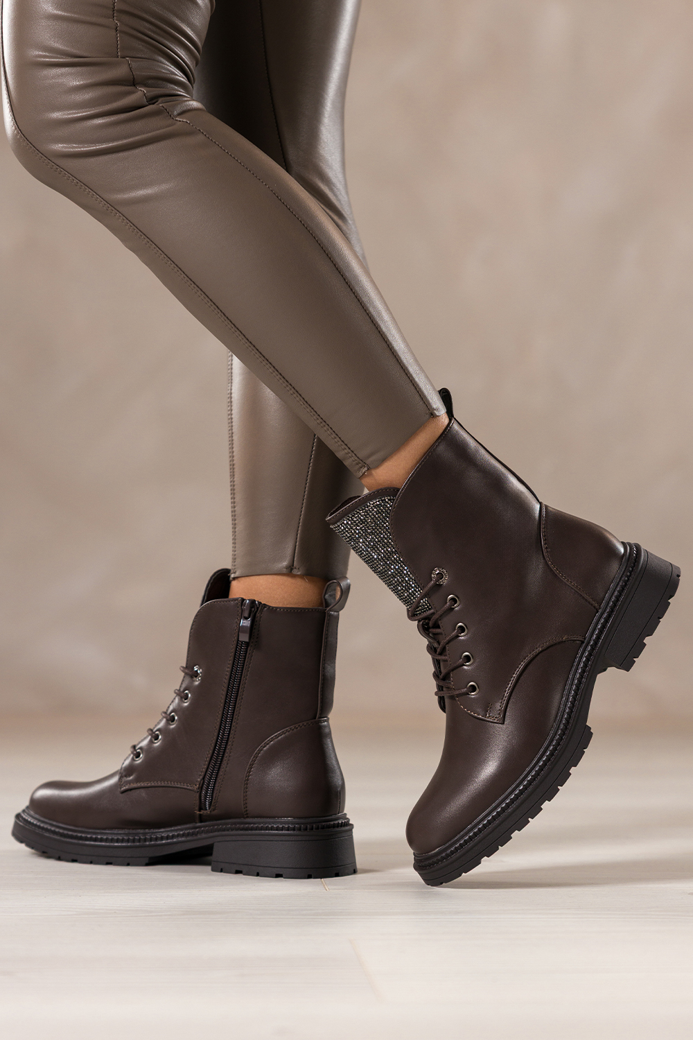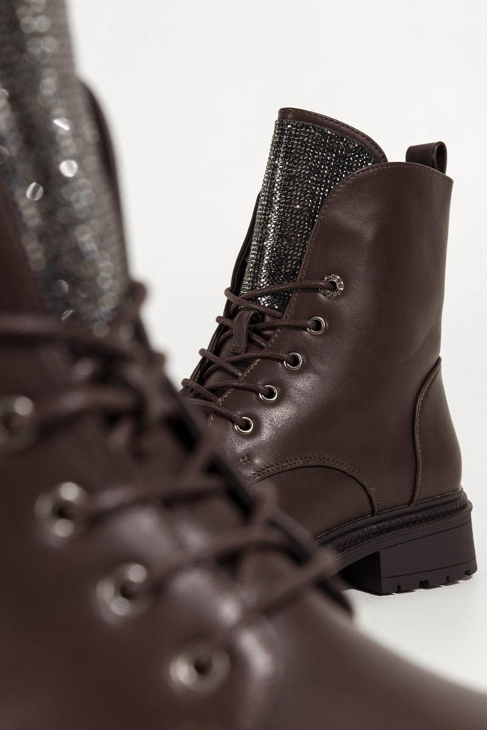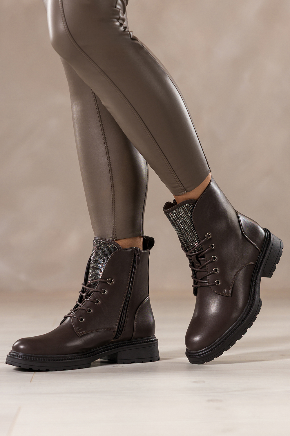 Czekoladowe botki damskie na żłobionej platformie język z cyrkoniami sznurowane Casu EH763-92