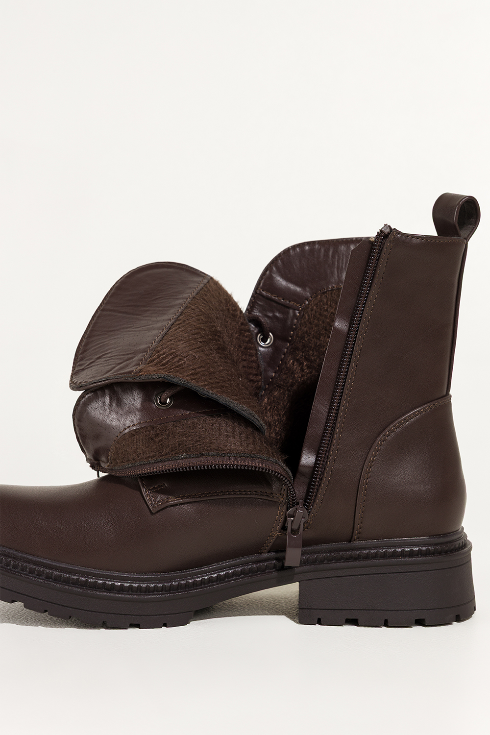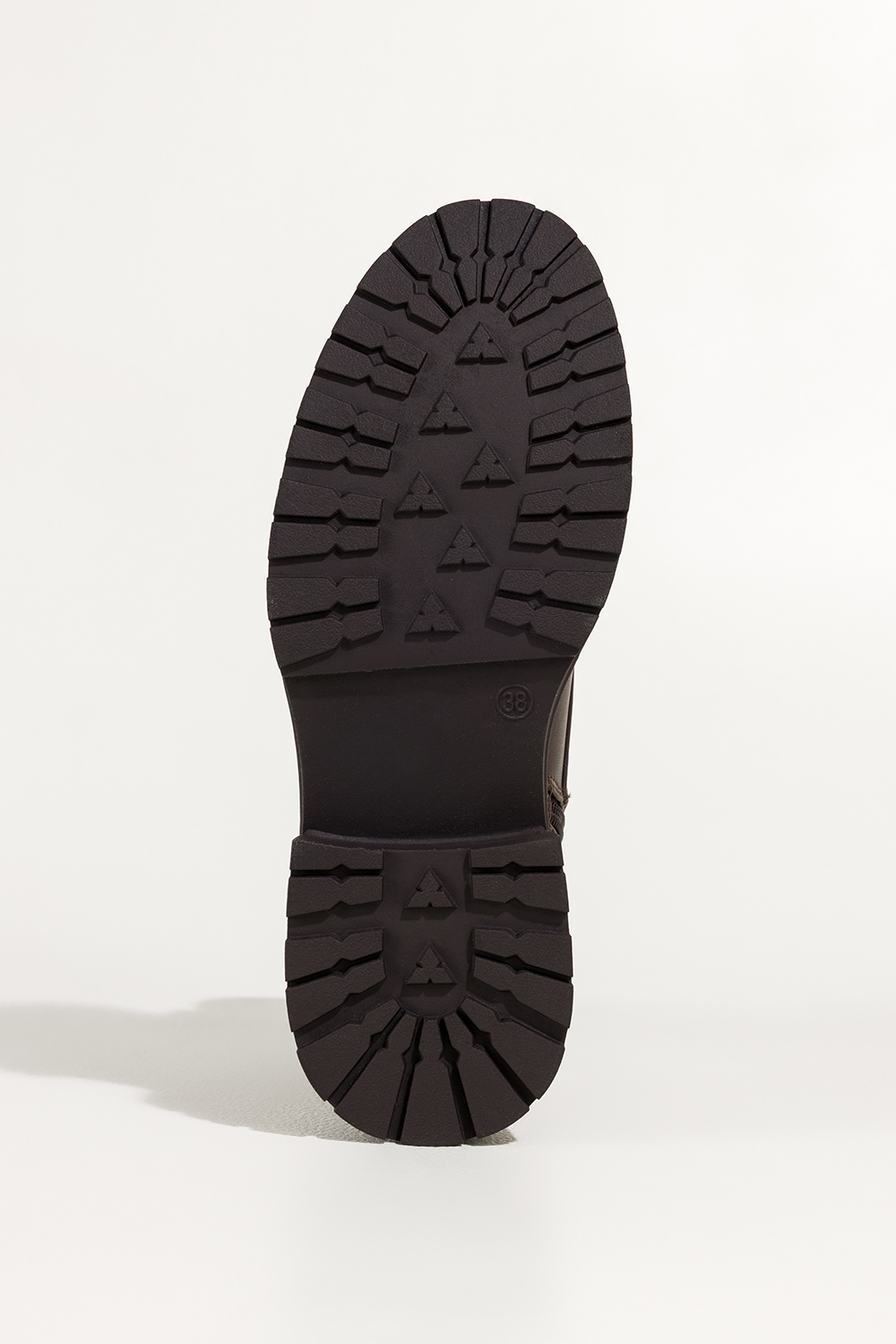 Czekoladowe botki damskie na bieżnikowanej platformie guma w cholewce pasek ze złotą klamrą Casu D7