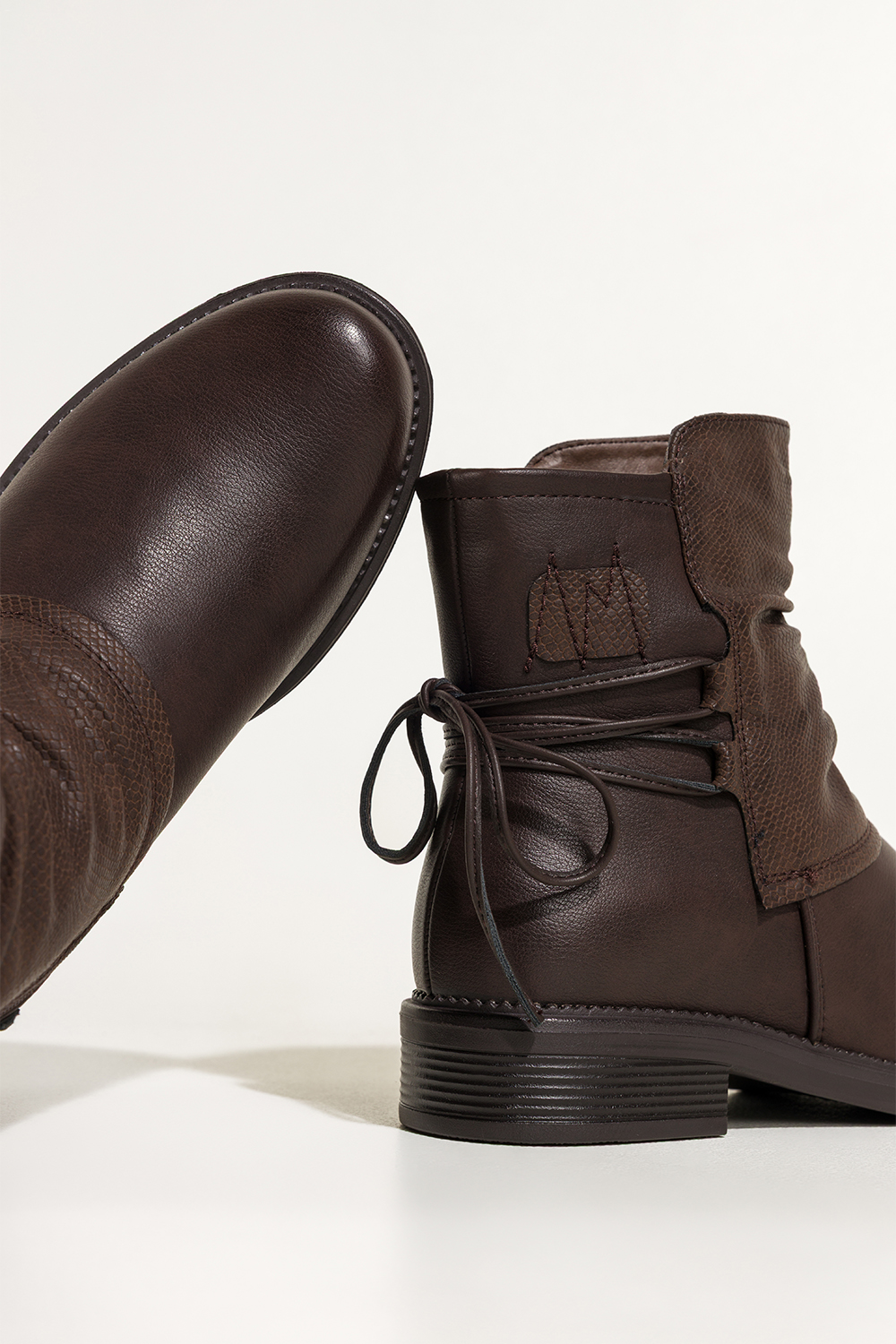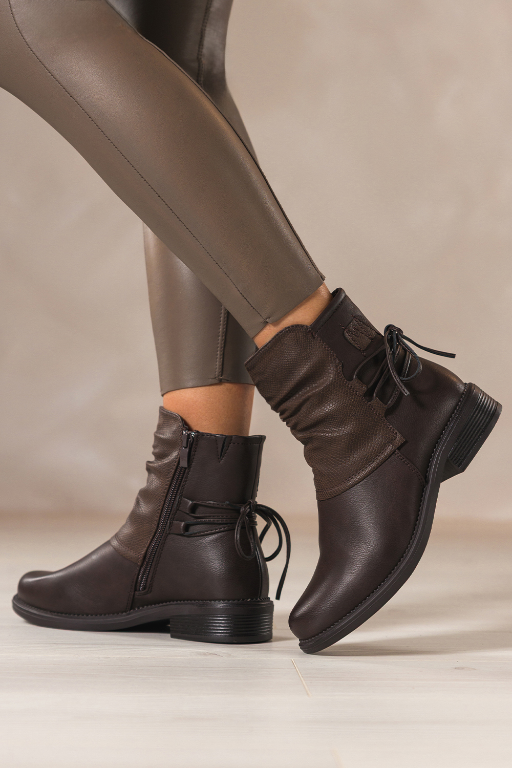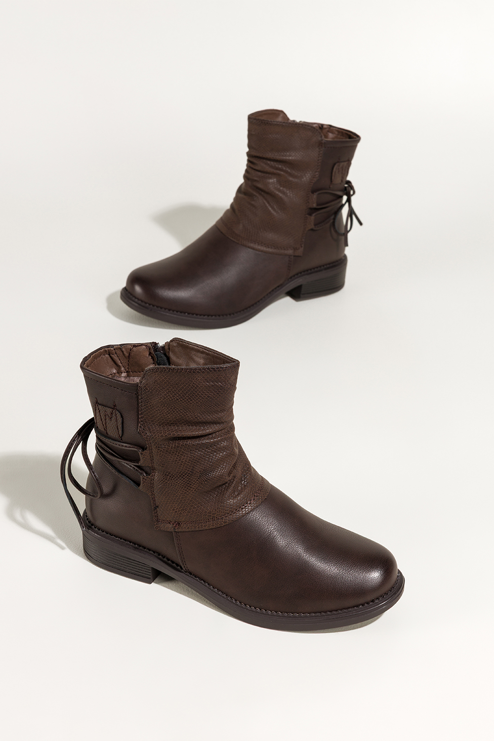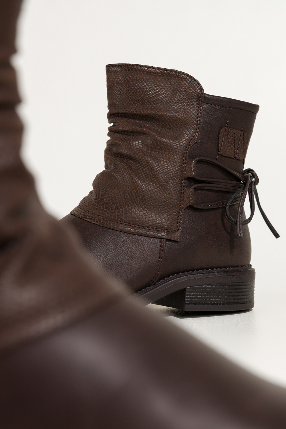 Czekoladowe botki damskie niski szeroki obcas marszczona cholewka z ozdobnym wiązaniem Casu 72414-7