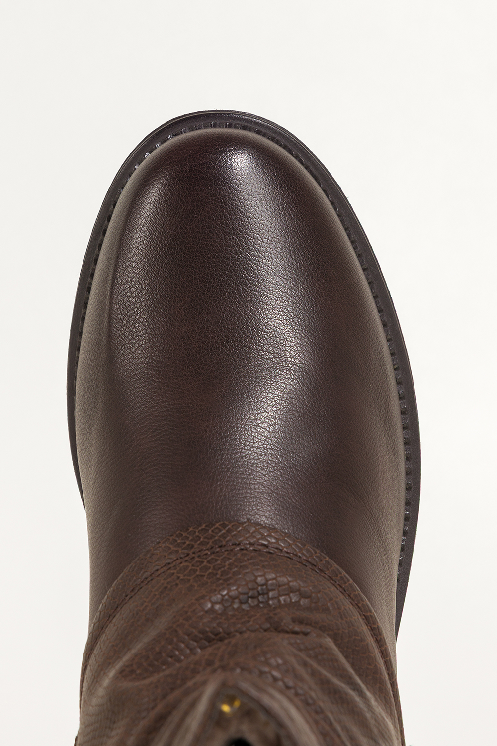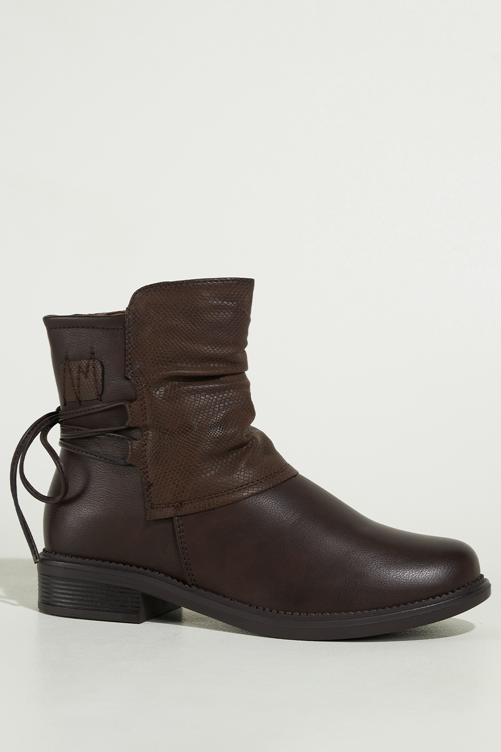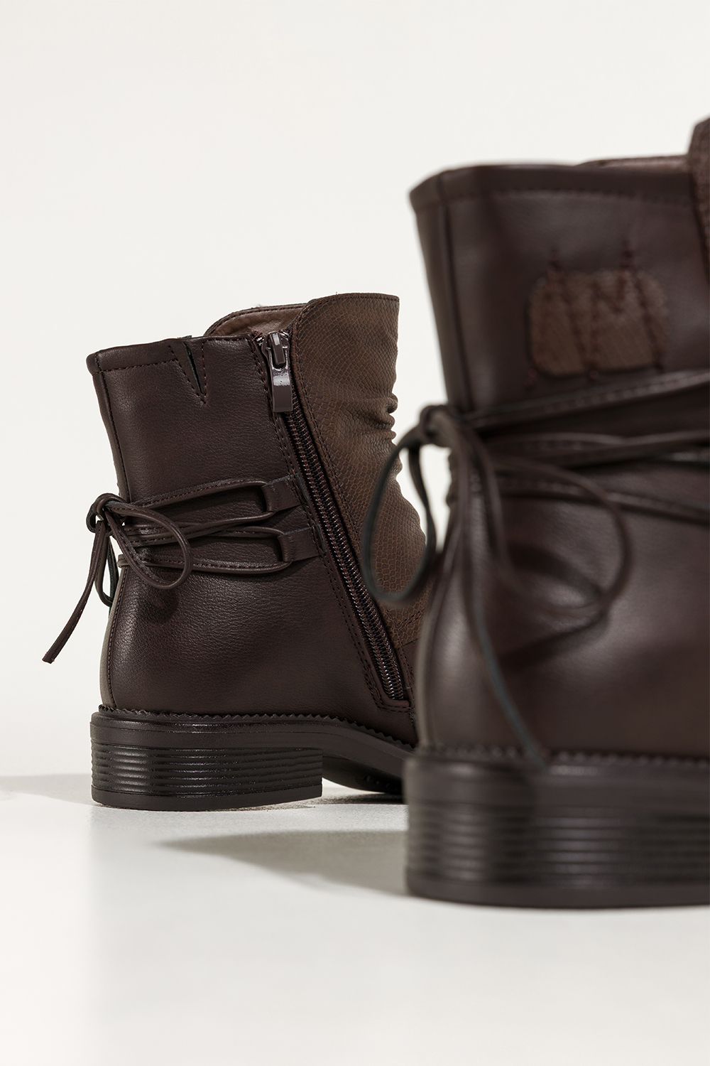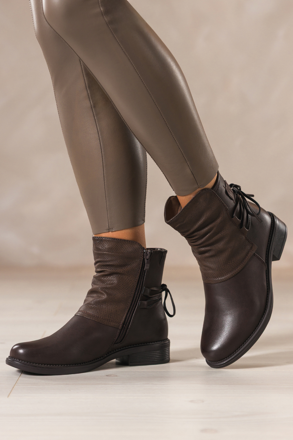 Czekoladowe botki damskie niski szeroki obcas marszczona cholewka z ozdobnym wiązaniem Casu 72414-7