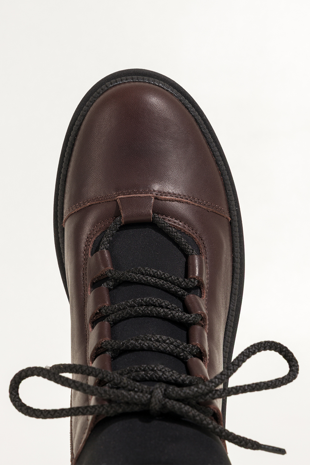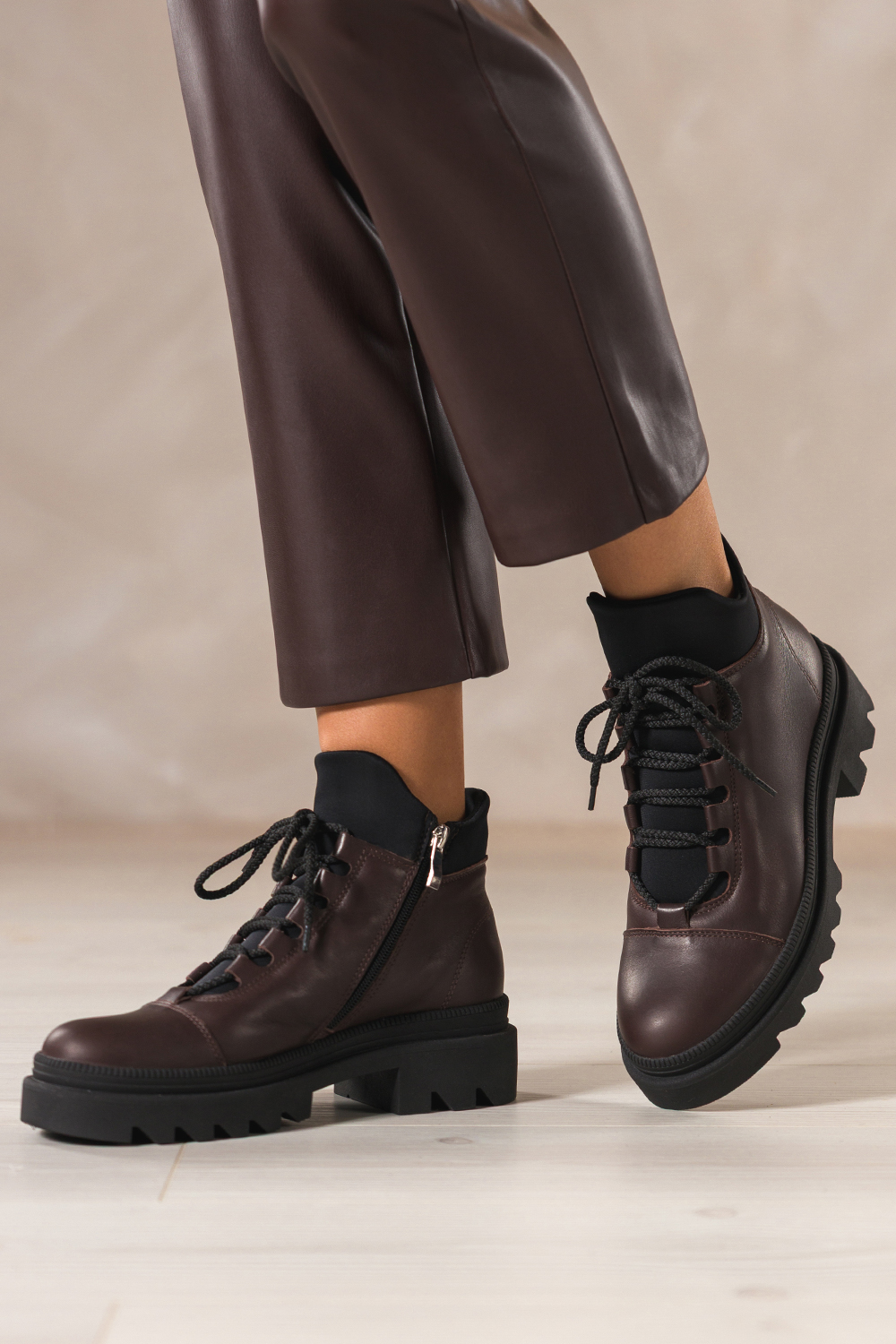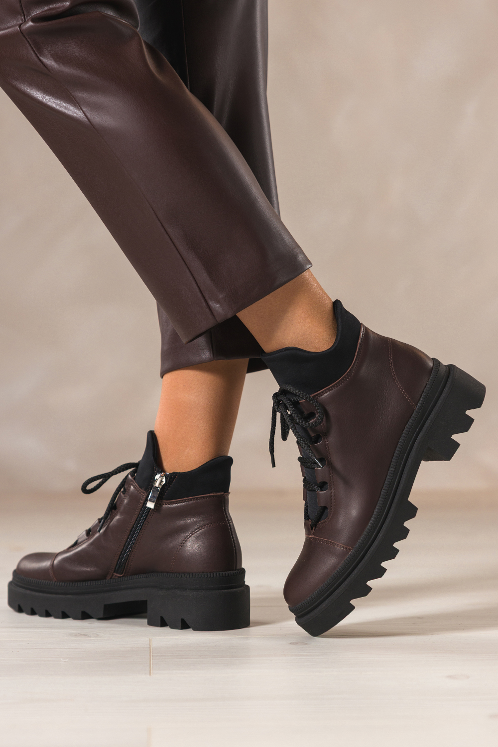 Czekoladowe botki skórzane damskie Sergio Leone na beżowej bieżnikowanej platformie elastyczna guma
