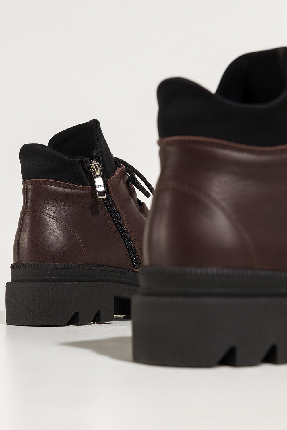 Bordowe botki skórzane damskie na bieżnikowanej platformie wycięta cholewka stalowa ozdoba sznurowa