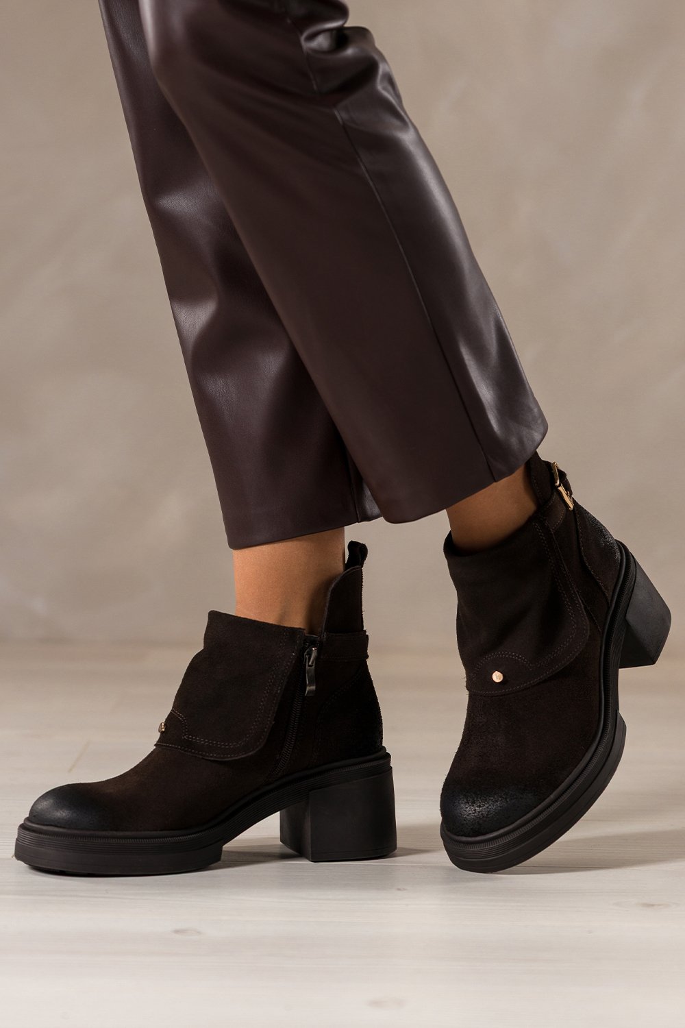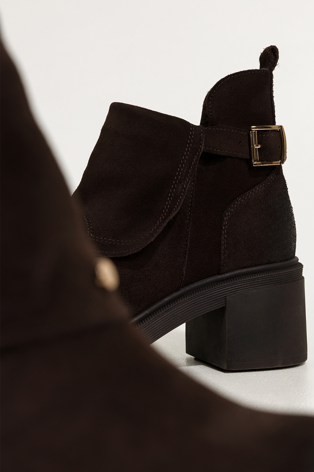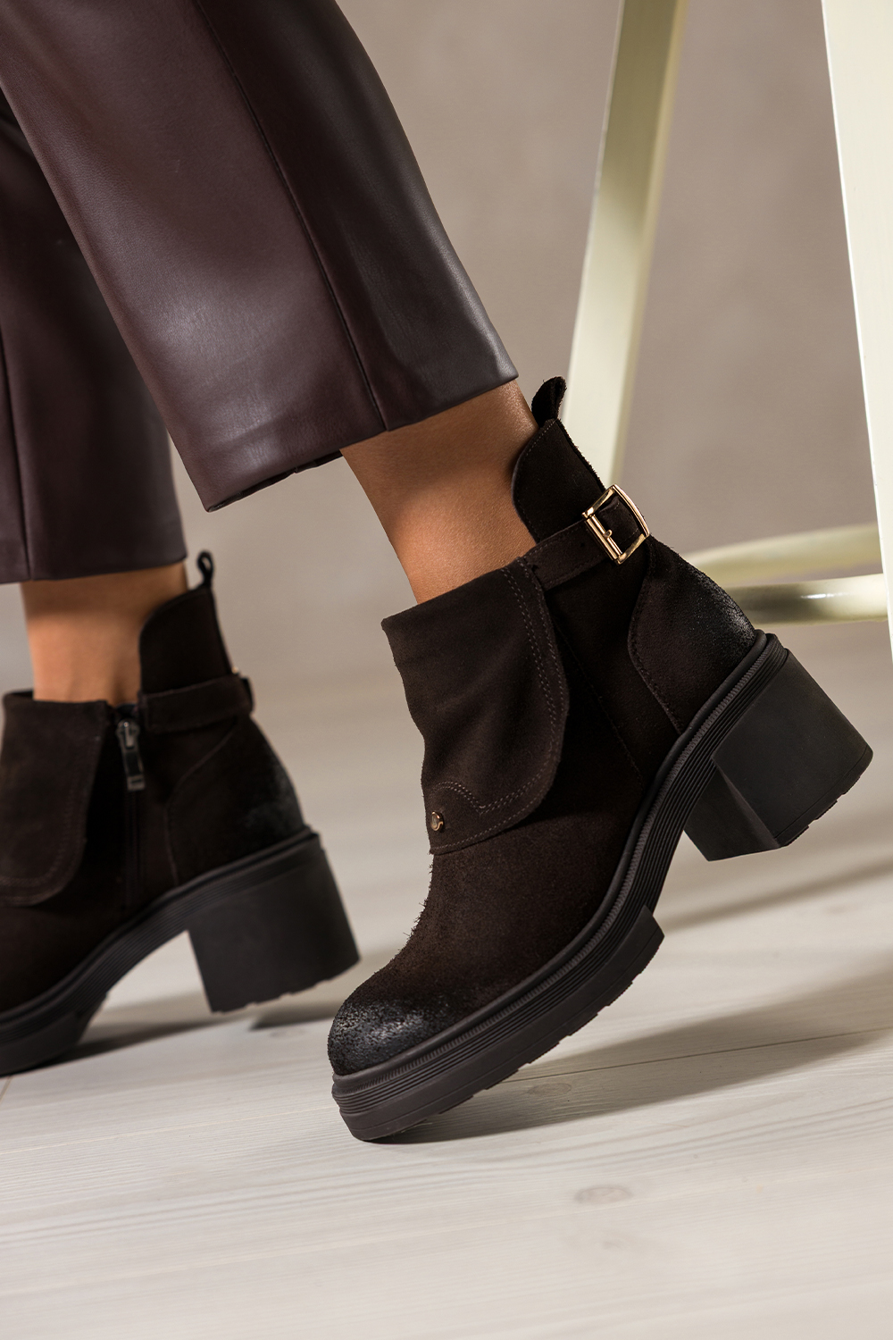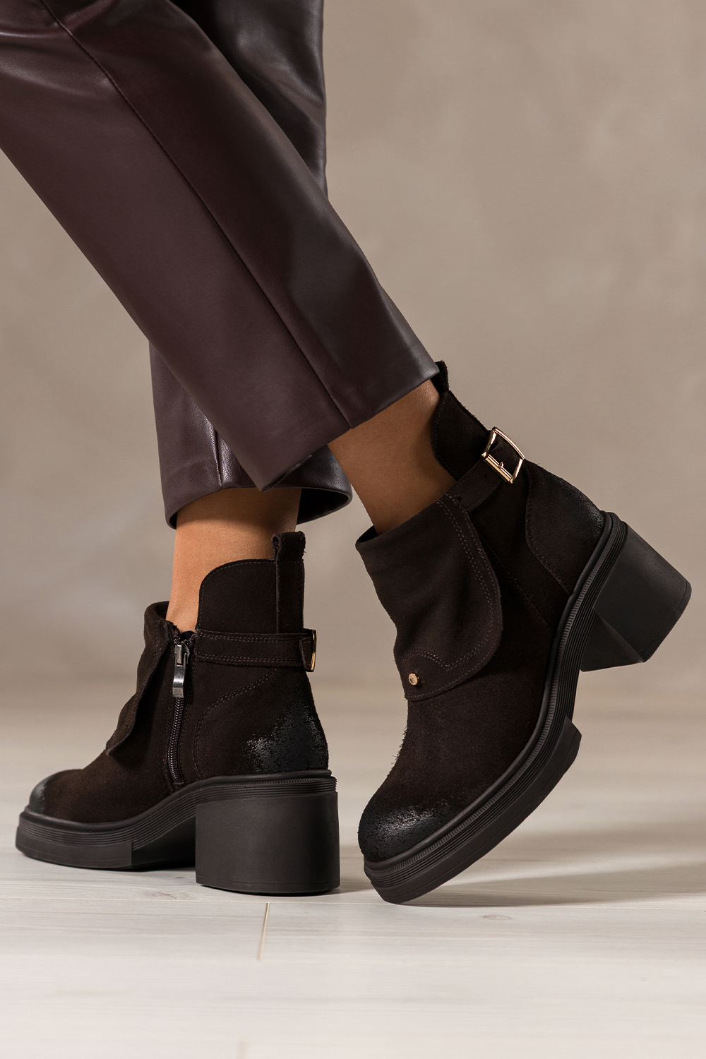 Czekoladowe botki skórzane damskie na platformie pasek ze złotą klamrą PRODUKT POLSKI Casu 8843