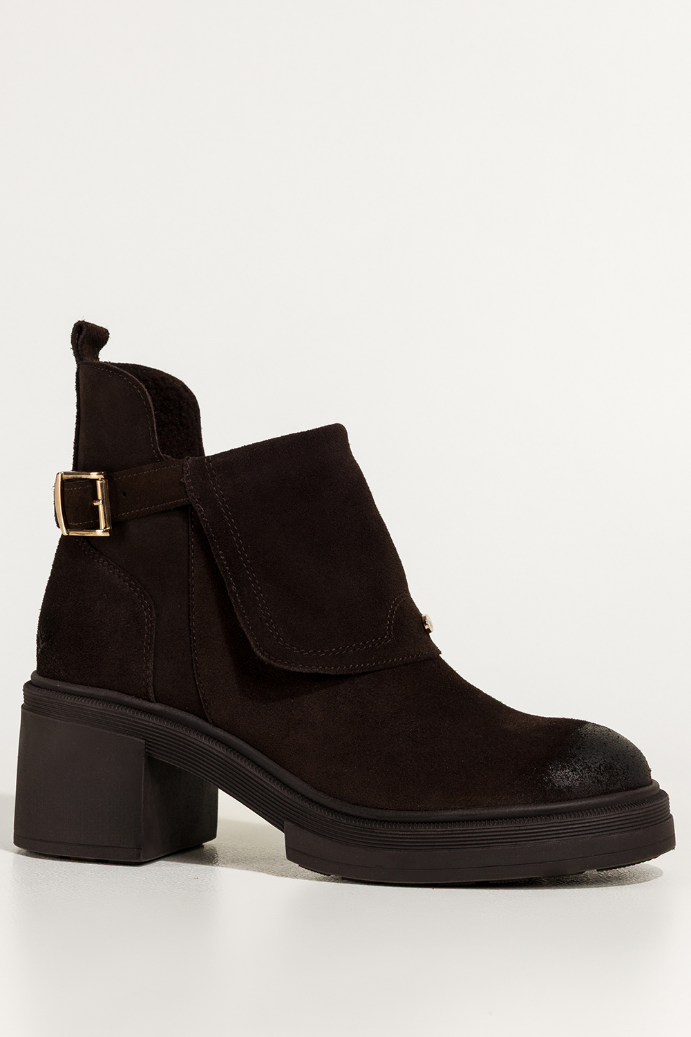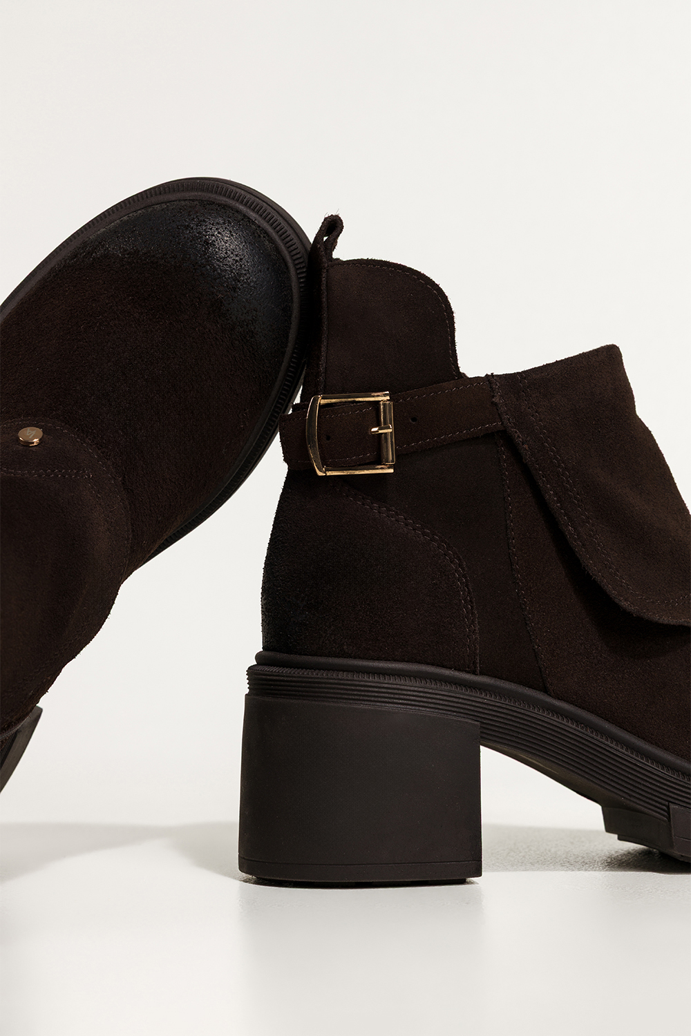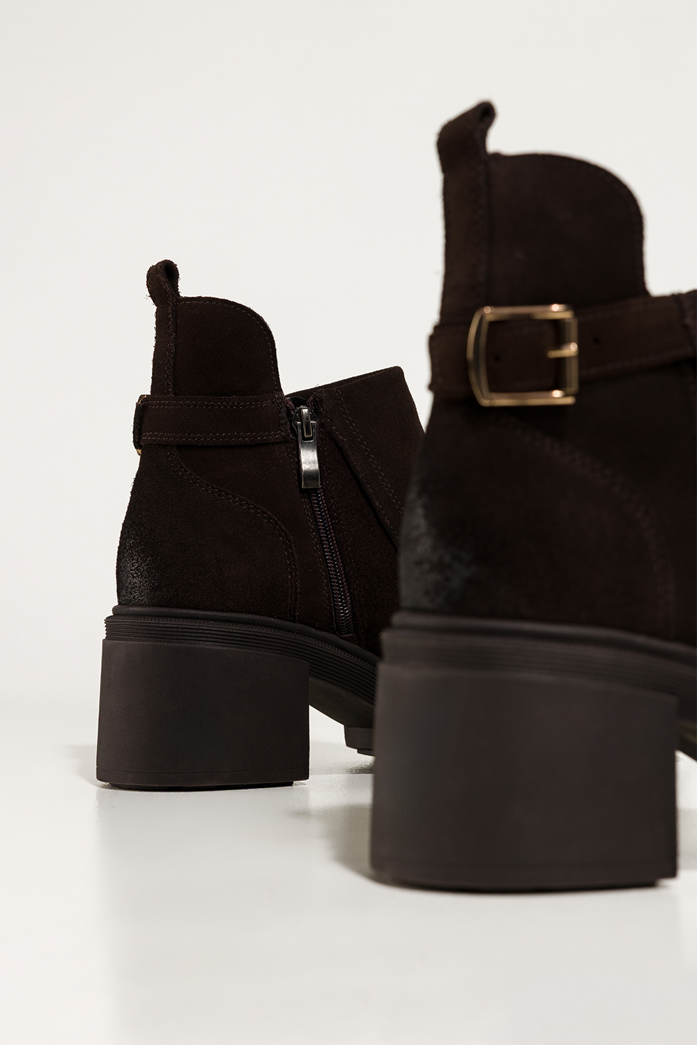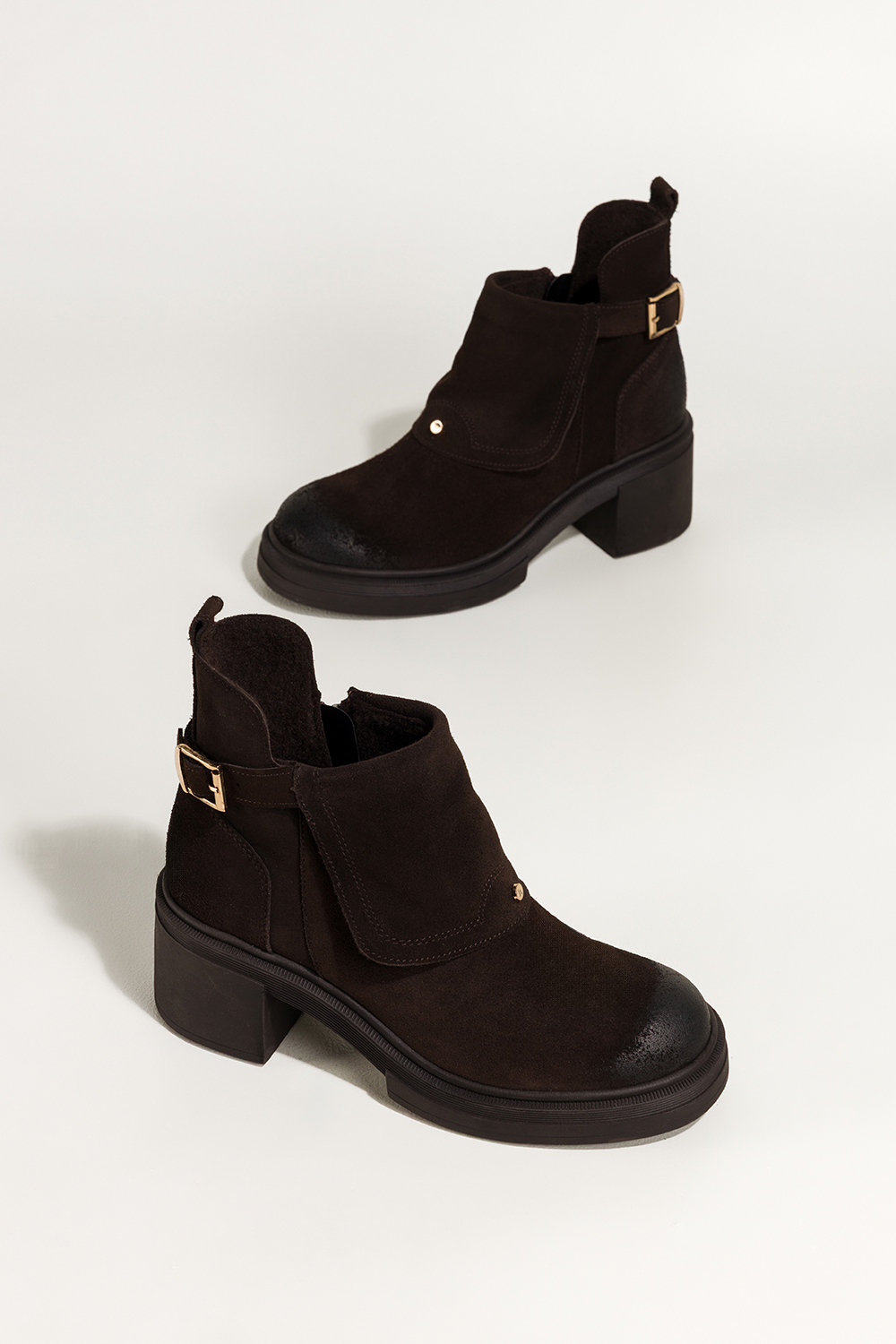 Czekoladowe botki skórzane damskie na platformie pasek ze złotą klamrą PRODUKT POLSKI Casu 8843