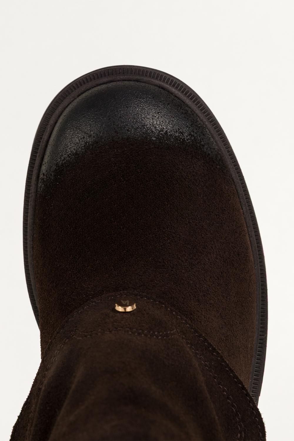 Czekoladowe botki skórzane damskie workery na bieżnikowanej platformie w cholewce guma pasek ze sta