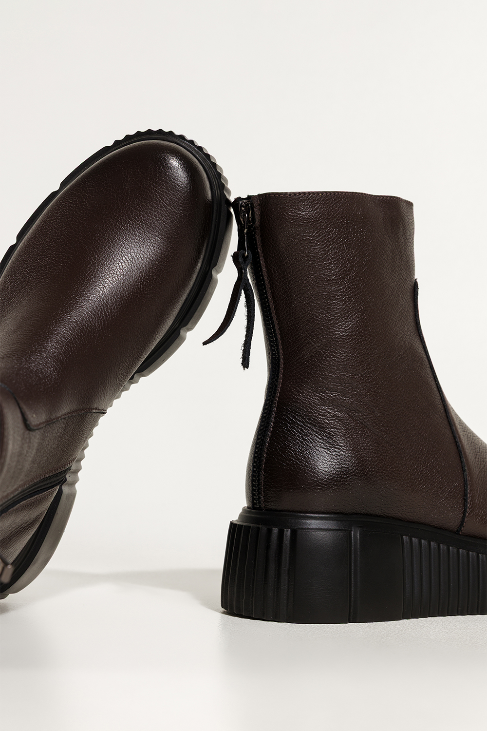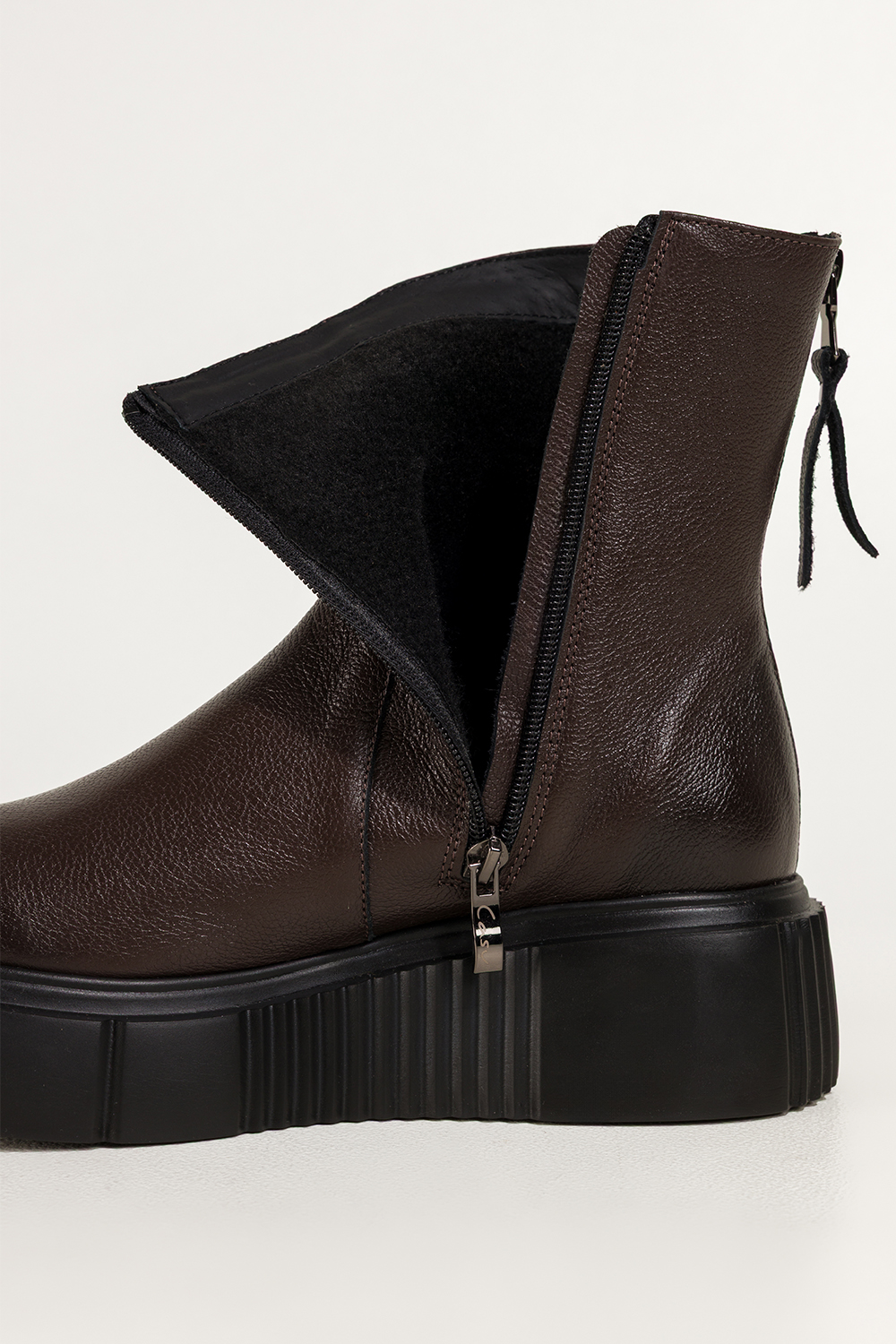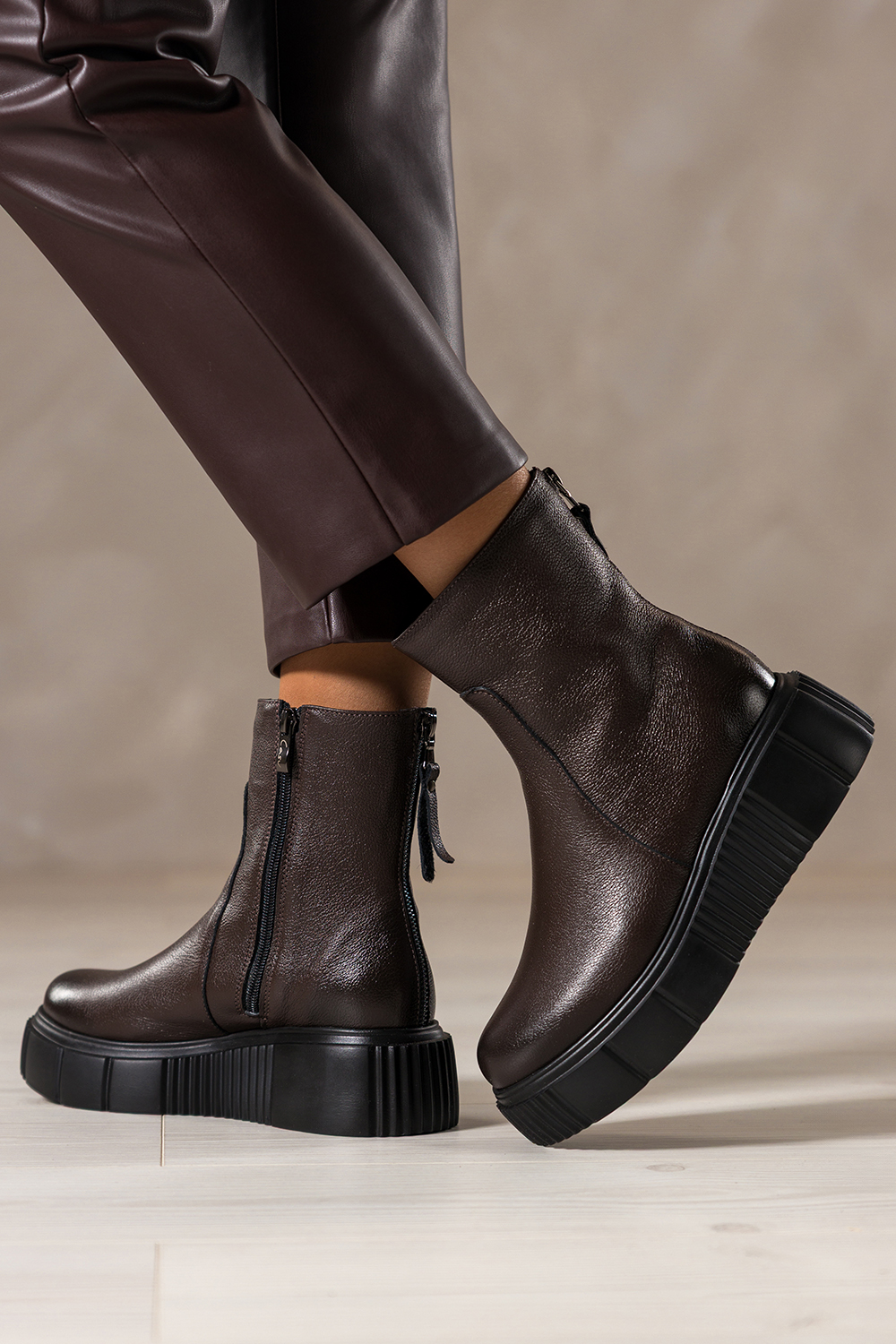 Czekoladowe botki skórzane damskie na żłobionej platformie z ozdobnym zamkiem z tyłu PRODUKT POLSKI