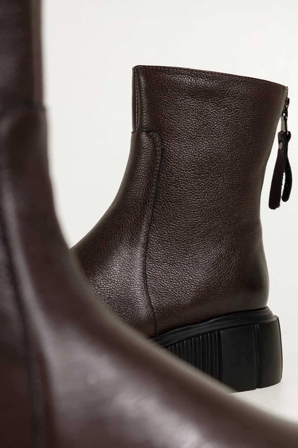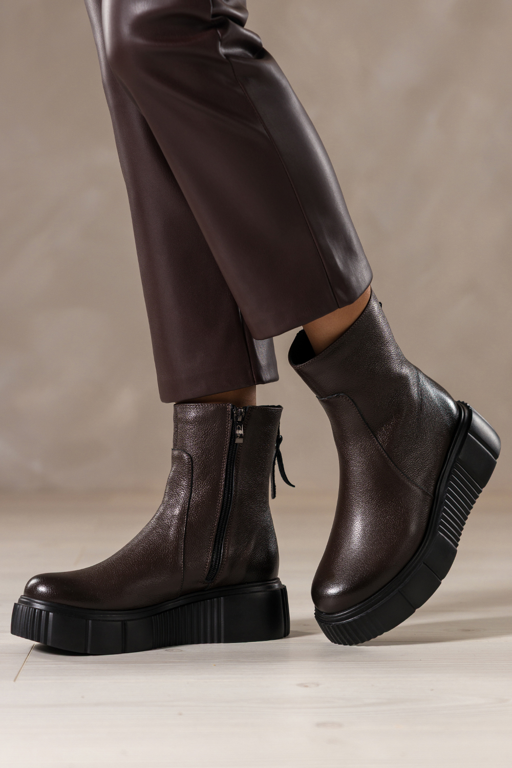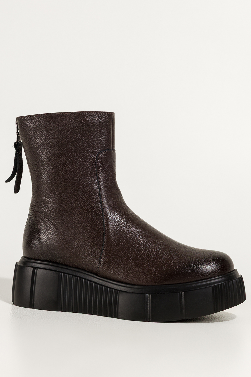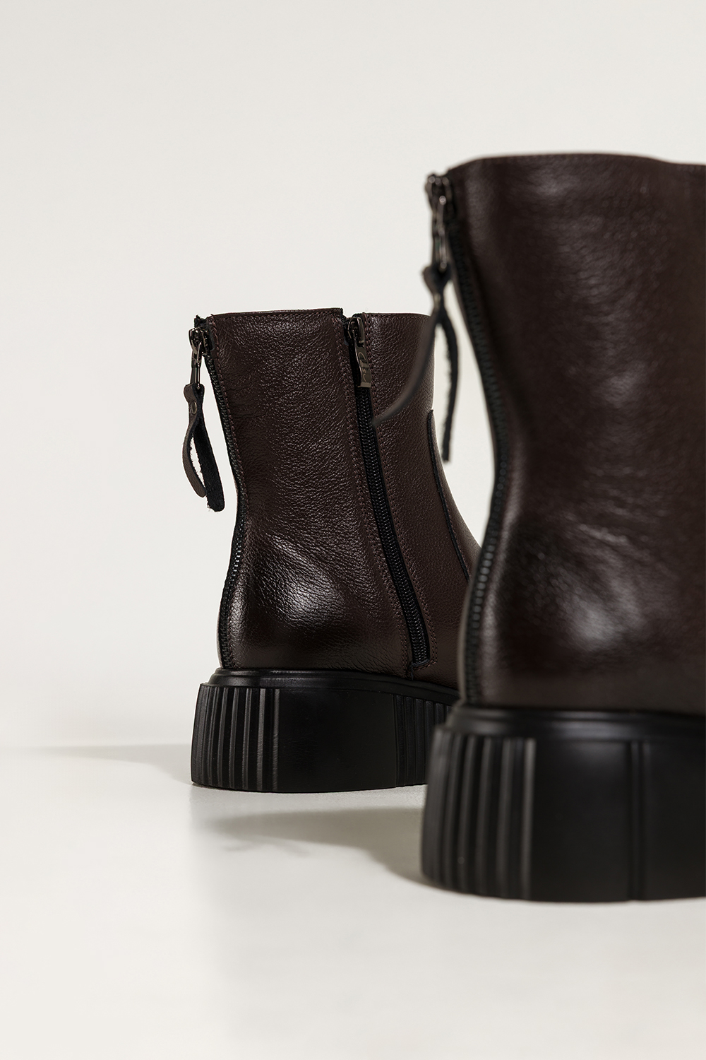 Czekoladowe botki skórzane damskie na żłobionej platformie z ozdobnym zamkiem z tyłu PRODUKT POLSKI