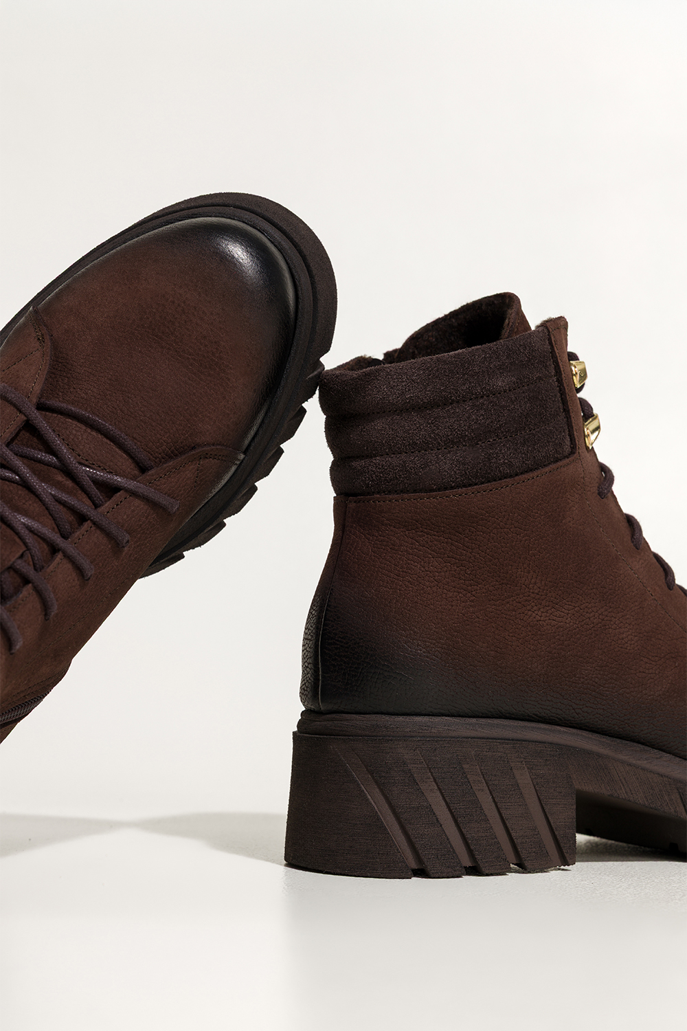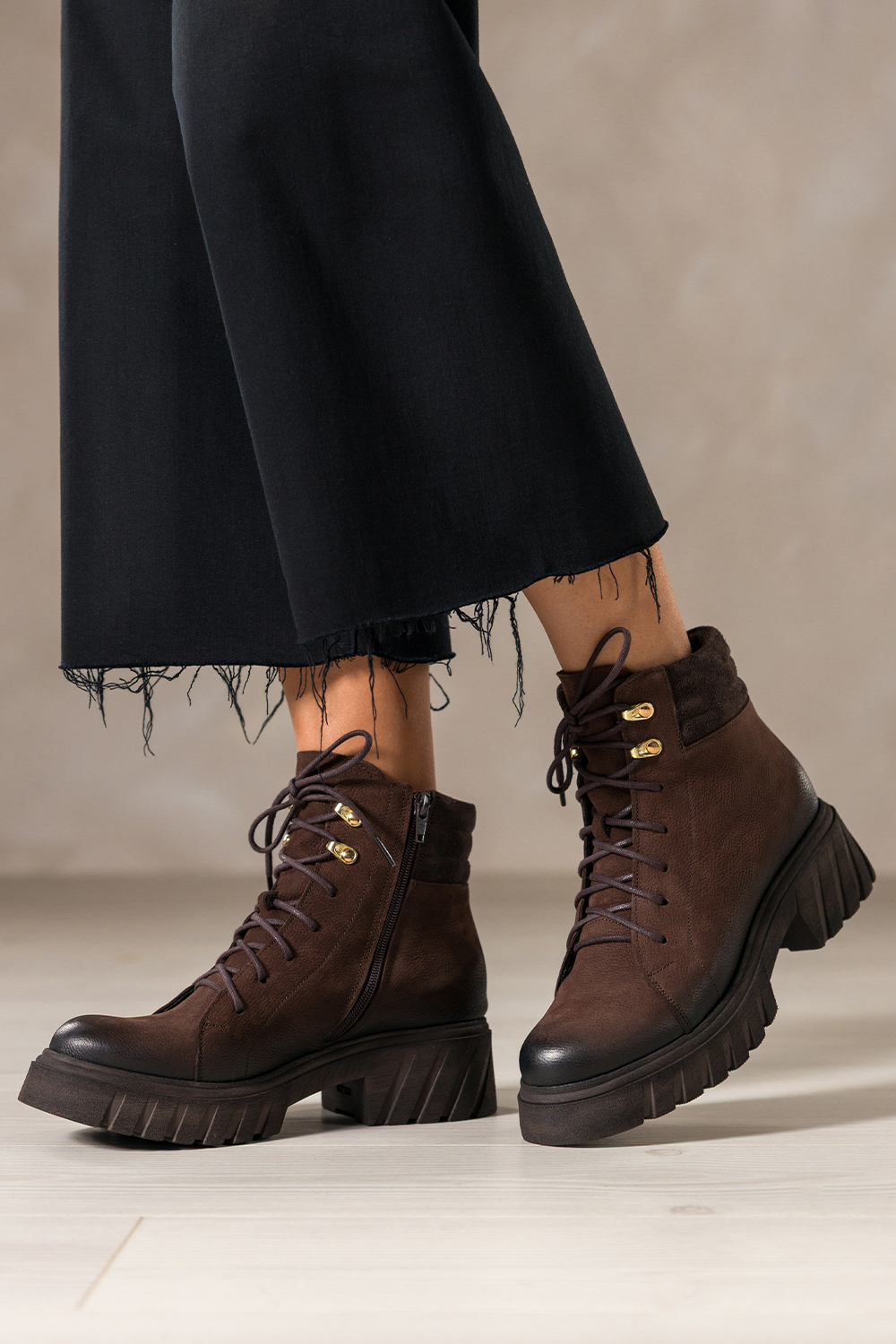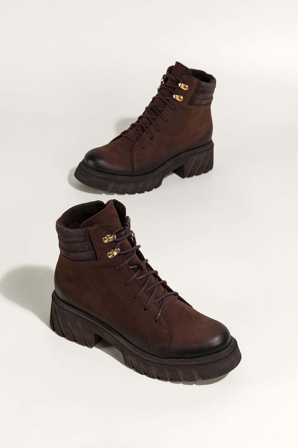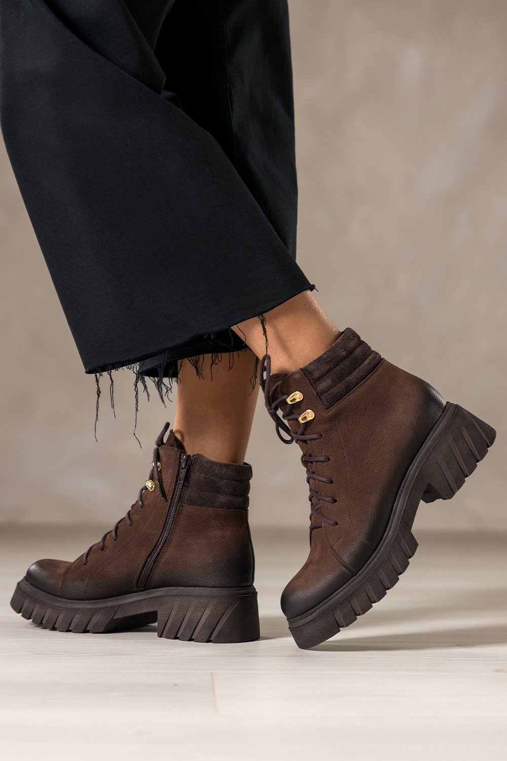 Czekoladowe botki skórzane damskie nubukowe na bieżnikowanej czekoladowej podeszwie sznurowane PRODUKT POLSKI Casu model 8097. Wykonane z wysokogatunkowej skóry nubukowej, zachwycają precyzyjnym wykończeniem i trwałością materiału. Ocieplenie kocem obuwniczym gwarantuje komfort termiczny nawet w najchłodniejsze dni, a solidna, bieżnikowana podeszwa zapewnia stabilność. Botki wyróżnia także perfekcyjne dopasowanie dzięki sznurowaniu z przodu oraz praktycznemu zamkowi bocznemu. Ich głęboki, czekoladowy odcień emanuje elegancją i ciepłem, a połączenie nubuku z zamszową częścią cholewką w tym samym kolorze dodaje głębi i charakteru każdej stylizacji. Zaokrąglony nosek dodaje lekkości sylwetce, a wysoka jakość materiałów pozwala nosić je zarówno na co dzień, jak i w bardziej formalnych sytuacjach. Świetnie komponują się z jeansami, dzianinową sukienką czy wełnianym płaszczem. Dzięki wewnętrznemu ociepleniu botki sprawdzą się doskonale w zimowe dni, chroniąc stopy przed zimnem. Gruba, bieżnikowana podeszwa amortyzuje każdy krok i ułatwia poruszanie się w trudnych warunkach pogodowych. Ich konstrukcja zapewnia stopie stabilność, nie rezygnując przy tym z kobiecego stylu. To idealny wybór dla kobiet ceniących funkcjonalne rozwiązania i modny design. Cechy wyróżniające Wysokogatunkowa skóra nubukowa i częściowo zamszowa cholewka Ocieplenie kocem obuwniczym Bieżnikowana, gruba podeszwa, lepsza przyczepność i komfort Zamek boczny i sznurowanie, idealne dopasowanie Uniwersalny, czekoladowy kolor pasujący do wielu stylizacji Produkt polski, gwarancja lokalnej jakości Zamów już dziś na stronie Casu. pl i odkryj, jak łatwo można połączyć modę z funkcjonalnością!