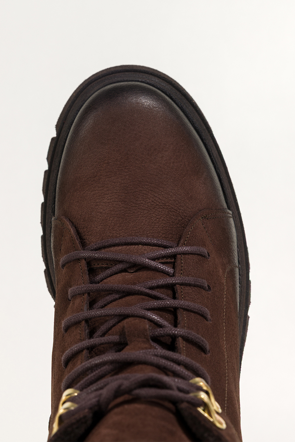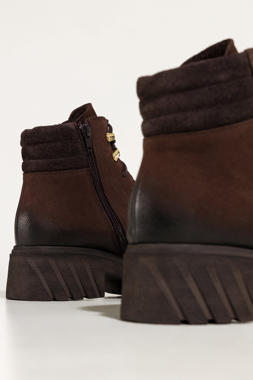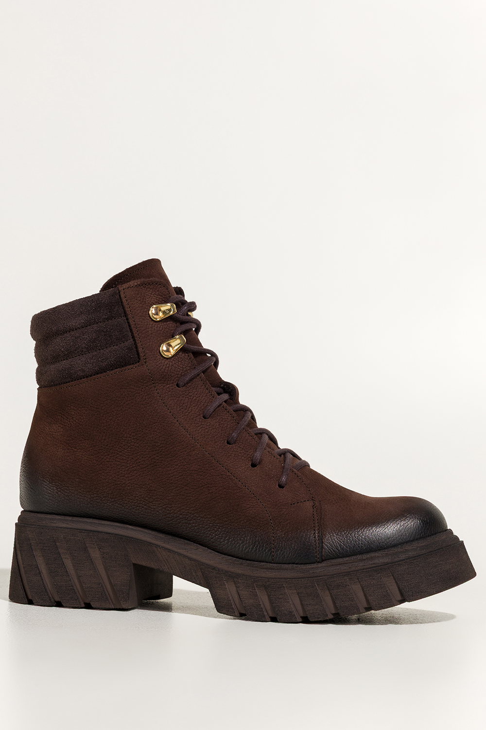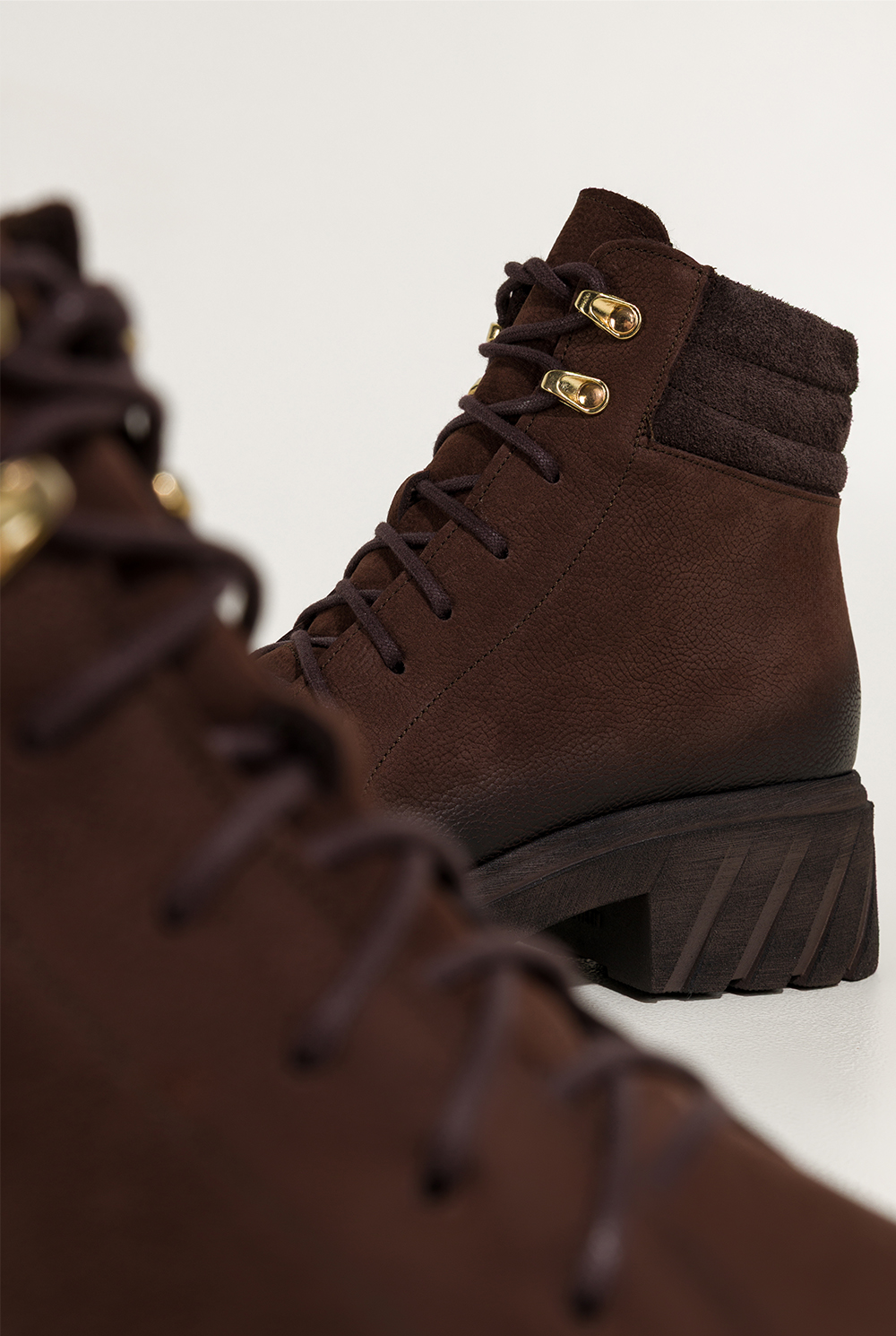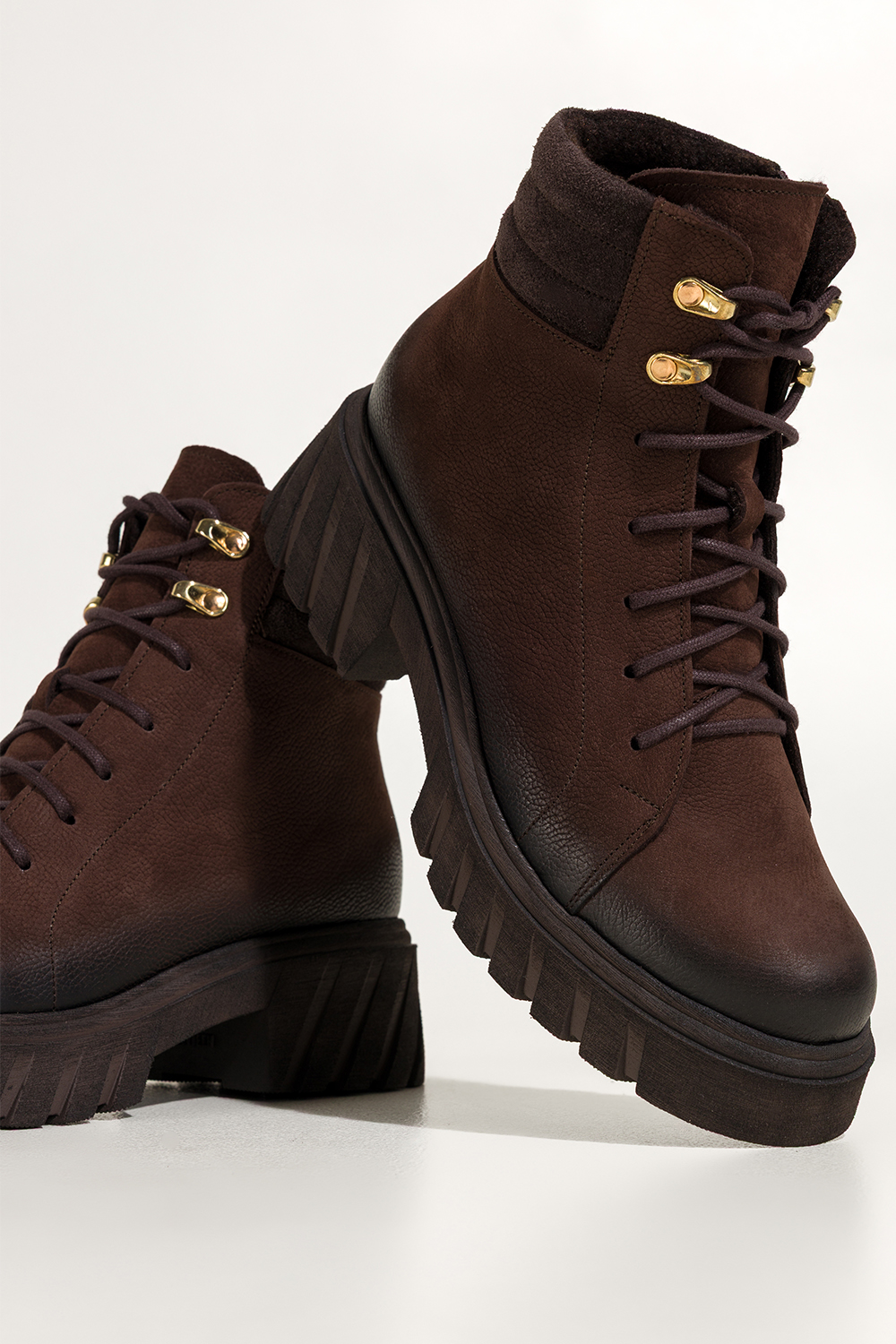 Czekoladowe botki skórzane damskie nubukowe na bieżnikowanej czekoladowej podeszwie sznurowane PRODUKT POLSKI Casu model 8097. Wykonane z wysokogatunkowej skóry nubukowej, zachwycają precyzyjnym wykończeniem i trwałością materiału. Ocieplenie kocem obuwniczym gwarantuje komfort termiczny nawet w najchłodniejsze dni, a solidna, bieżnikowana podeszwa zapewnia stabilność. Botki wyróżnia także perfekcyjne dopasowanie dzięki sznurowaniu z przodu oraz praktycznemu zamkowi bocznemu. Ich głęboki, czekoladowy odcień emanuje elegancją i ciepłem, a połączenie nubuku z zamszową częścią cholewką w tym samym kolorze dodaje głębi i charakteru każdej stylizacji. Zaokrąglony nosek dodaje lekkości sylwetce, a wysoka jakość materiałów pozwala nosić je zarówno na co dzień, jak i w bardziej formalnych sytuacjach. Świetnie komponują się z jeansami, dzianinową sukienką czy wełnianym płaszczem. Dzięki wewnętrznemu ociepleniu botki sprawdzą się doskonale w zimowe dni, chroniąc stopy przed zimnem. Gruba, bieżnikowana podeszwa amortyzuje każdy krok i ułatwia poruszanie się w trudnych warunkach pogodowych. Ich konstrukcja zapewnia stopie stabilność, nie rezygnując przy tym z kobiecego stylu. To idealny wybór dla kobiet ceniących funkcjonalne rozwiązania i modny design. Cechy wyróżniające Wysokogatunkowa skóra nubukowa i częściowo zamszowa cholewka Ocieplenie kocem obuwniczym Bieżnikowana, gruba podeszwa, lepsza przyczepność i komfort Zamek boczny i sznurowanie, idealne dopasowanie Uniwersalny, czekoladowy kolor pasujący do wielu stylizacji Produkt polski, gwarancja lokalnej jakości Zamów już dziś na stronie Casu. pl i odkryj, jak łatwo można połączyć modę z funkcjonalnością!