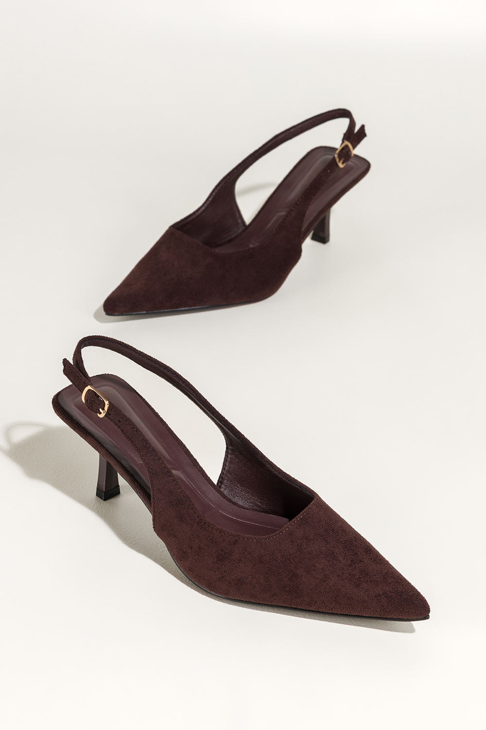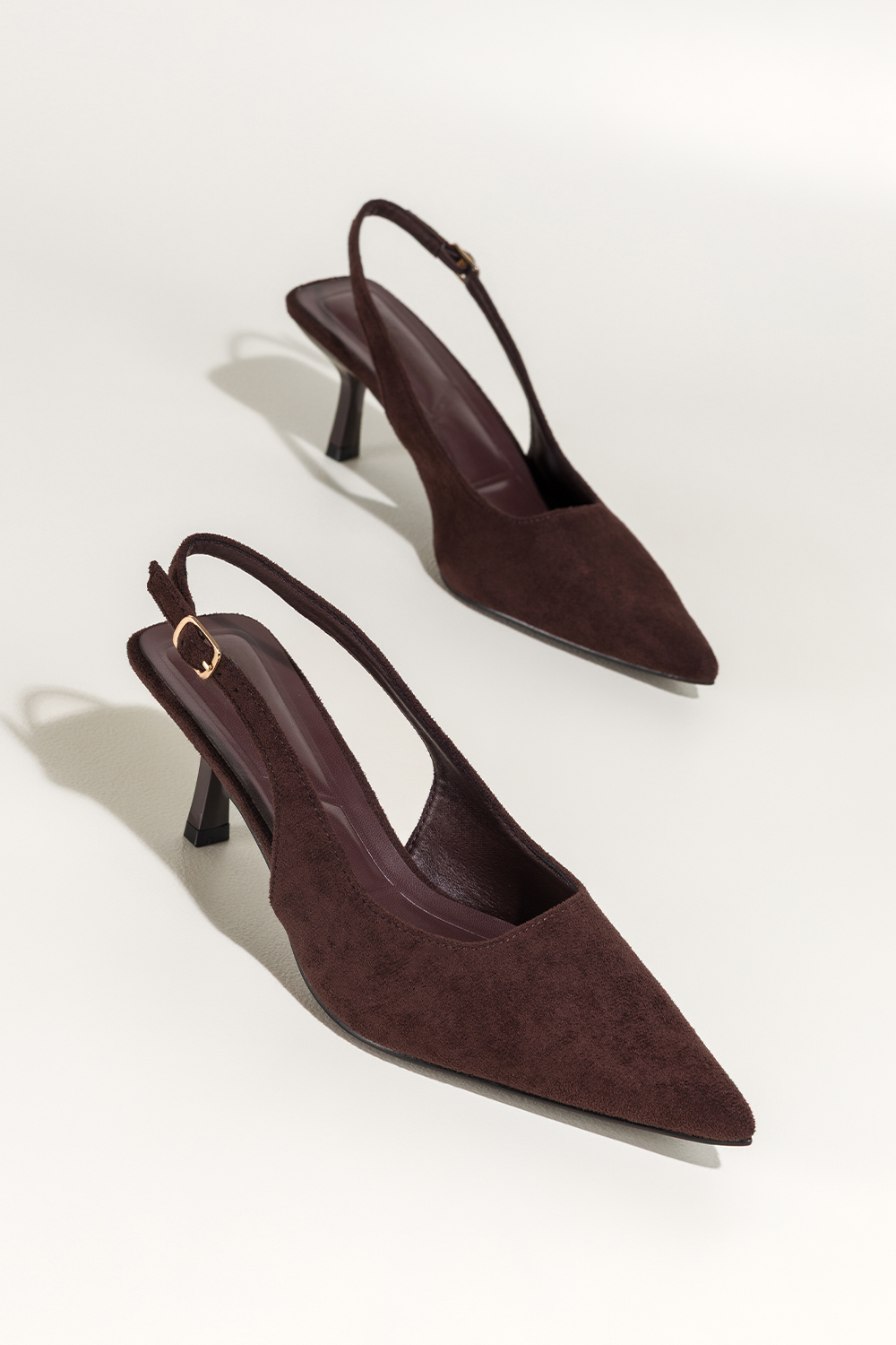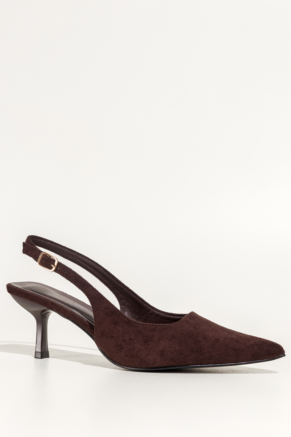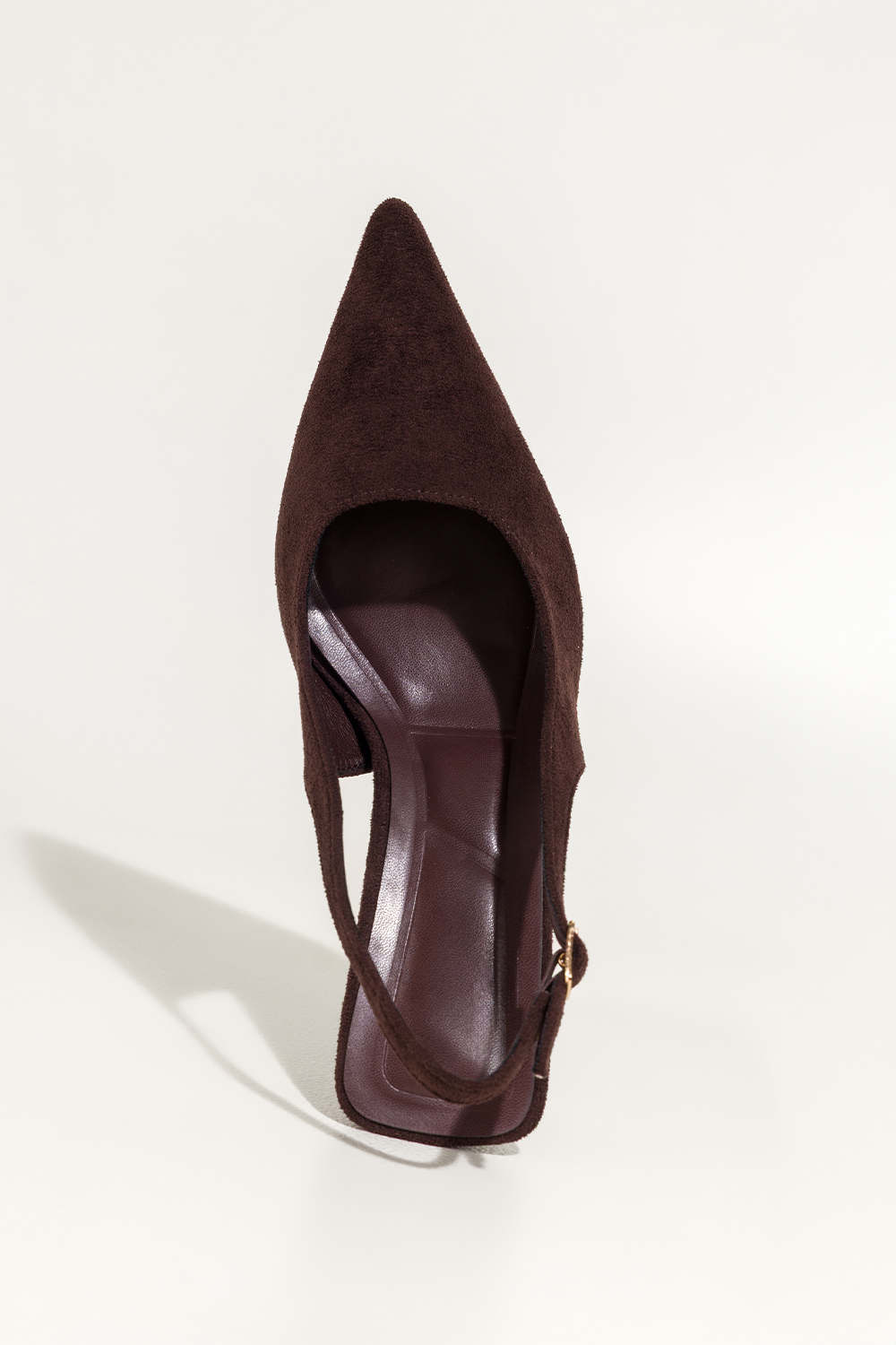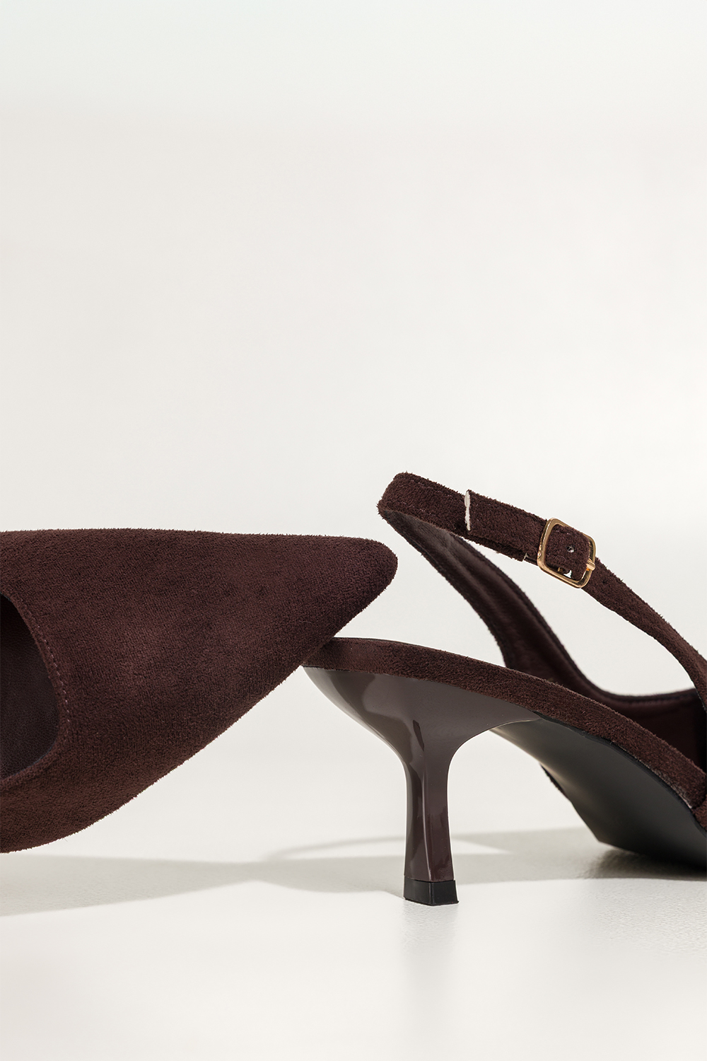 Czekoladowe czółenka damskie szpilki z odkrytą piętą obcas kieliszek pasek z elastyczna gumą Carla