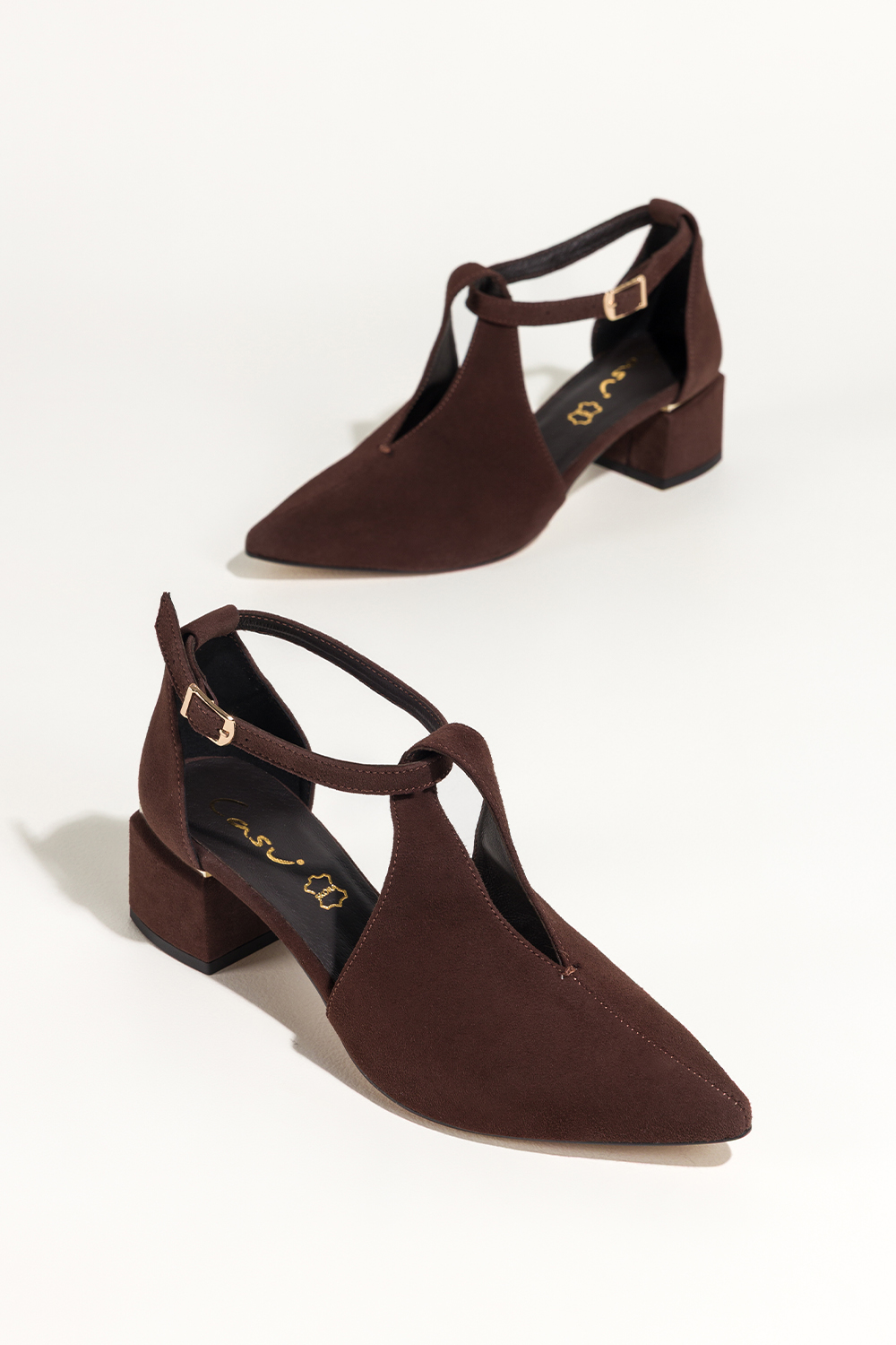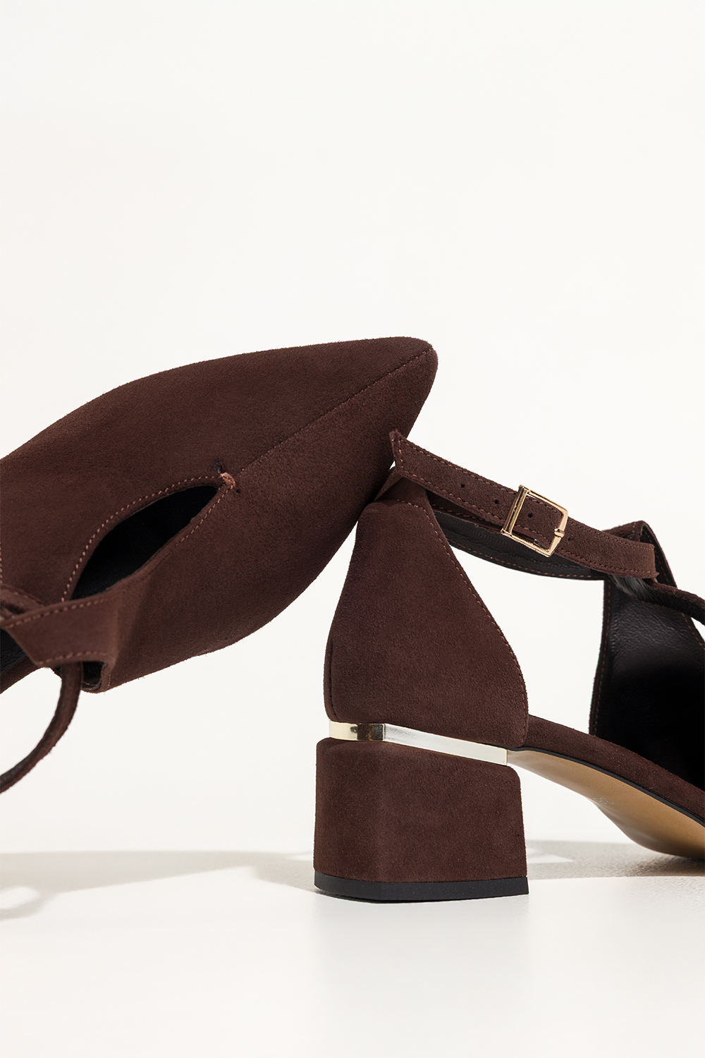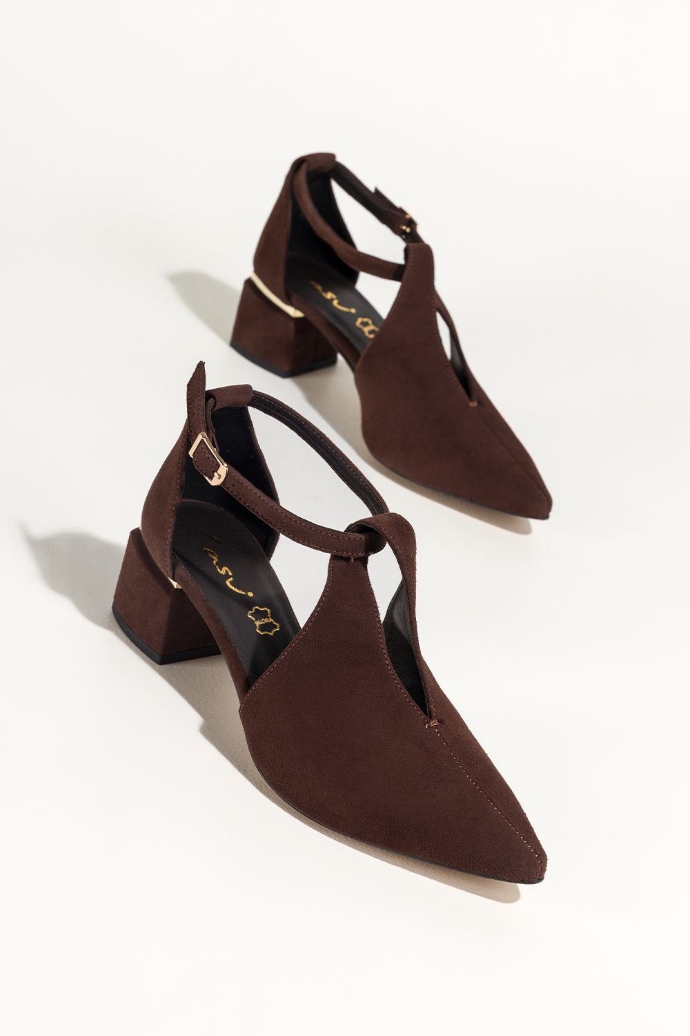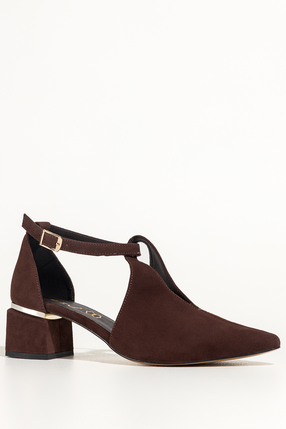 Czekoladowe czółenka skórzane damskie na ozdobnym klocku pasek wokół kostki PRODUKT POLSKI Casu 769