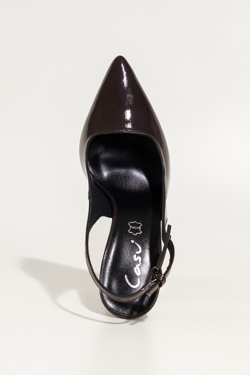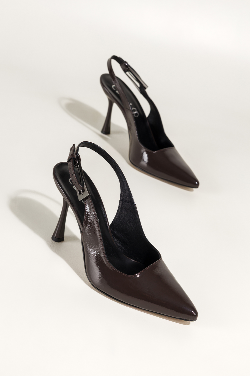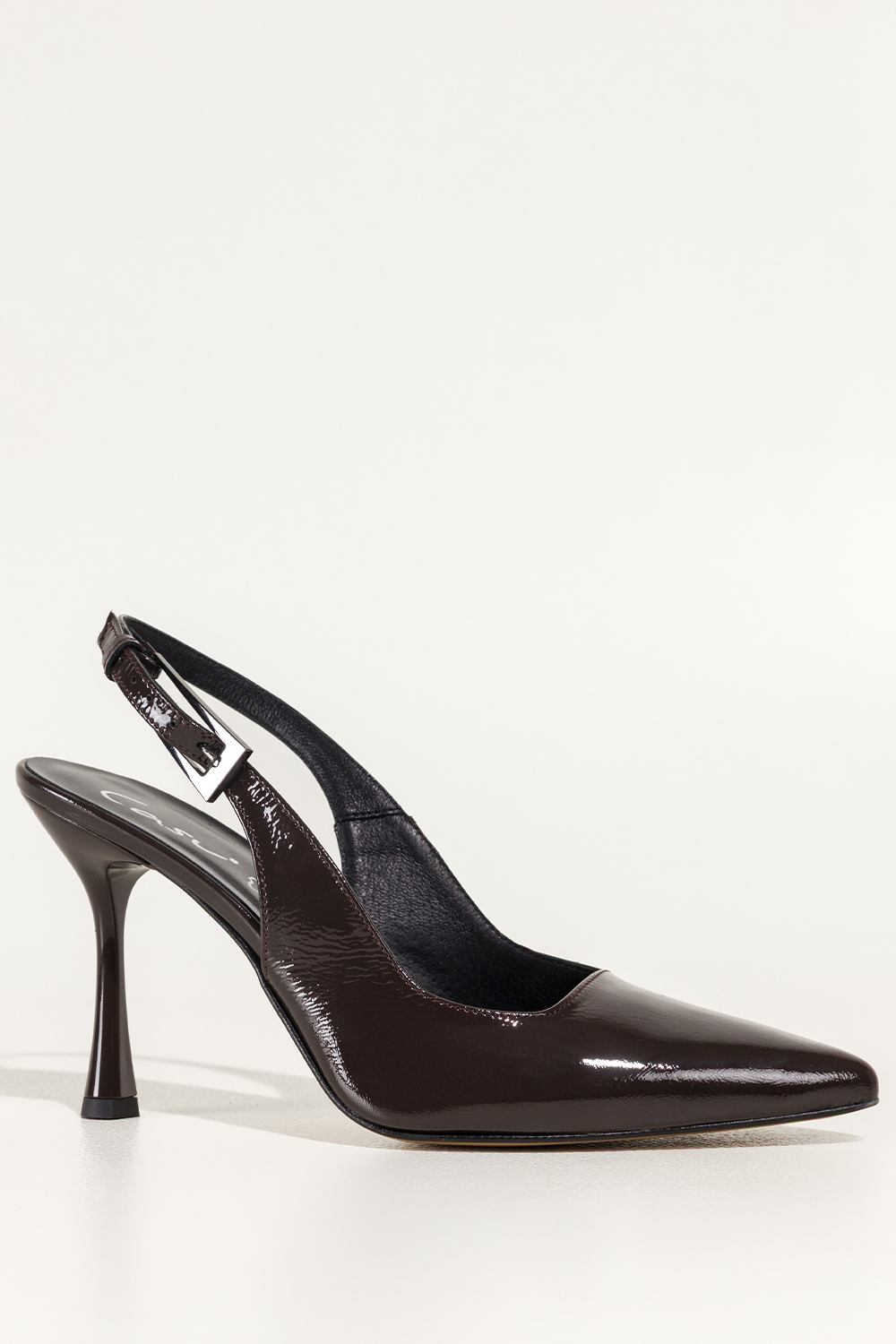 Czekoladowe czółenka skórzane damskie szpilki lakierowane z odkrytą piętą obcas kieliszek PRODUKT P