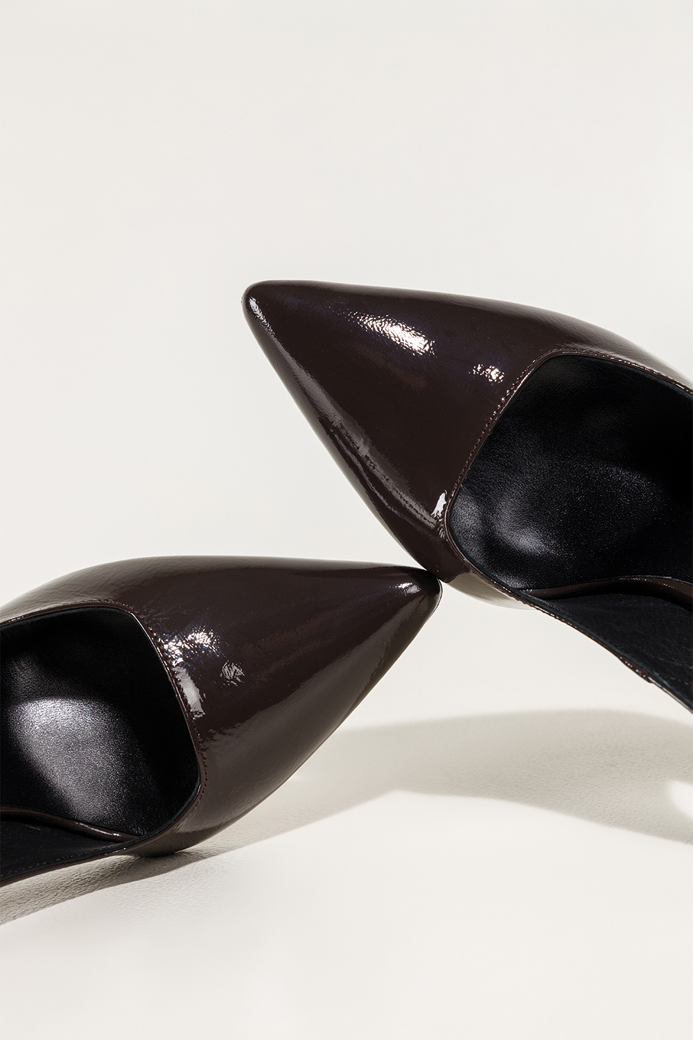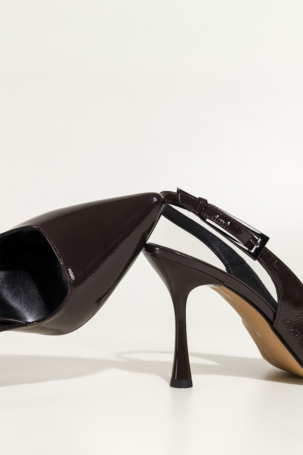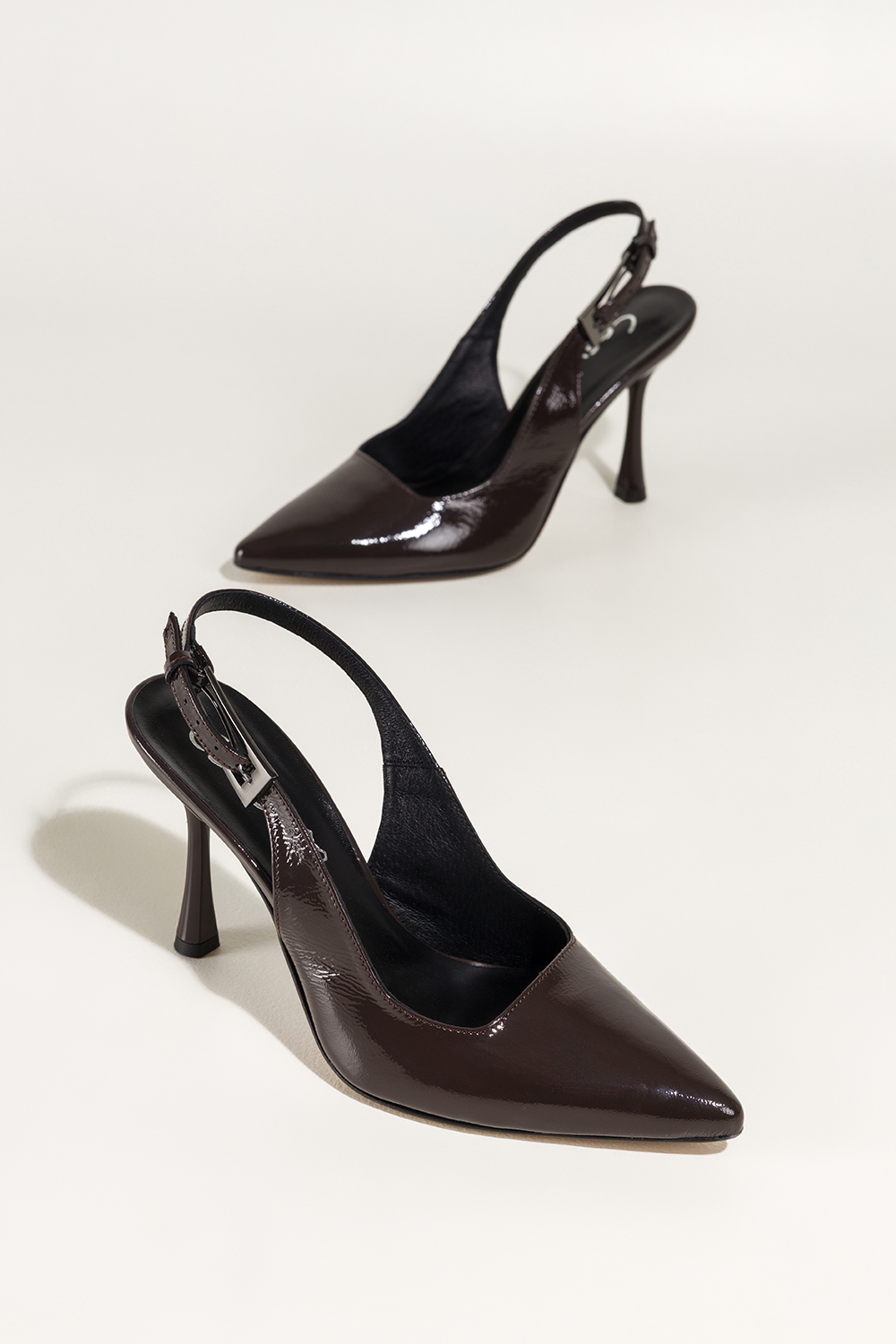 Czekoladowe czółenka skórzane damskie szpilki lakierowane z odkrytą piętą obcas kieliszek PRODUKT P