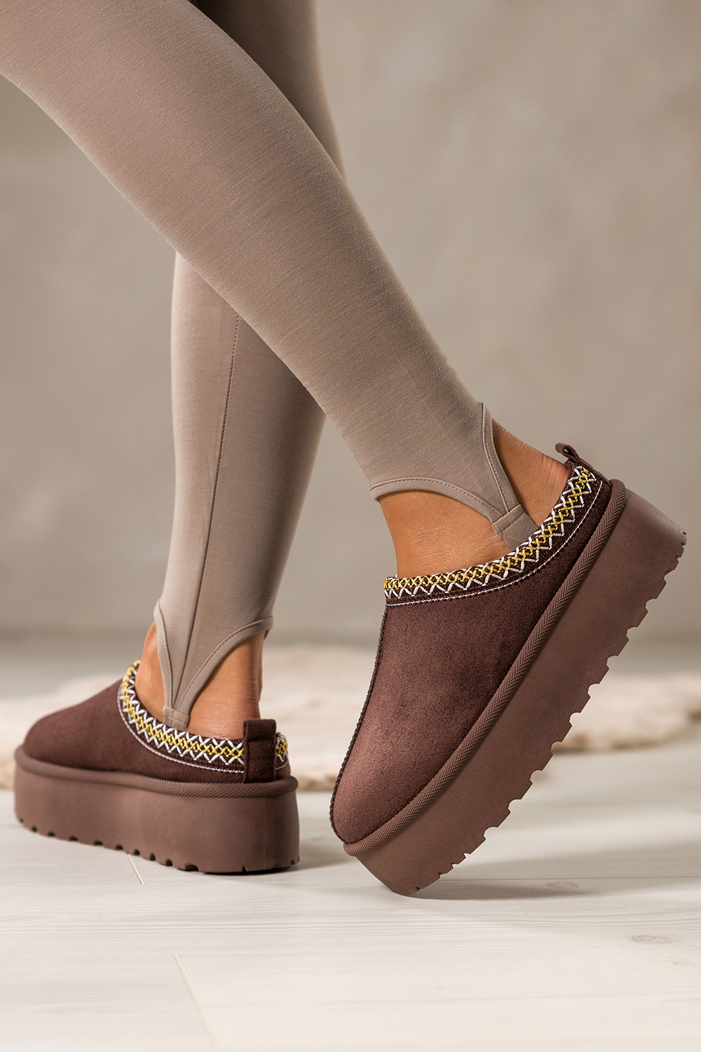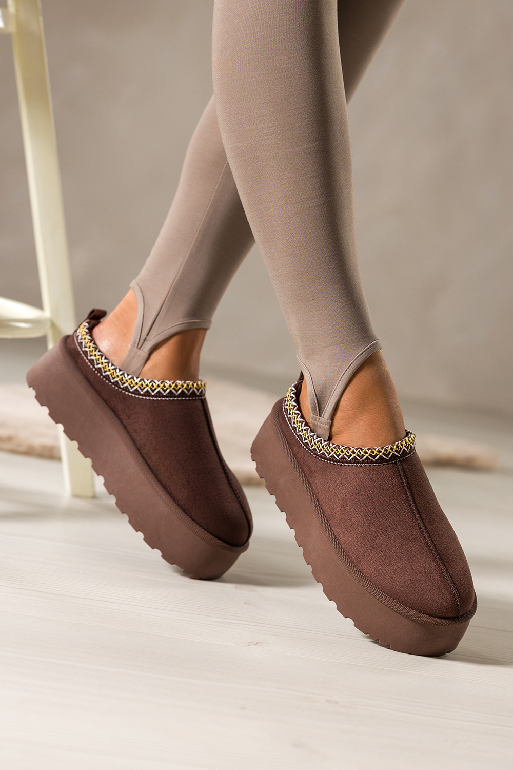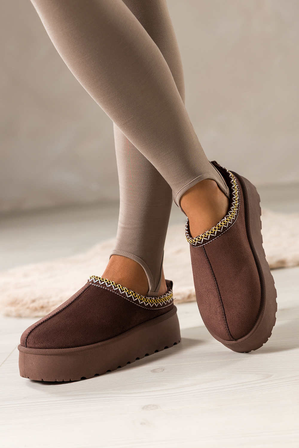 Czekoladowe kapcie damskie z futerkiem na platformie ozdobne obszycie Casu YL-810