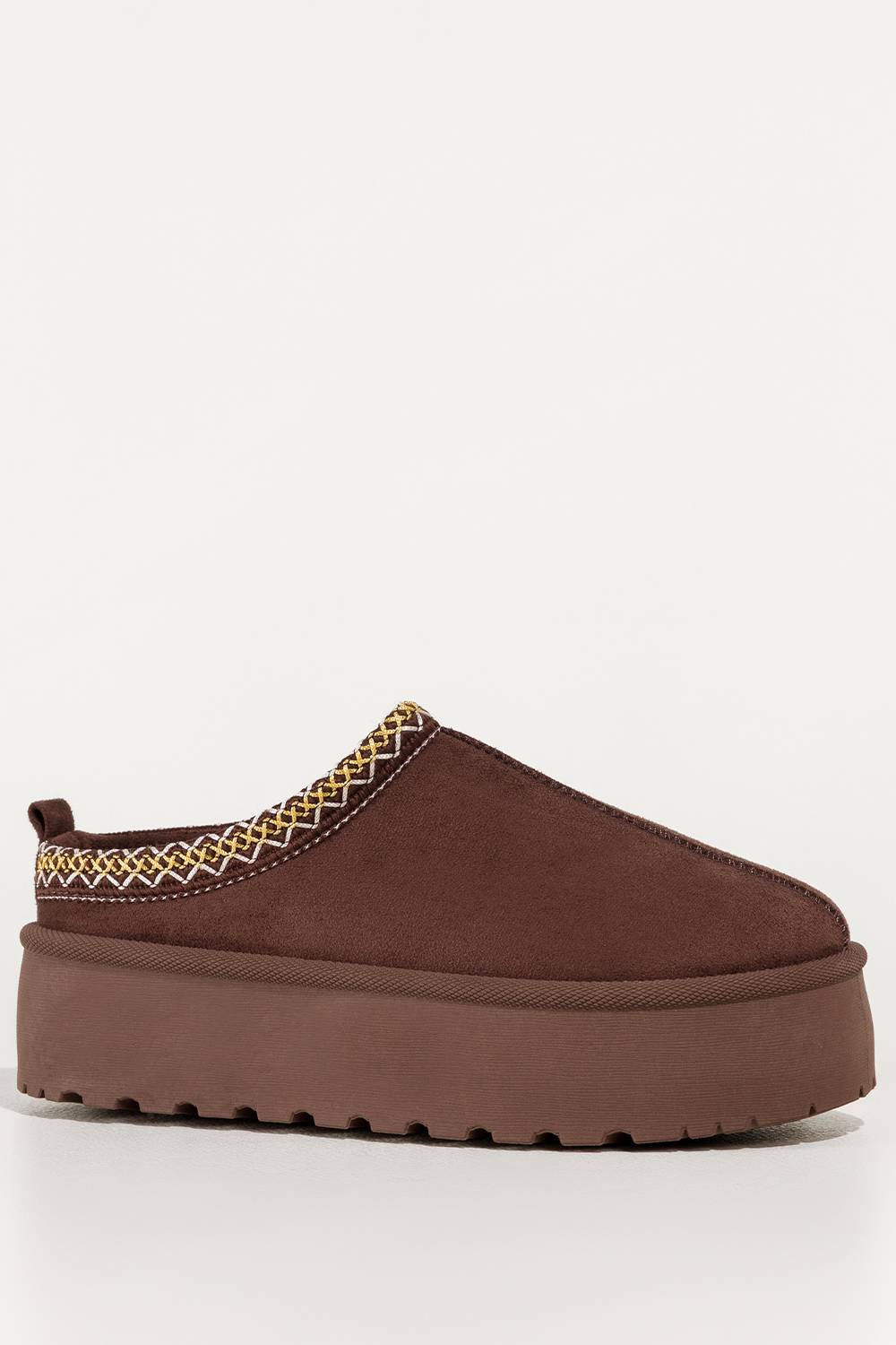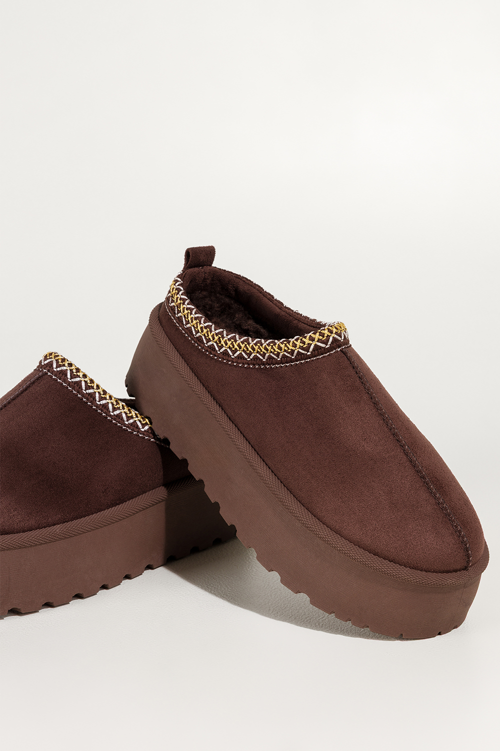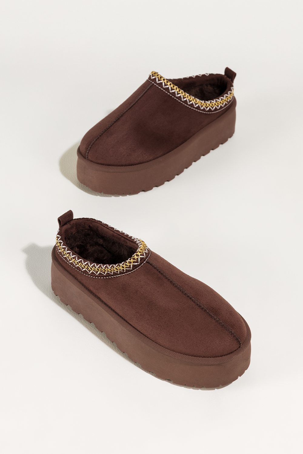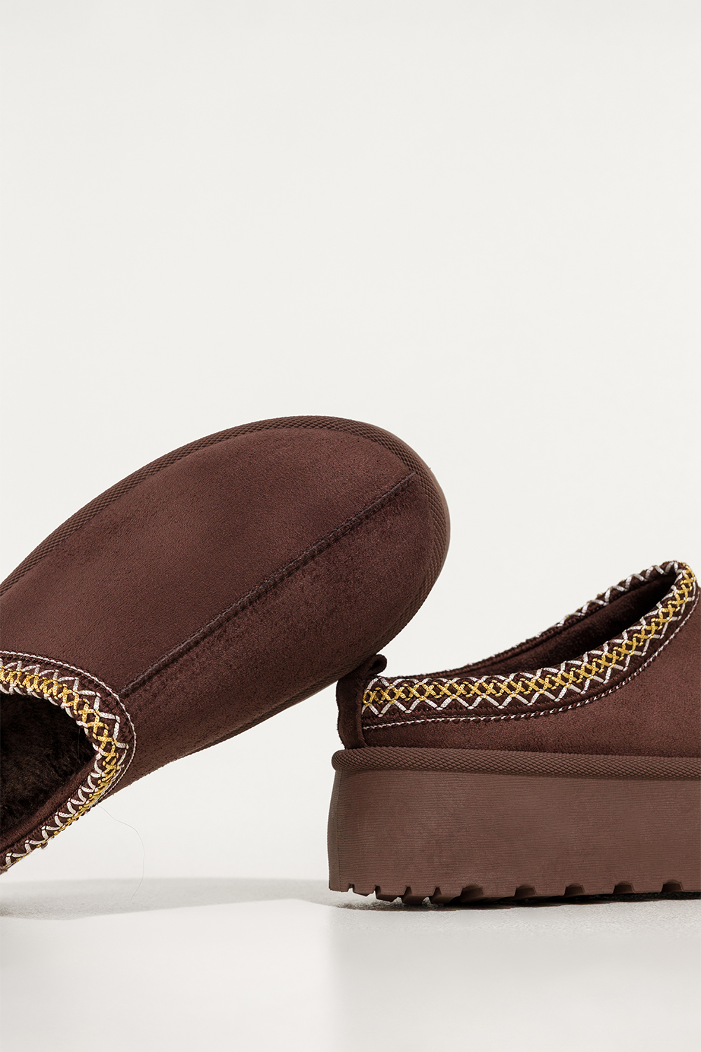 Czekoladowe kapcie damskie z futerkiem na platformie ozdobne obszycie Casu YL-810