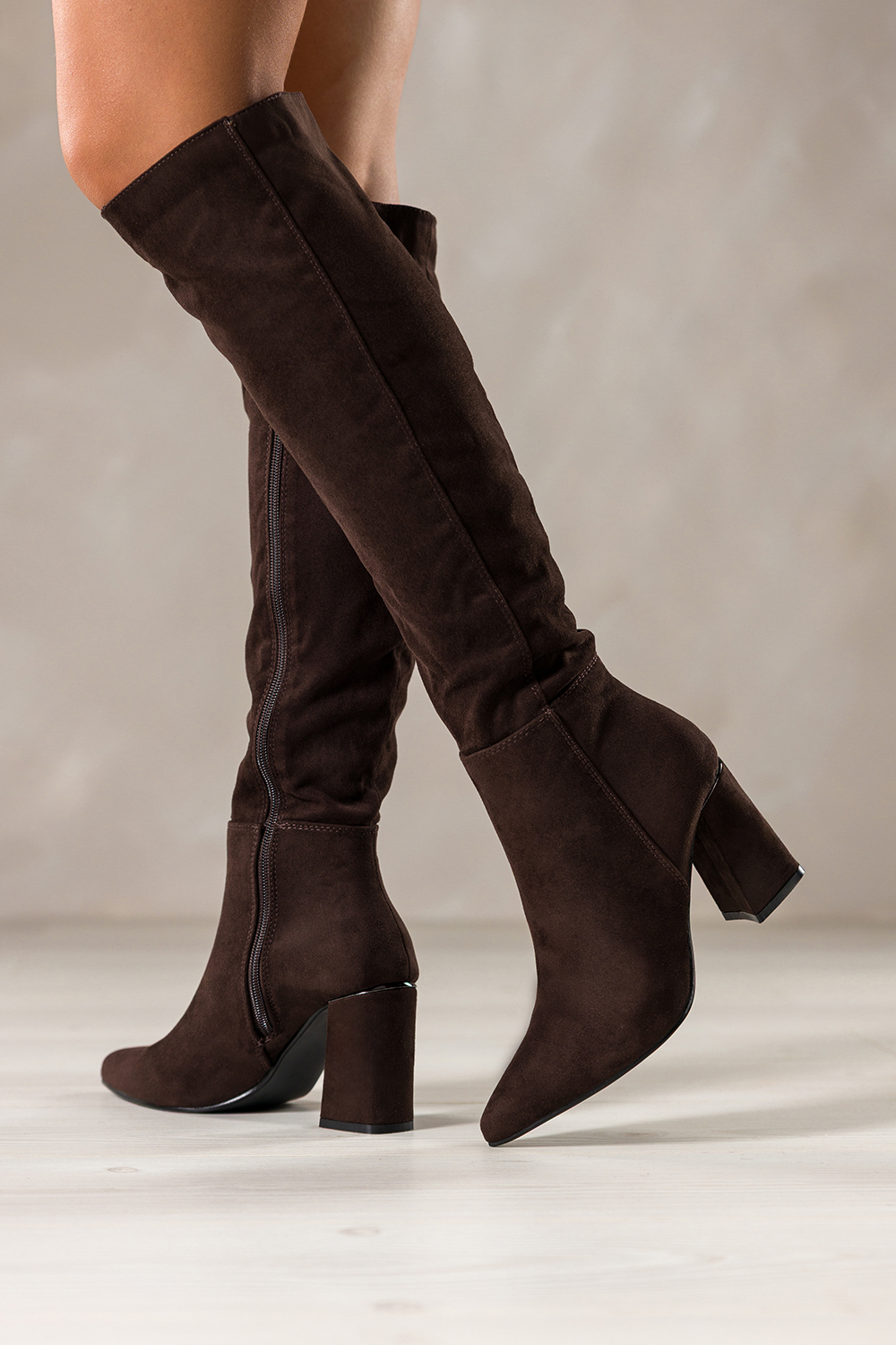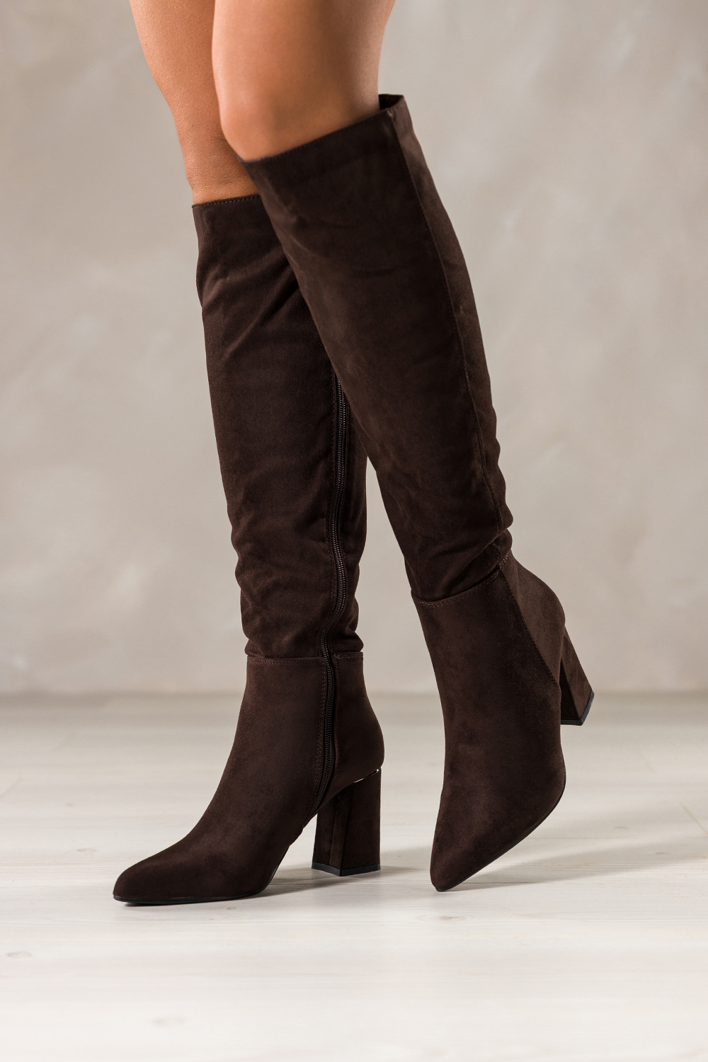 Czekoladowe kozaki damskie na szerokim ozdobnym słupku guma w cholewce Casu D25WX5-BR