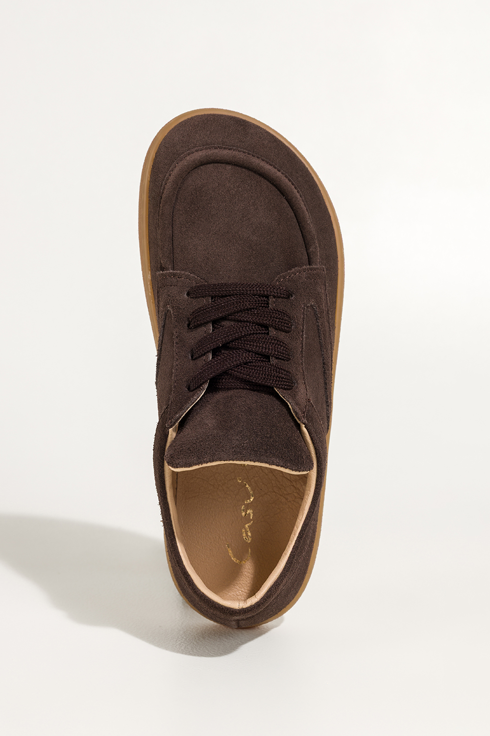 Czekoladowe półbuty barefoot skórzane zamszowe damskie szerokie na elastycznej płaskiej podeszwie s