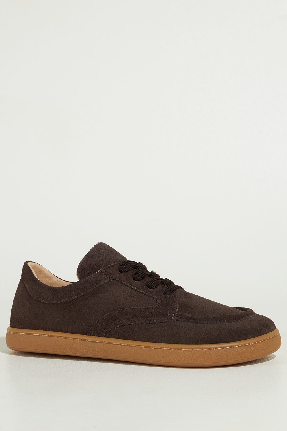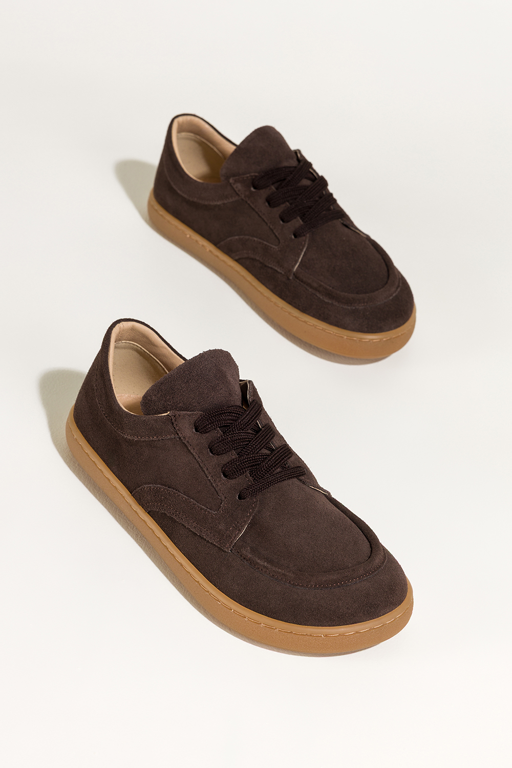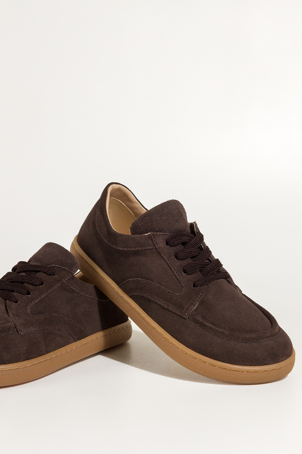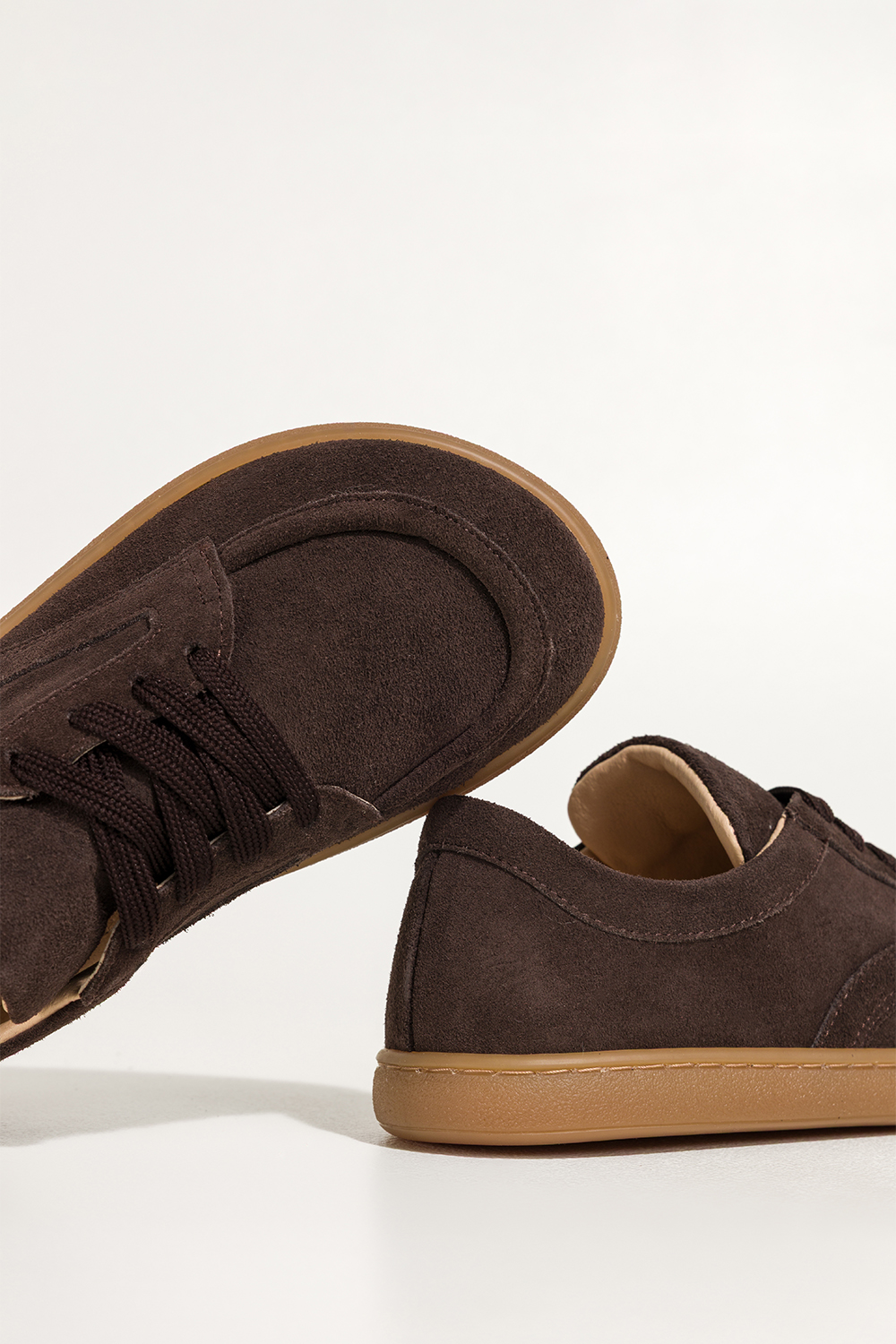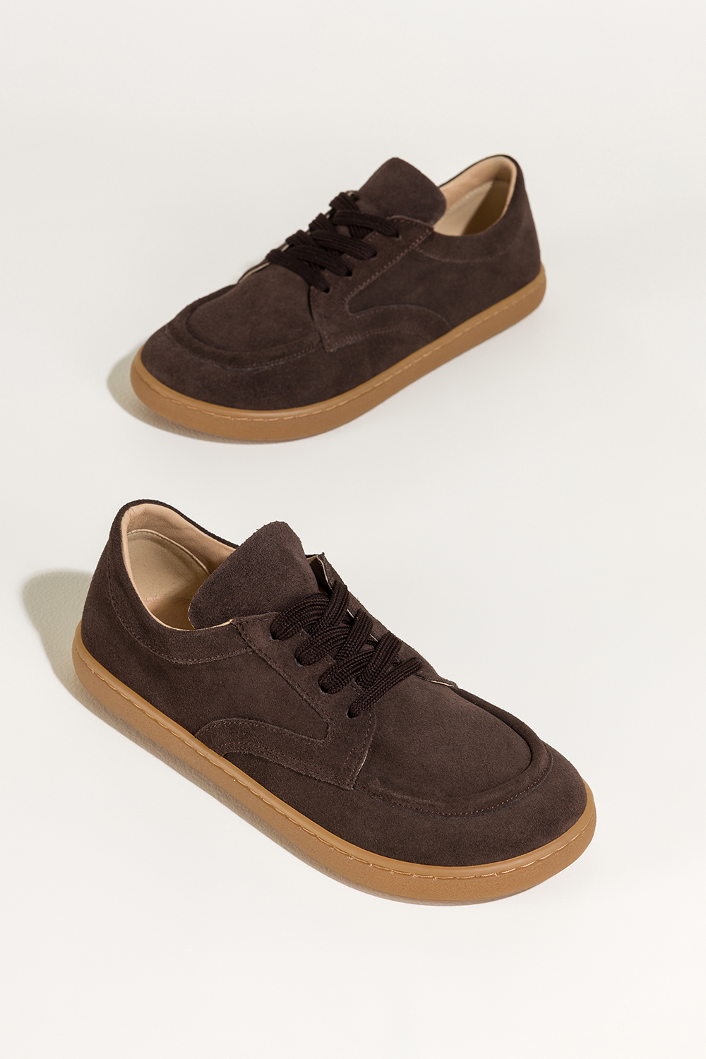 Brązowe półbuty barefoot skórzane zamszowe damskie szerokie na elastycznej płaskiej podeszwie sznur
