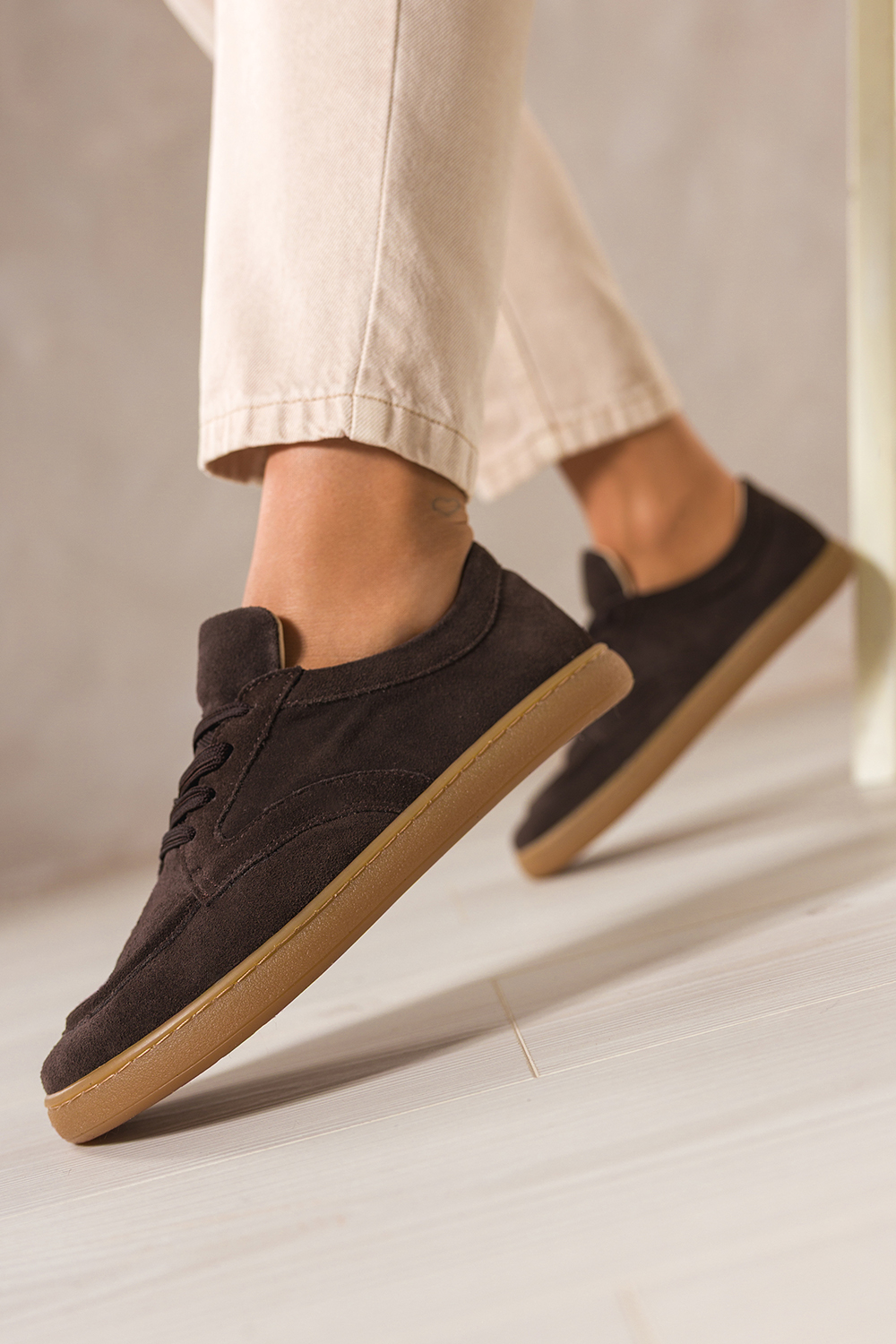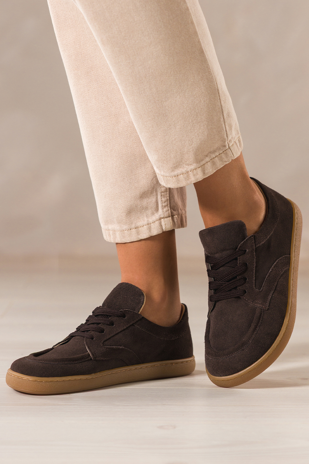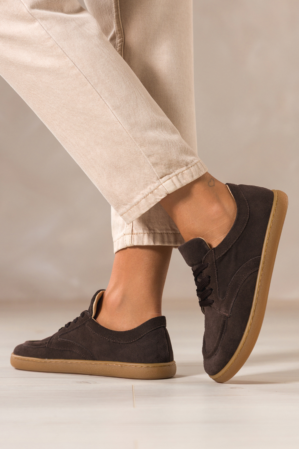 Czekoladowe buty barefoot skórzane zamszowe damskie szerokie na elastycznej płaskiej podeszwie pusz