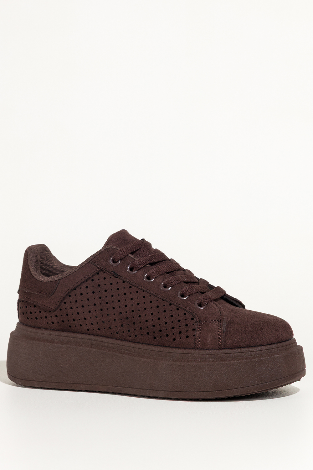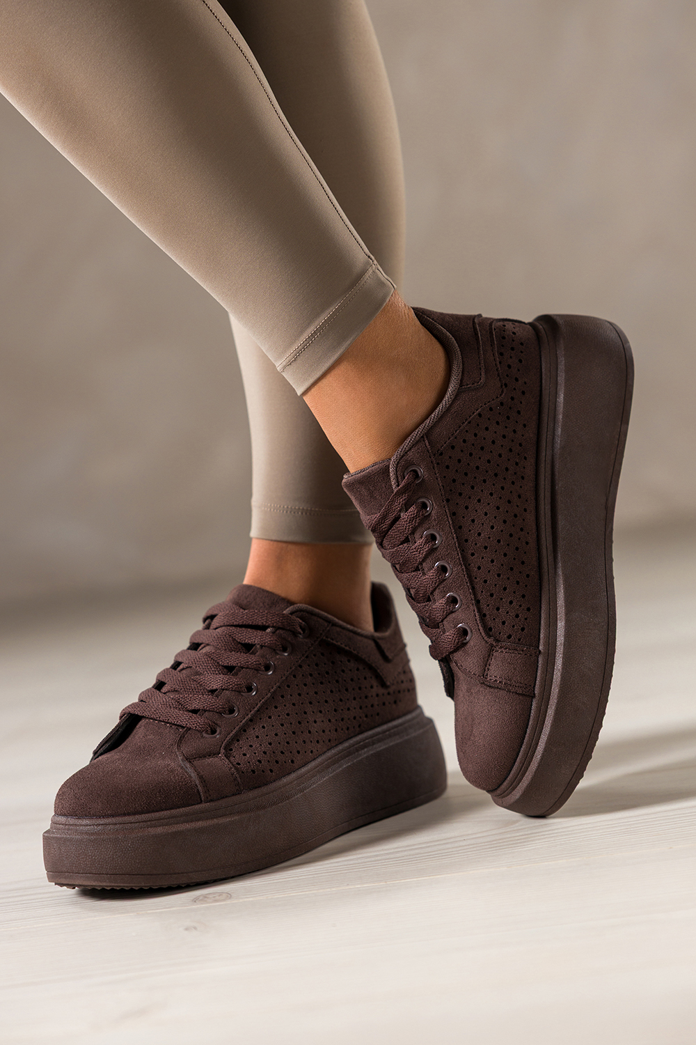 Czekoladowe sneakersy damskie buty sportowe ażurowe na platformie sznurowane Carla YO349K