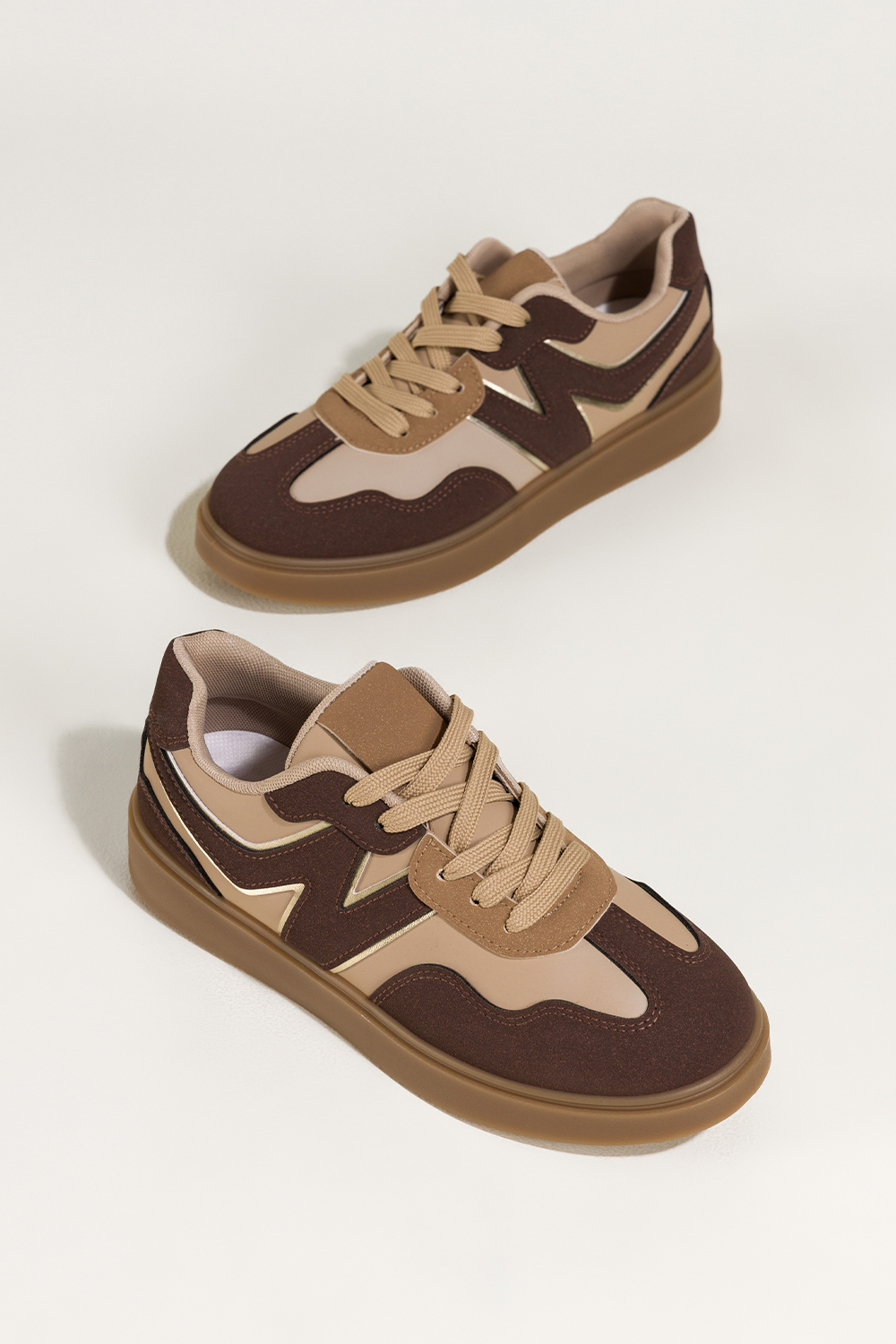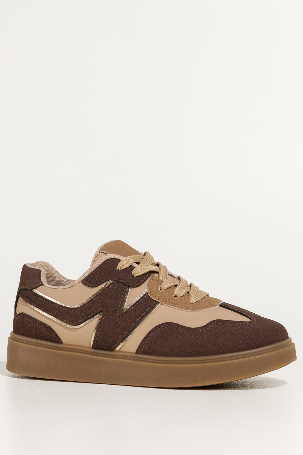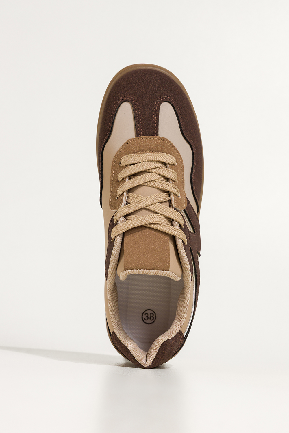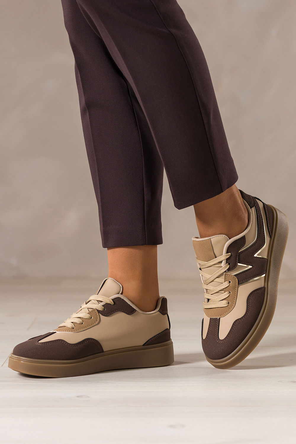 Czekoladowe sneakersy damskie buty sportowe na beżowej platformie beżowe wstawki sznurowane Casu 08