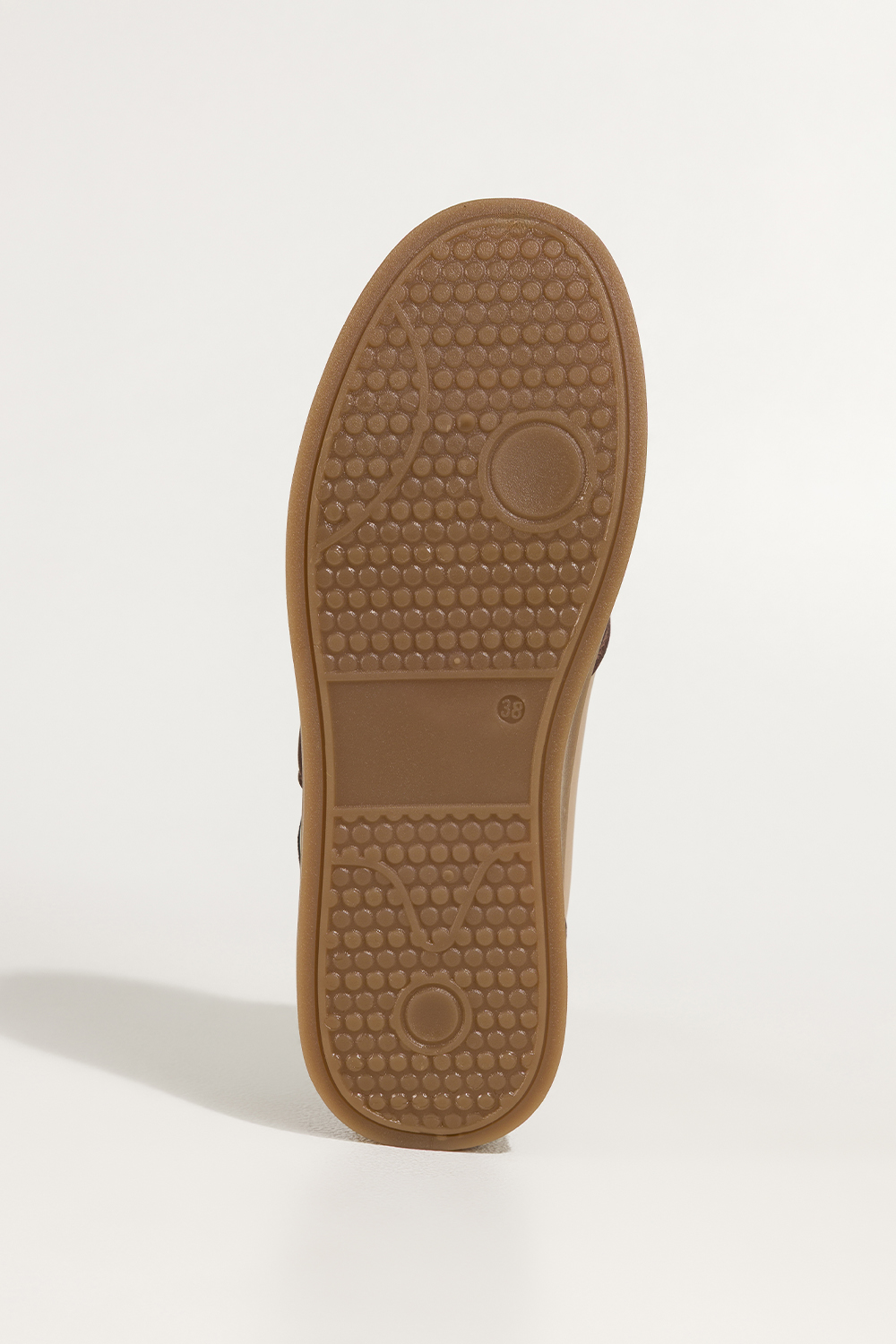 Camelowe sneakersy damskie buty sportowe na kremowej platformie elastyczne sznurówki złota ozdoba s