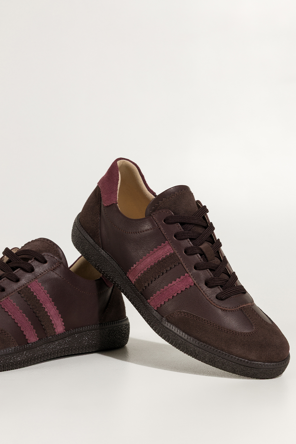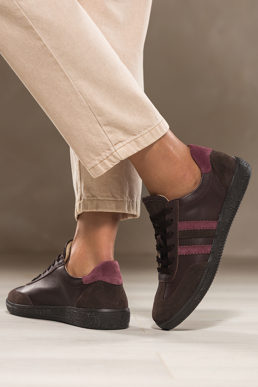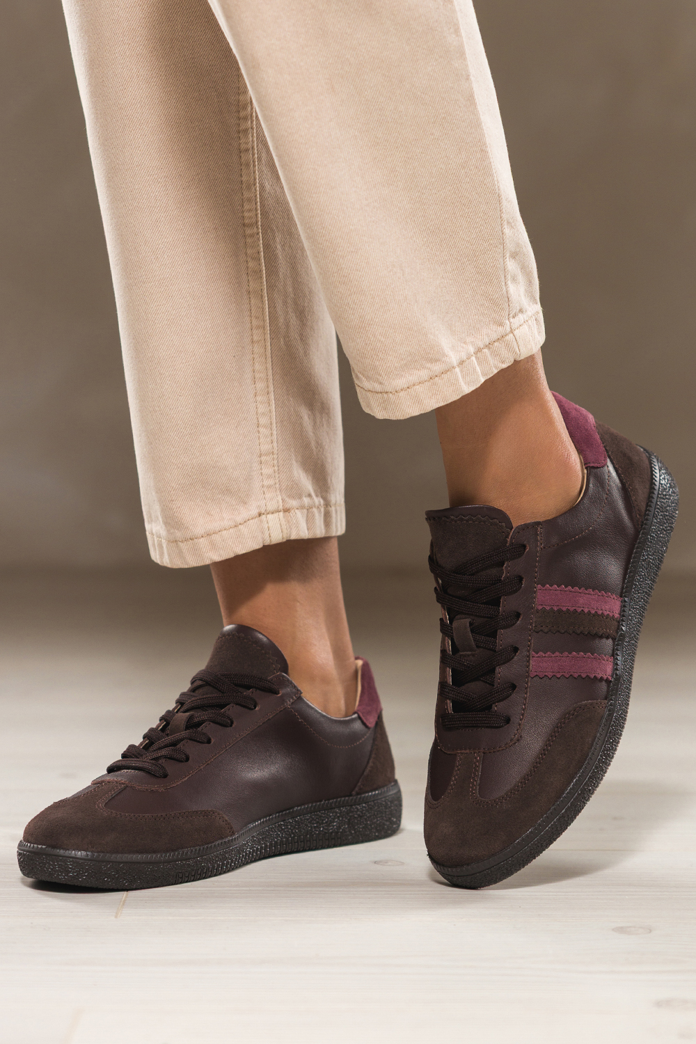 Czekoladowe sneakersy skórzane damskie buty sportowe na elastycznej podeszwie bordowe wstawki sznur