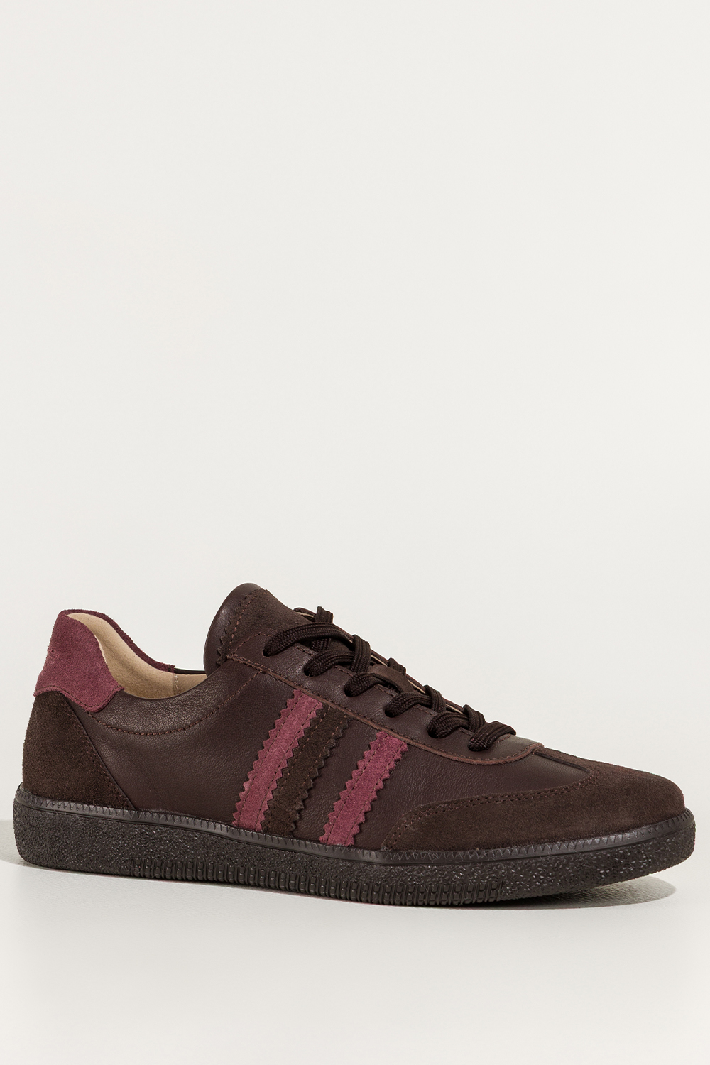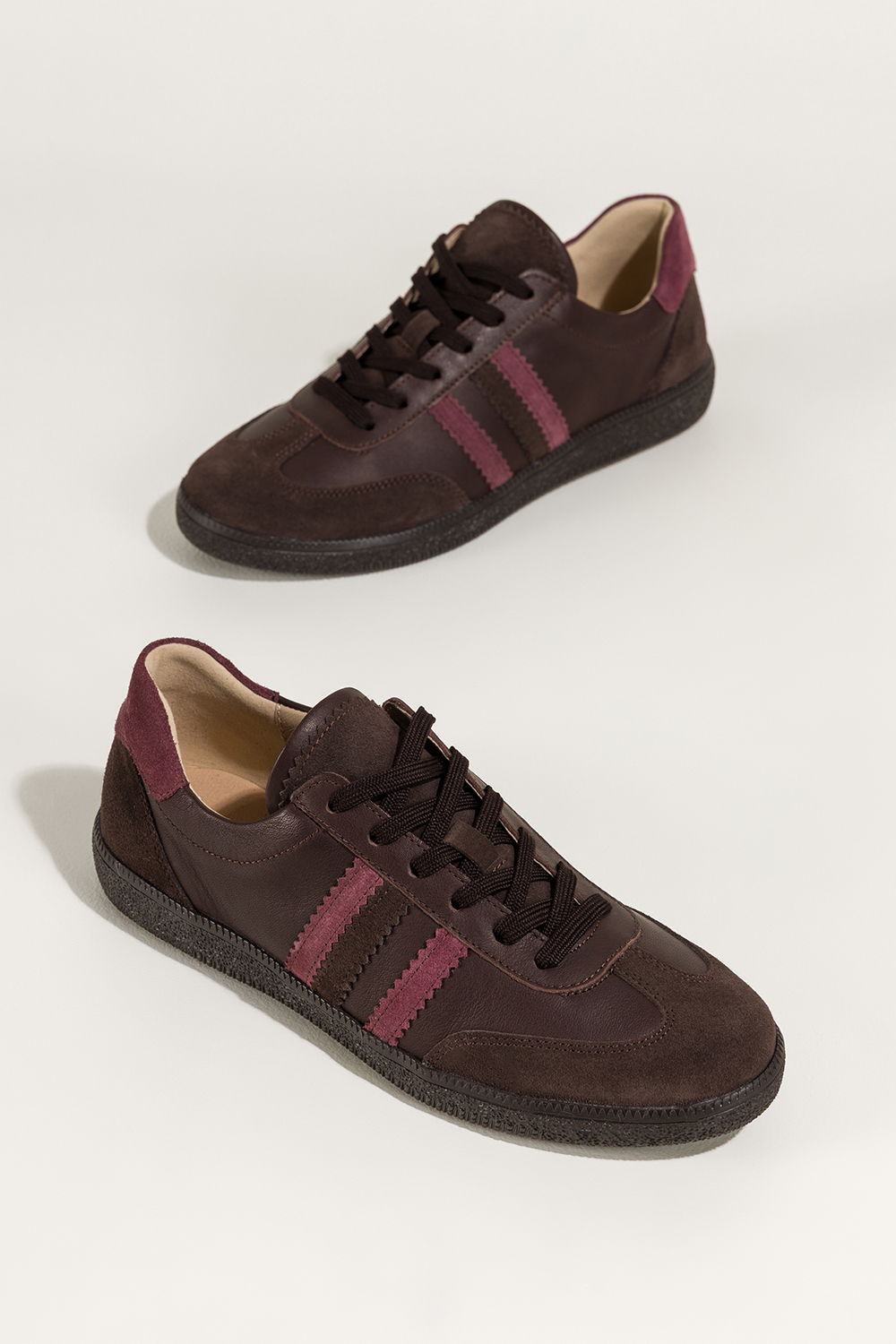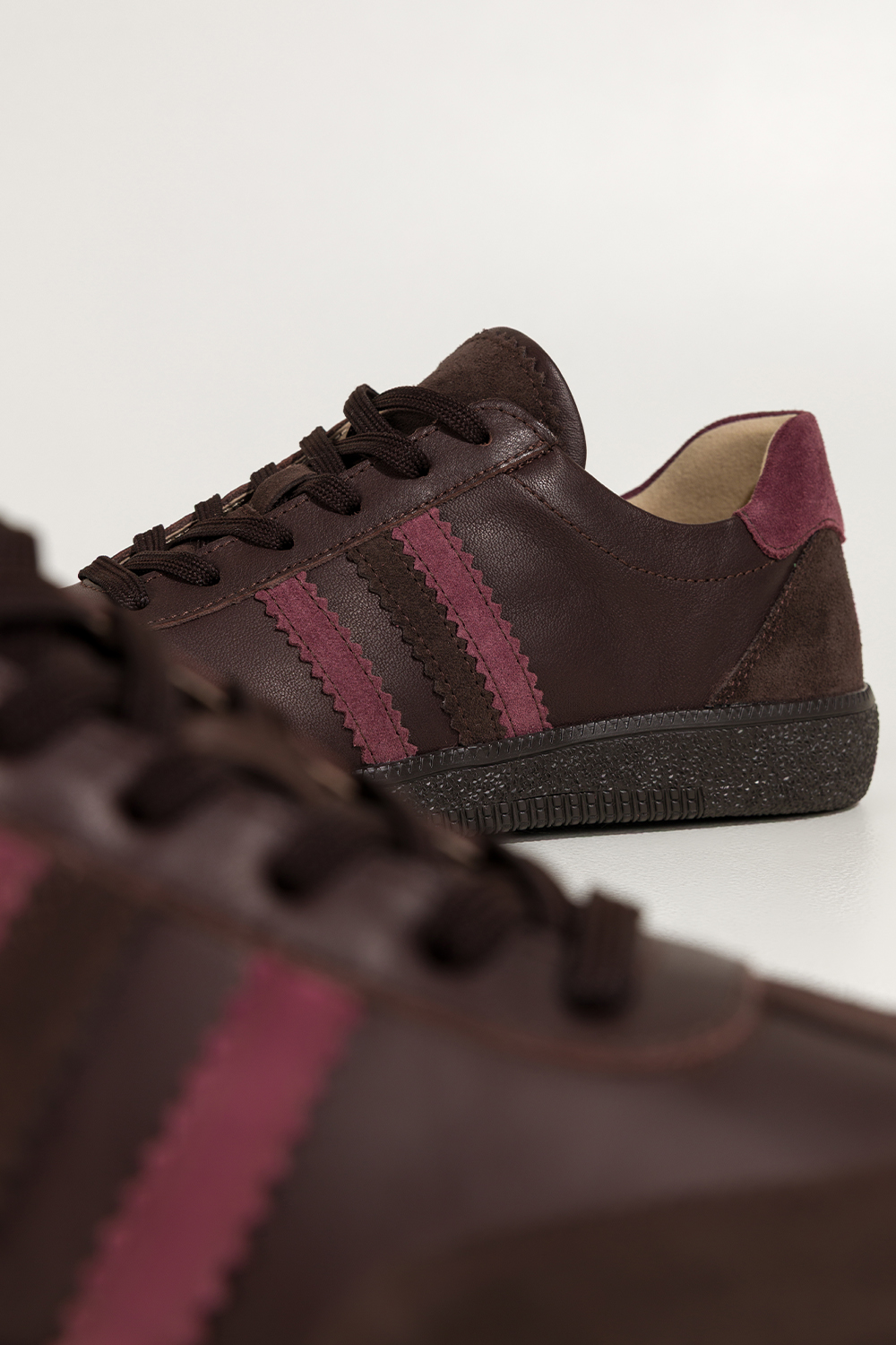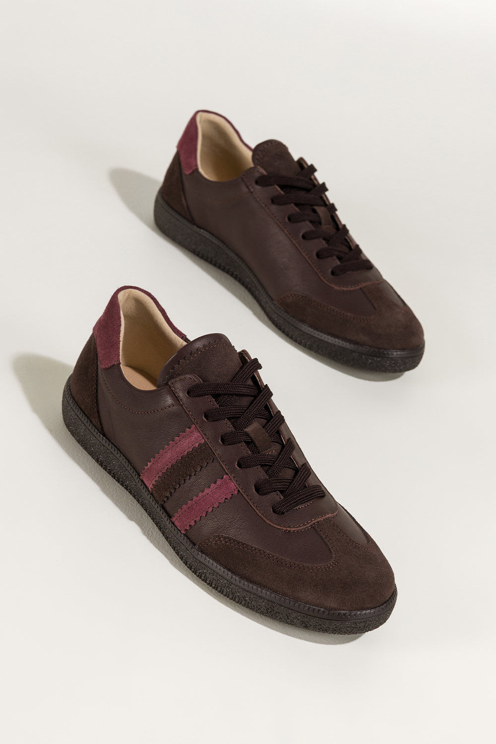 Czekoladowe sneakersy skórzane damskie buty sportowe na elastycznej podeszwie bordowe wstawki sznur