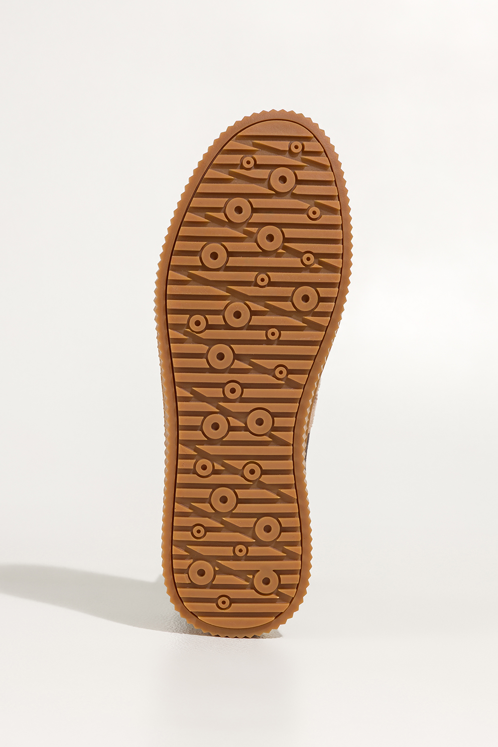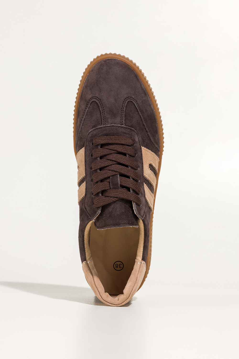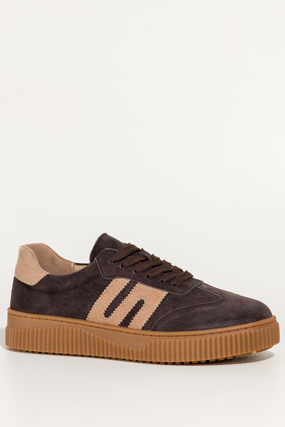 Czekoladowe sneakersy skórzane damskie buty sportowe na żłobionej beżowej platformie beżowe wstawki