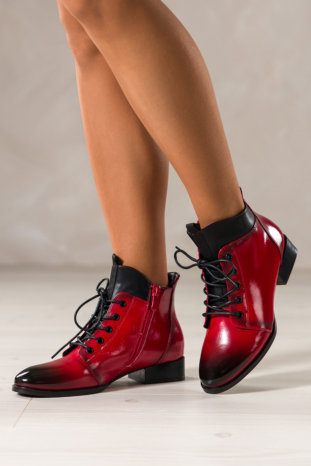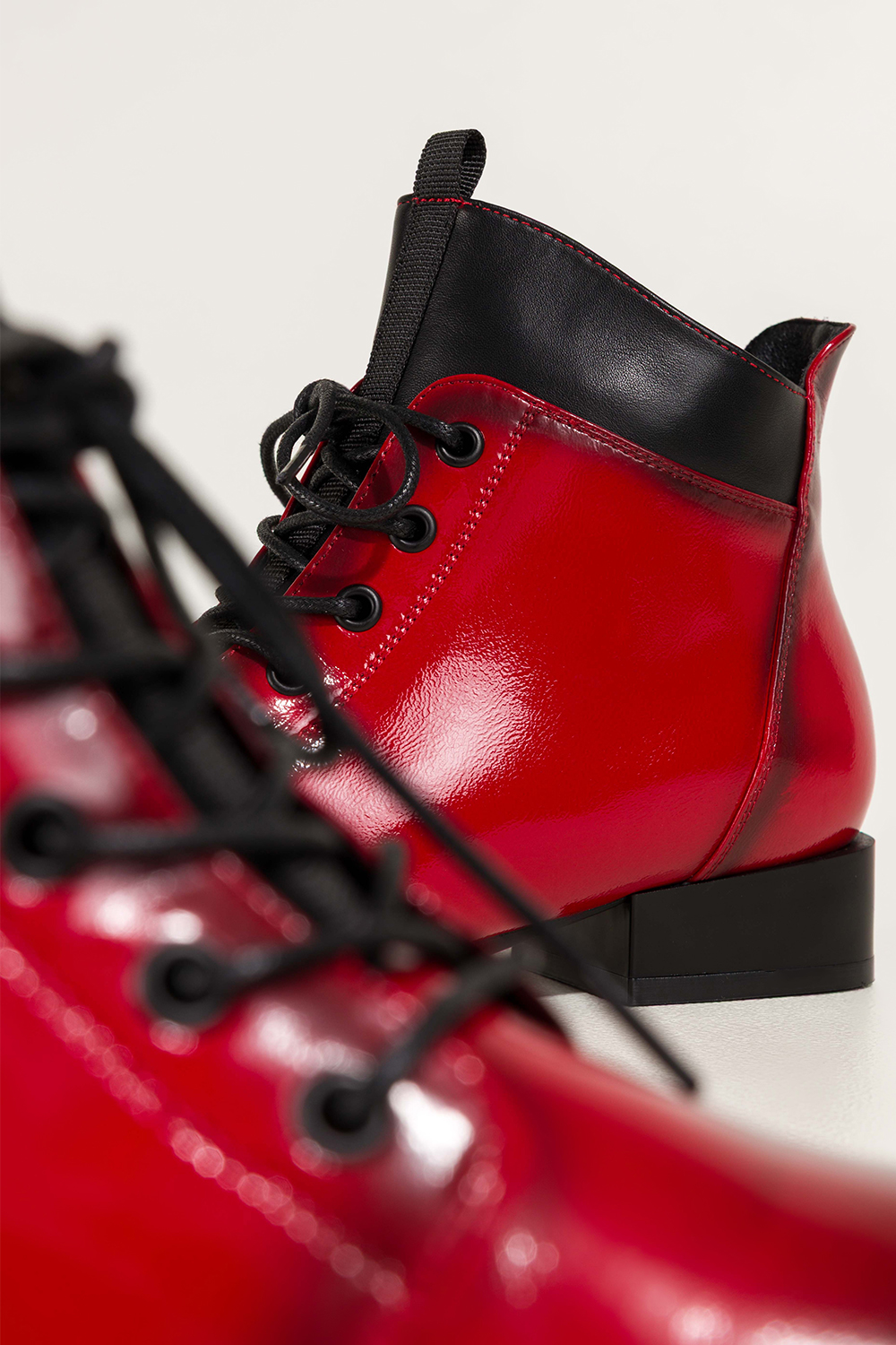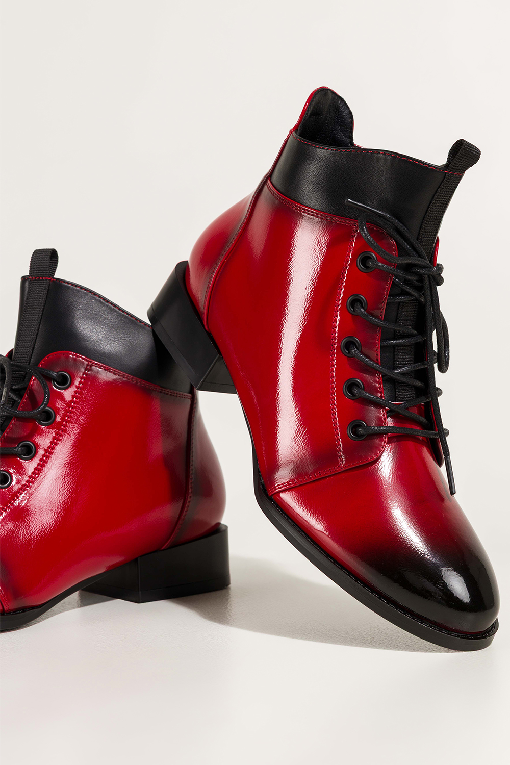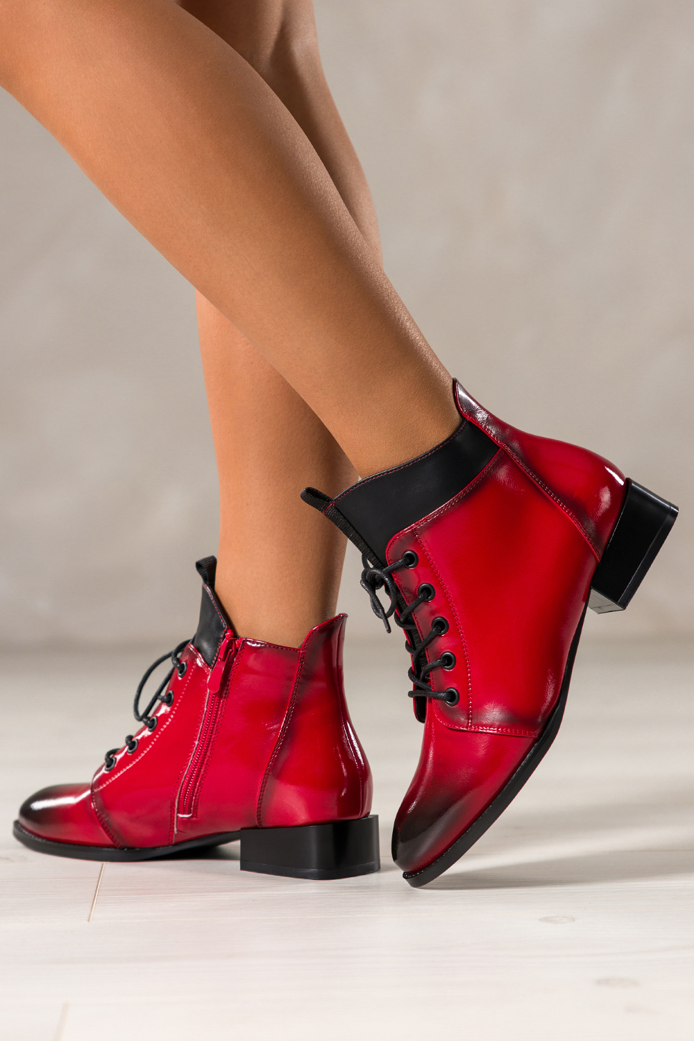 Czerwone botki damskie lakierowane na niskim klocku z czarnymi wstawkami sznurowane Casu S7748