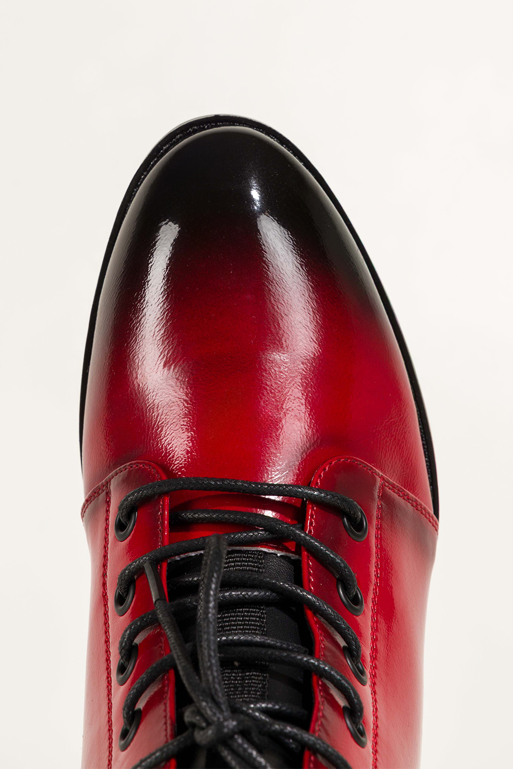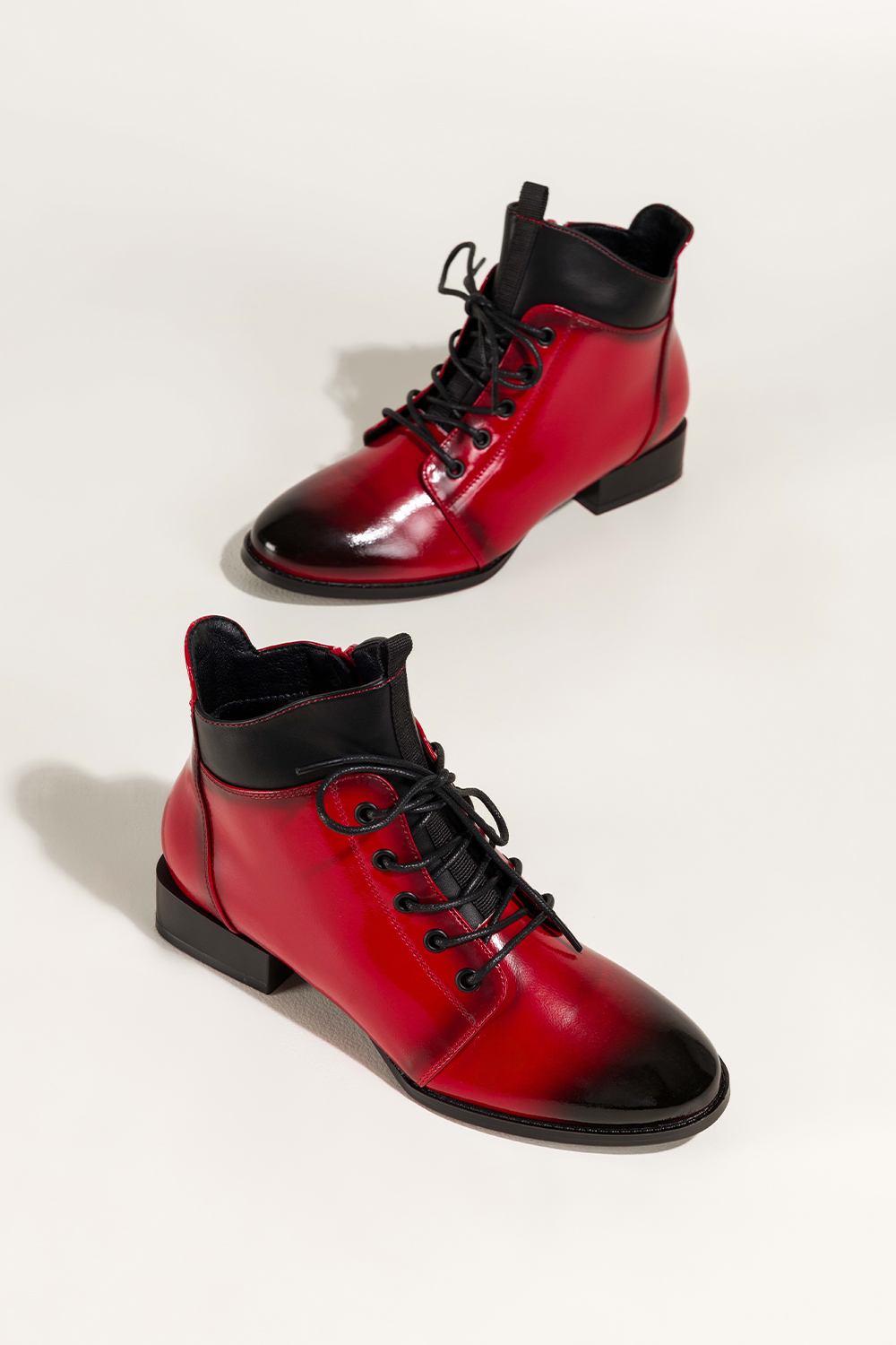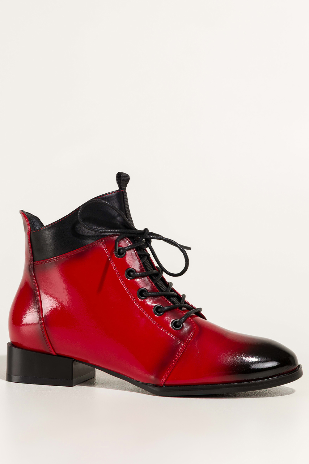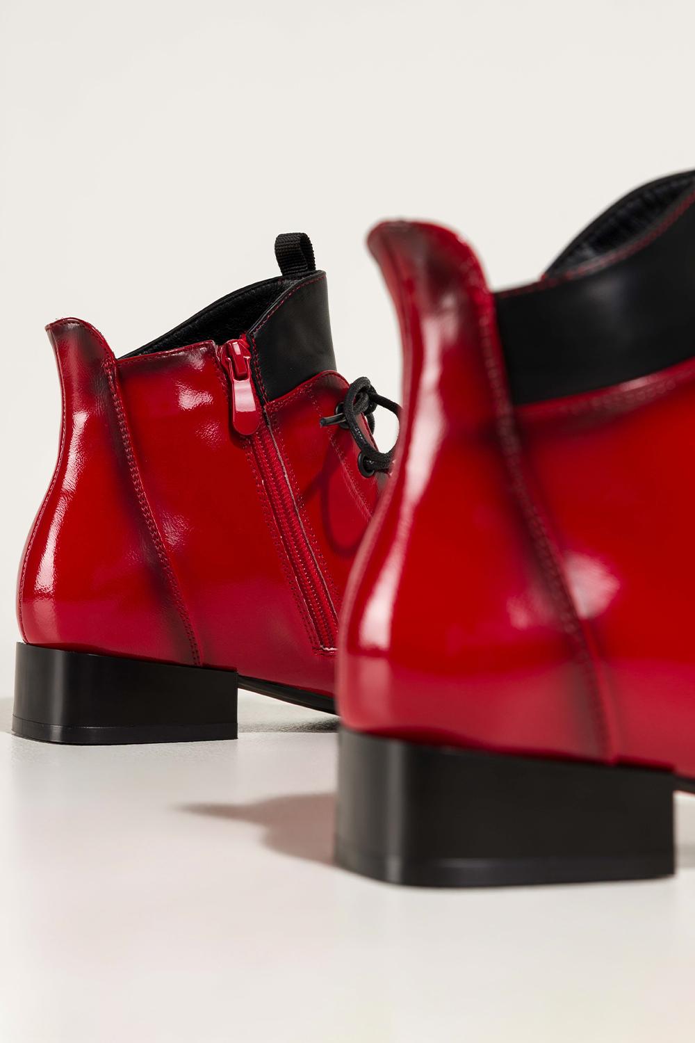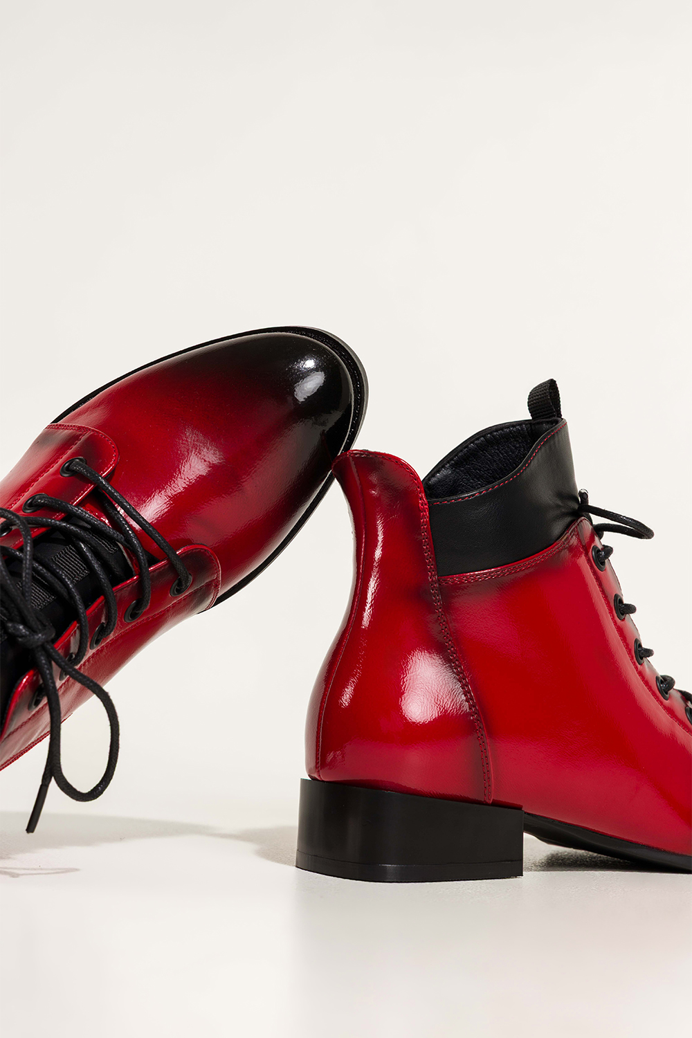 Czerwone botki damskie lakierowane na niskim klocku z czarnymi wstawkami sznurowane Casu S7748