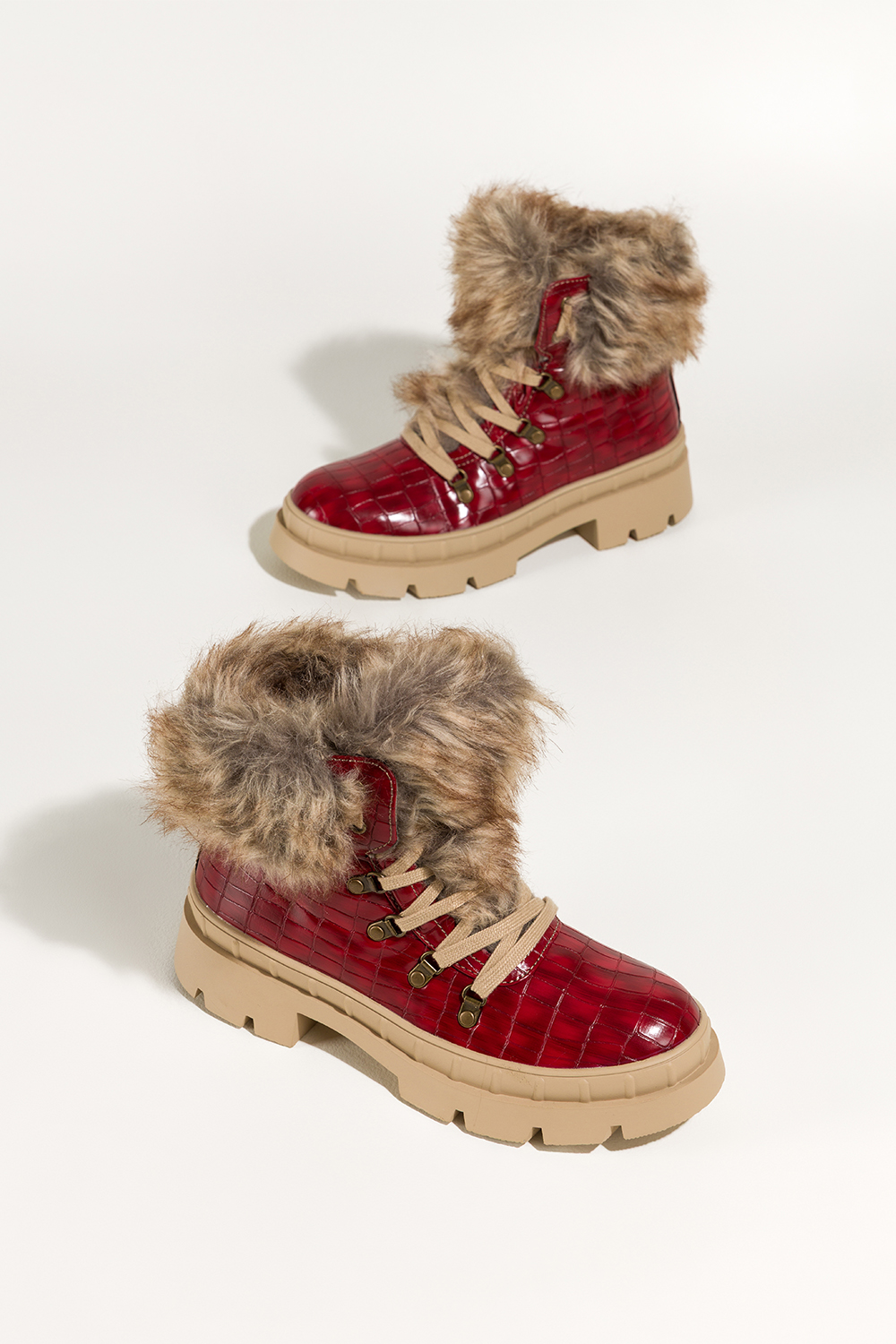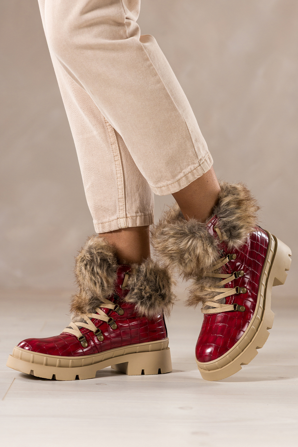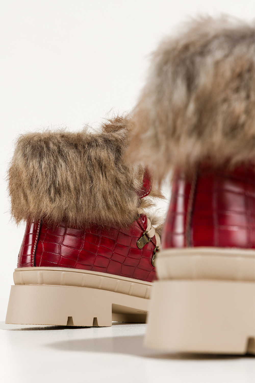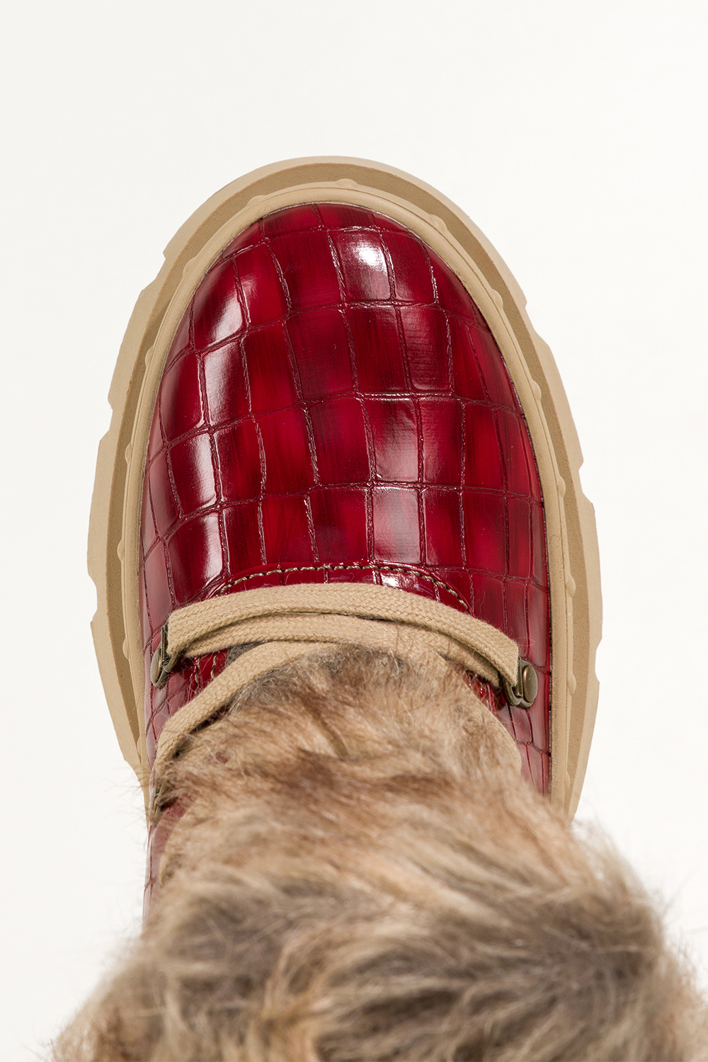 Czerwone botki śniegowce damskie trapery na bieżnikowanej platformie wykończone futerkiem krokodyli