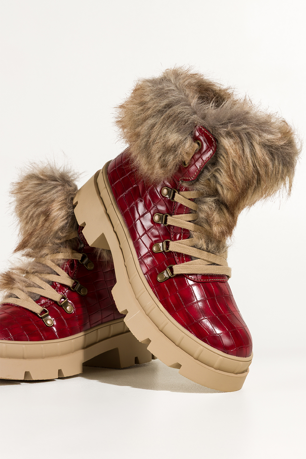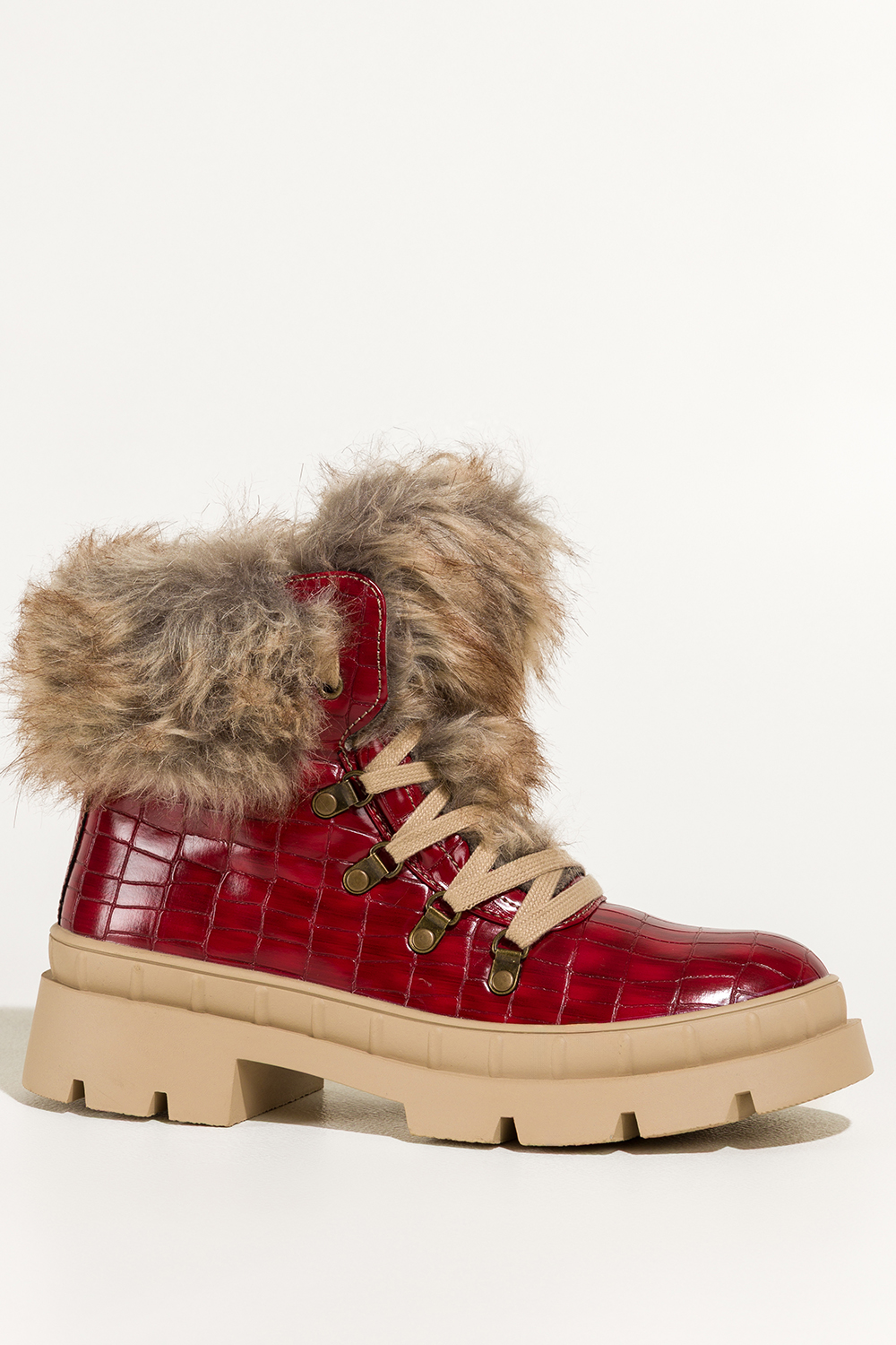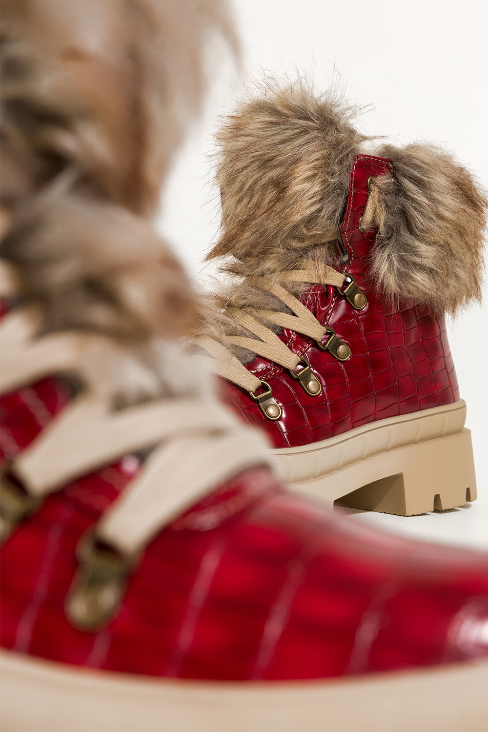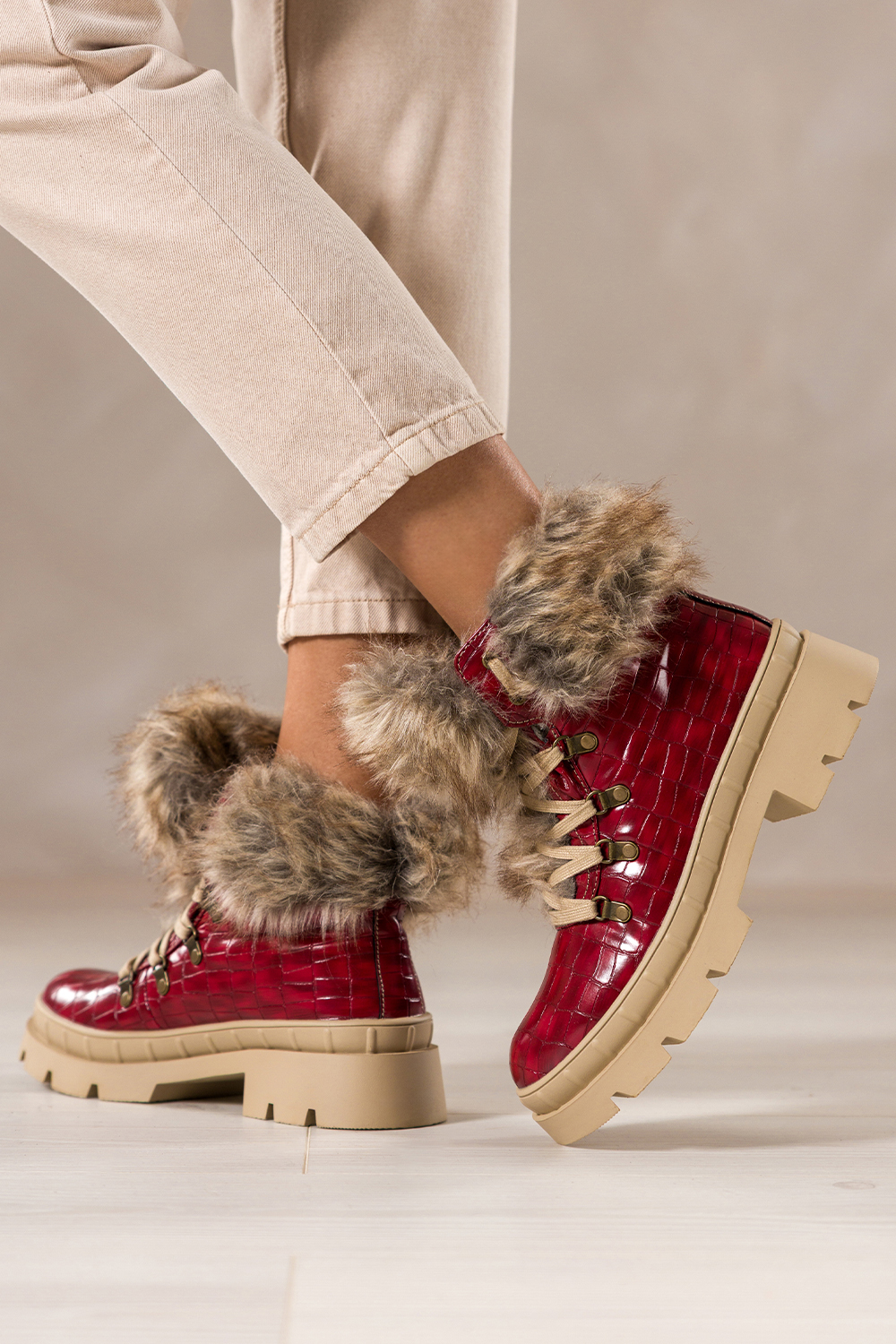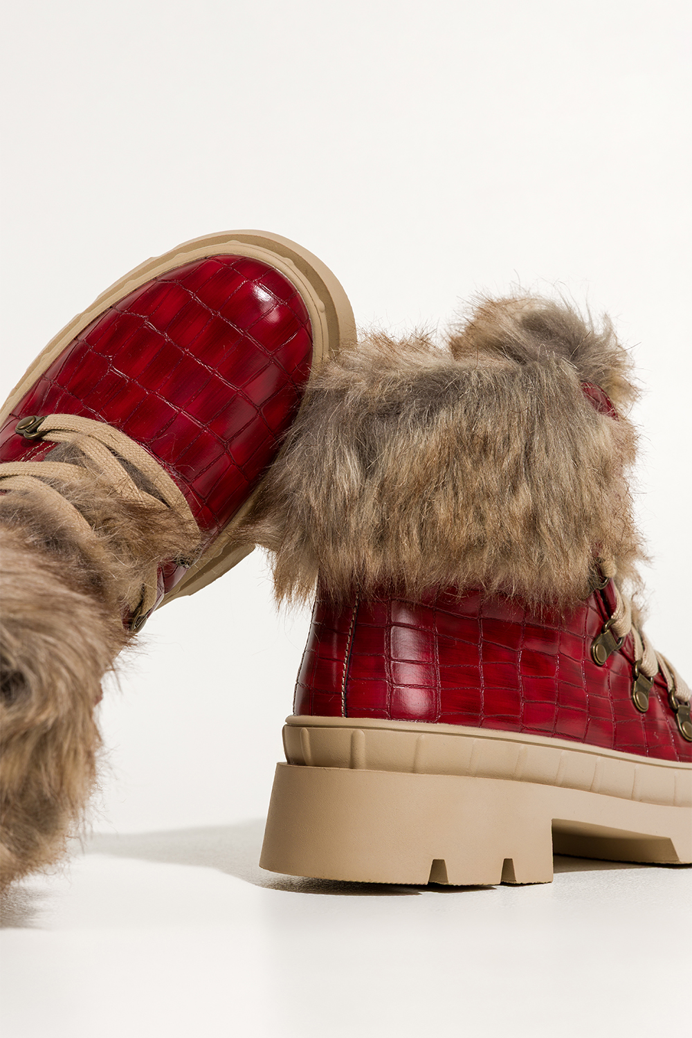 Czerwone botki śniegowce damskie trapery na bieżnikowanej platformie wykończone futerkiem krokodyli