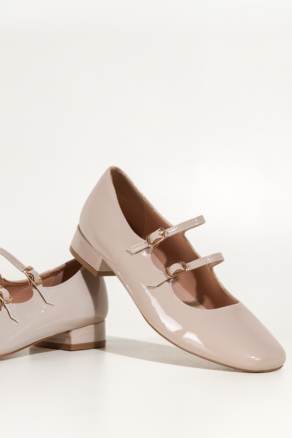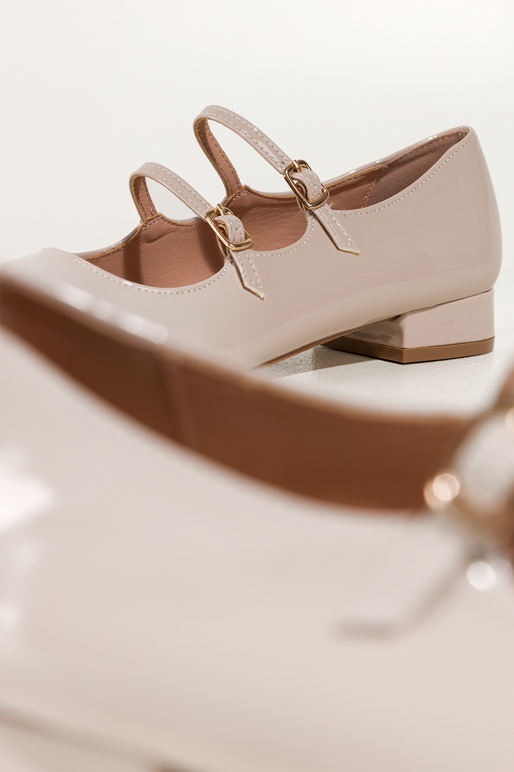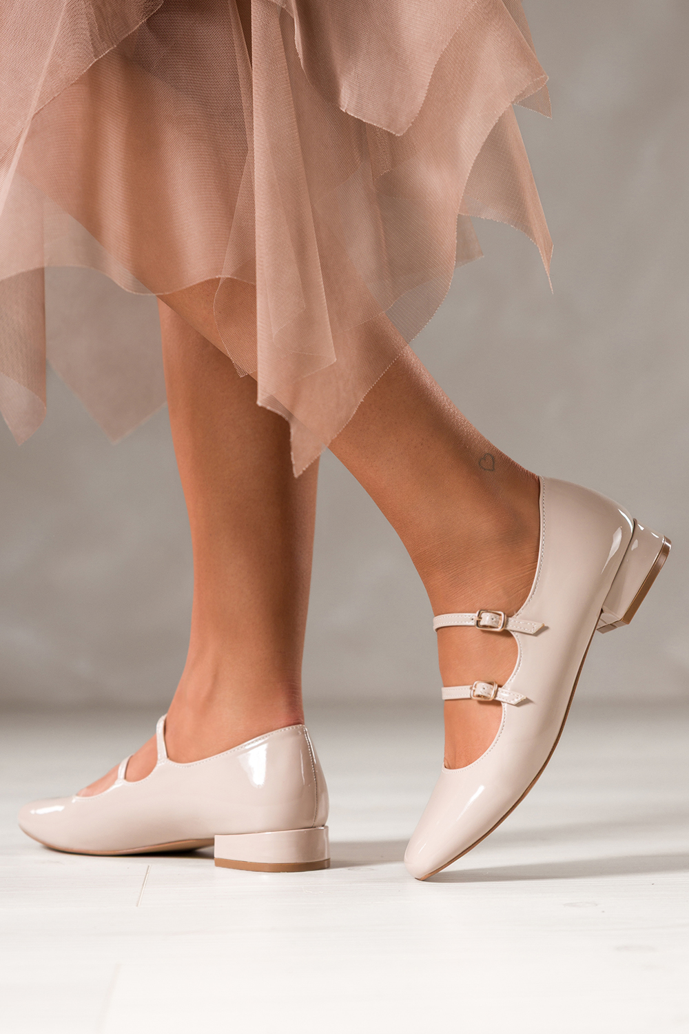 Jasnobeżowe baleriny damskie lakierowane Mary Jane z paskami niski obcas klocek Carla ZR84K