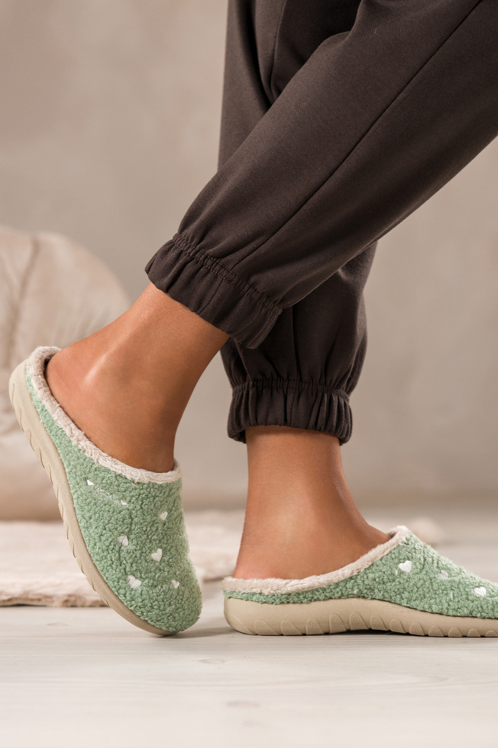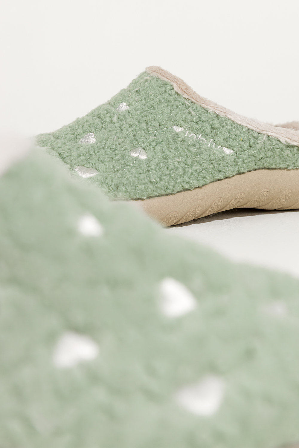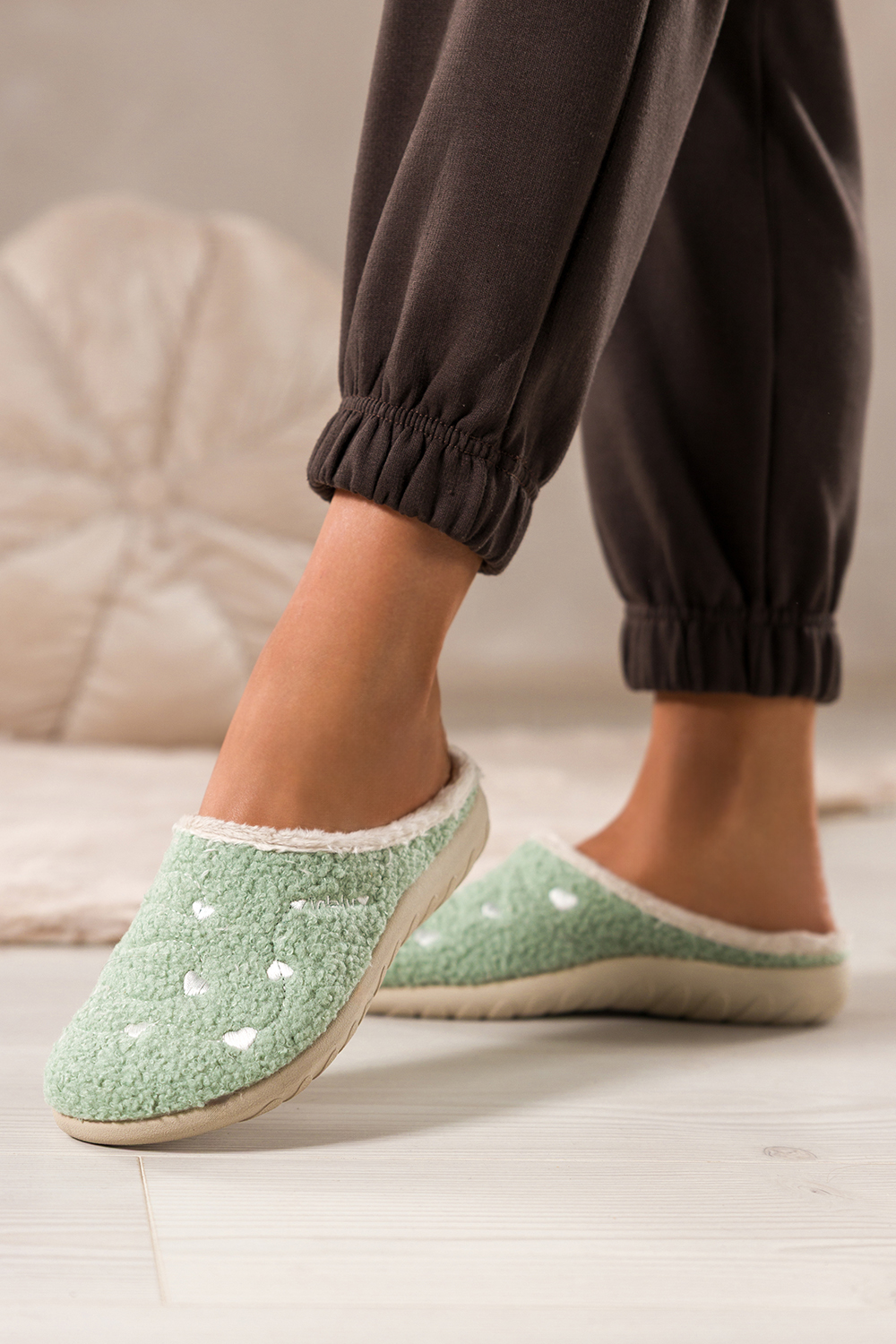 Miętowe kapcie damskie Inblu obuwie domowe z materiału typu baranek ozdobione sercami VG999966