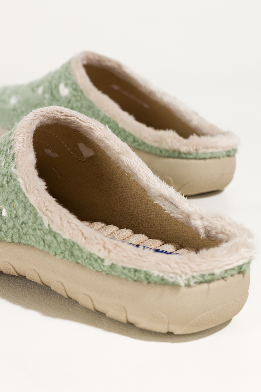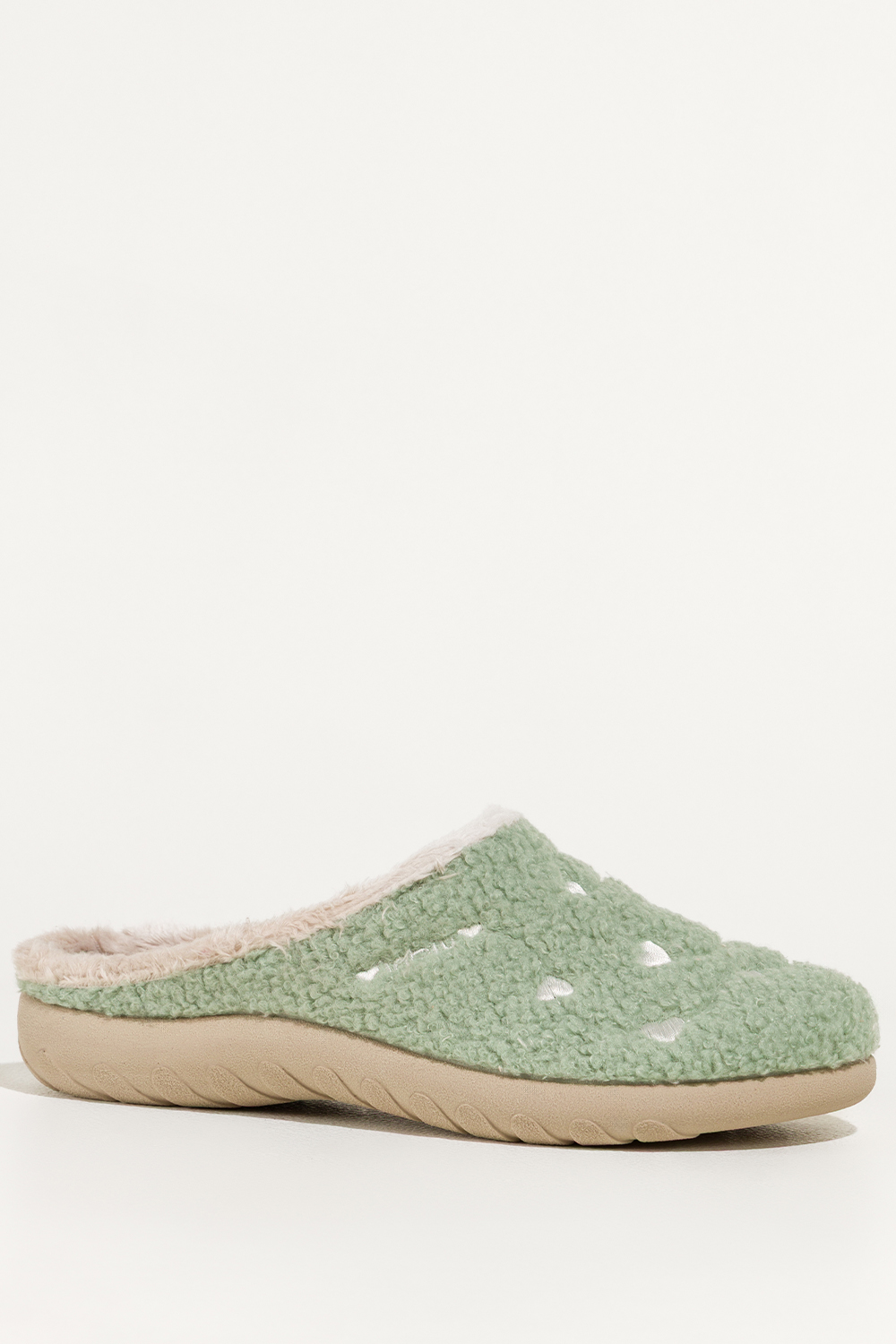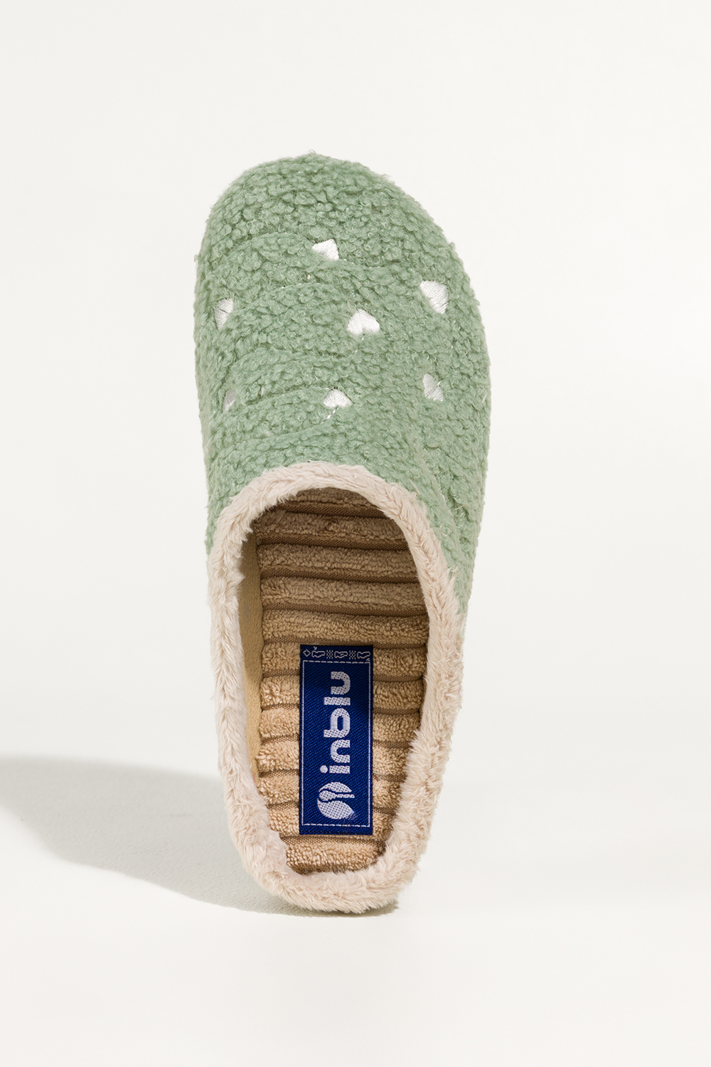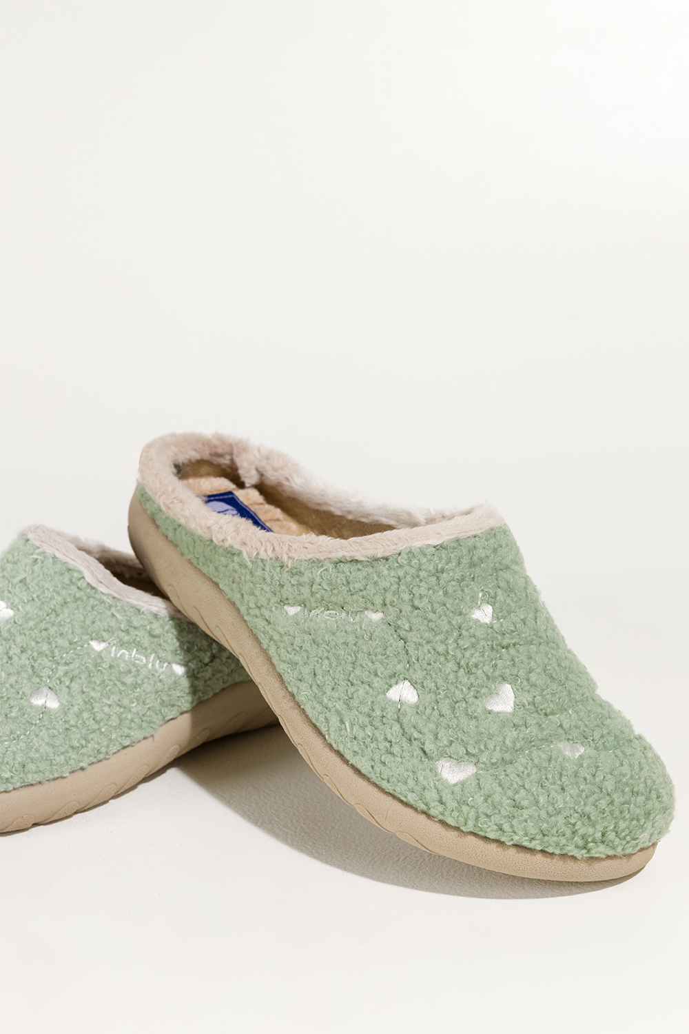 Miętowe kapcie damskie Inblu obuwie domowe z materiału typu baranek ozdobione sercami VG999966