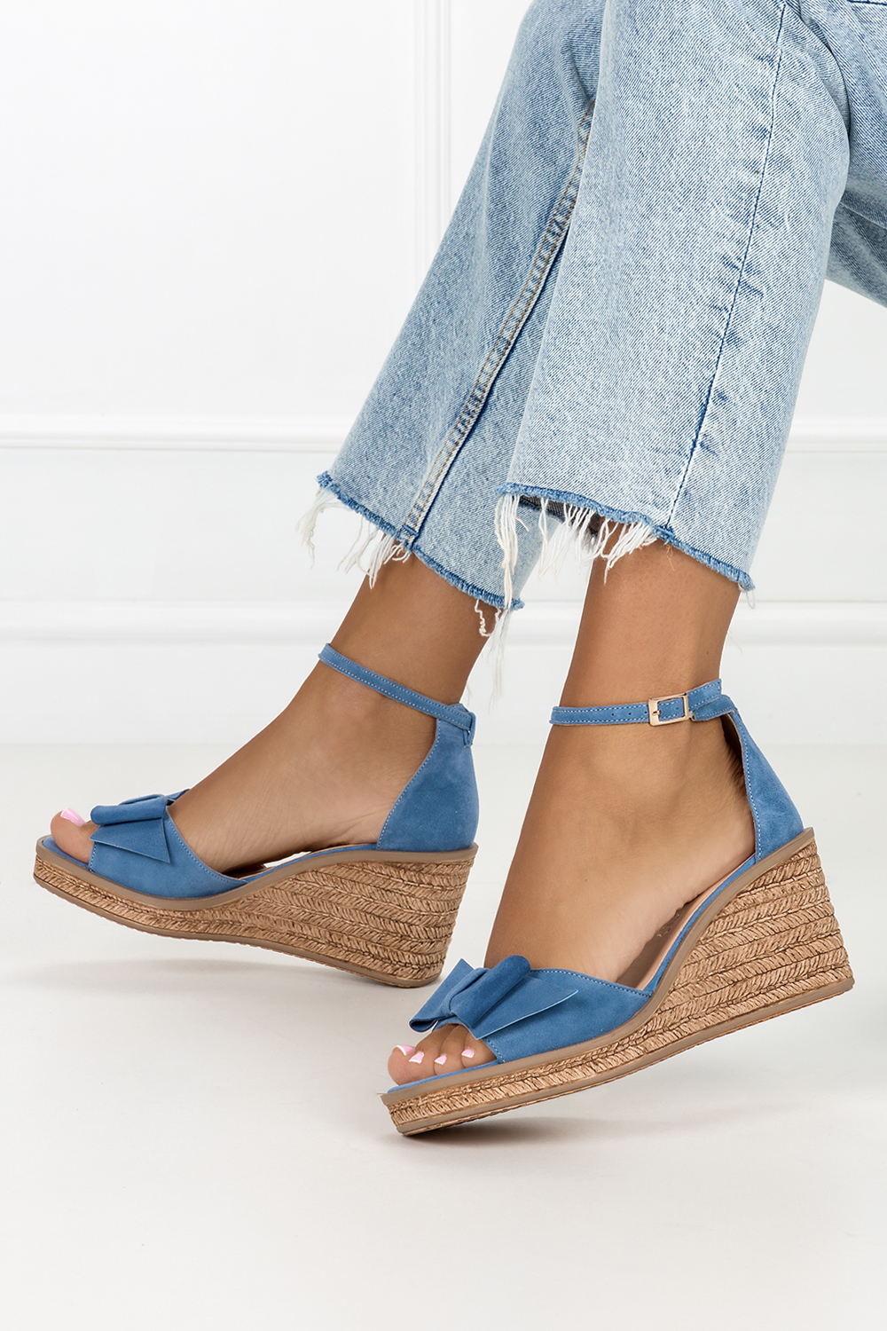Niebieskie sandały skórzane espadryle damskie na koturnie z zakrytą piętą pasek wokół kostki kokard
