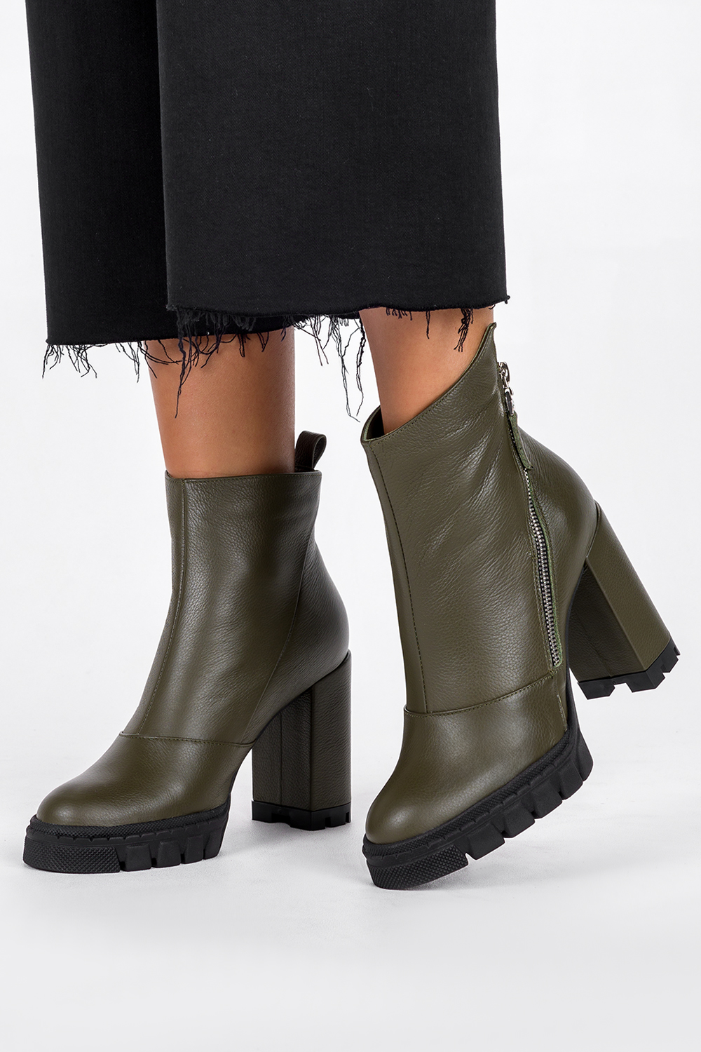 Oliwkowe botki skórzane damskie na słupku z ozdobnym suwakiem PRODUKT POLSKI Casu 2509-195
