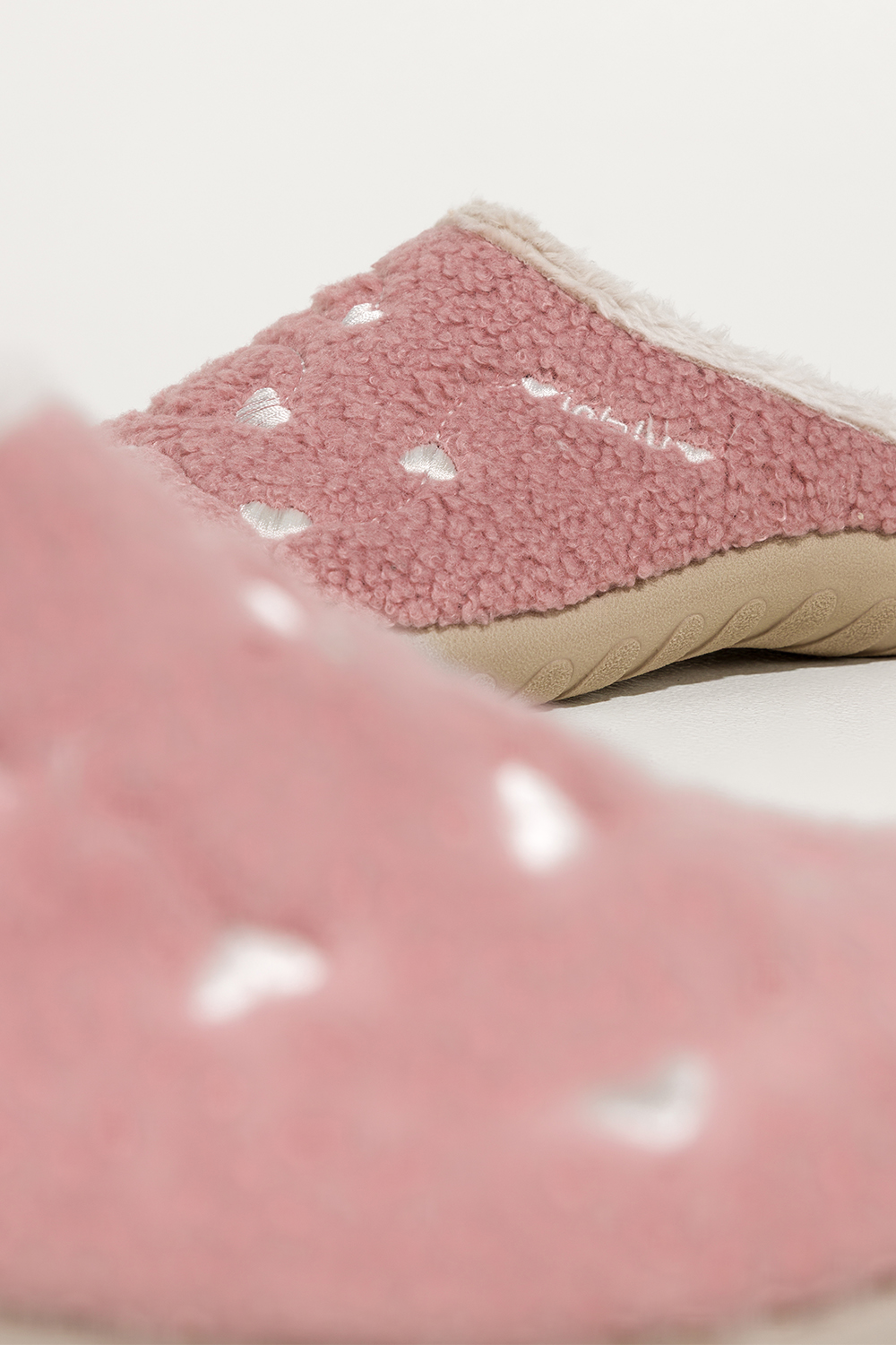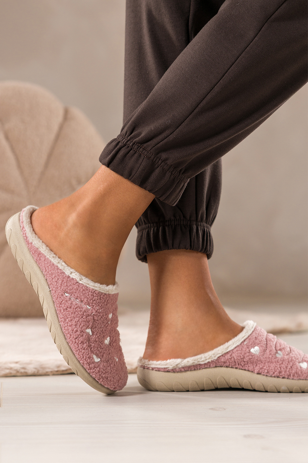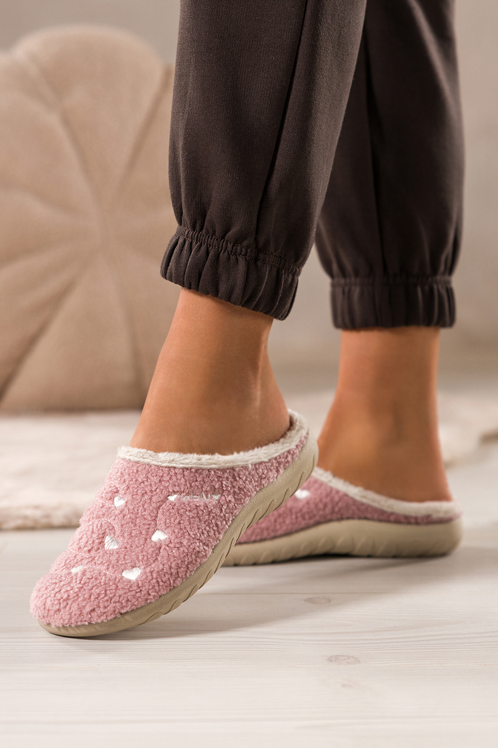 Różowe kapcie damskie Inblu obuwie domowe z materiału typu baranek ozdobione sercami VG999966