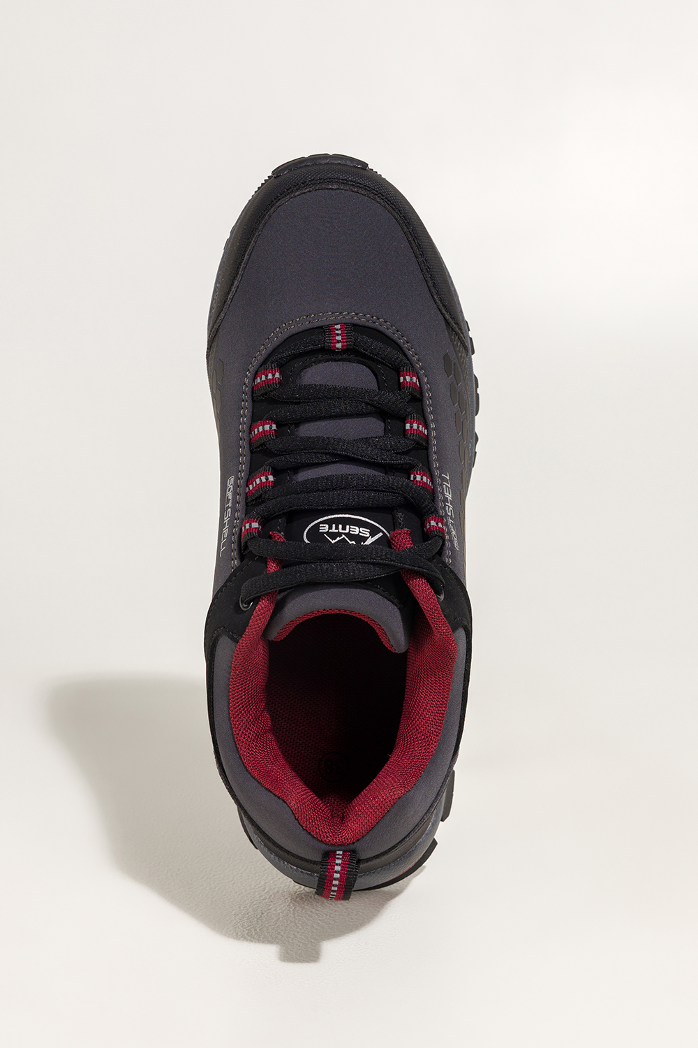 Szare buty trekkingowe damskie sznurowane z bordowymi wstawkami softshell Casu Y8187-2