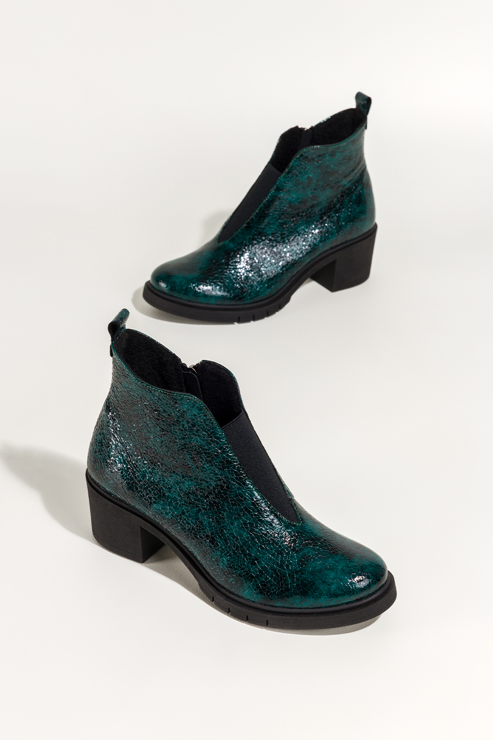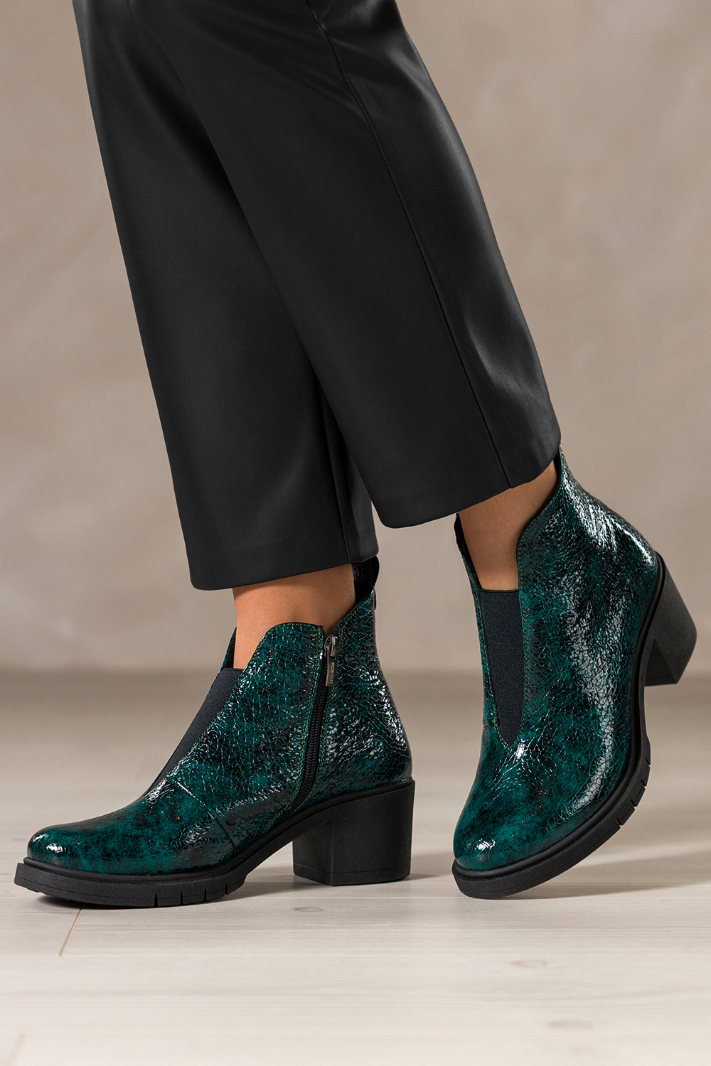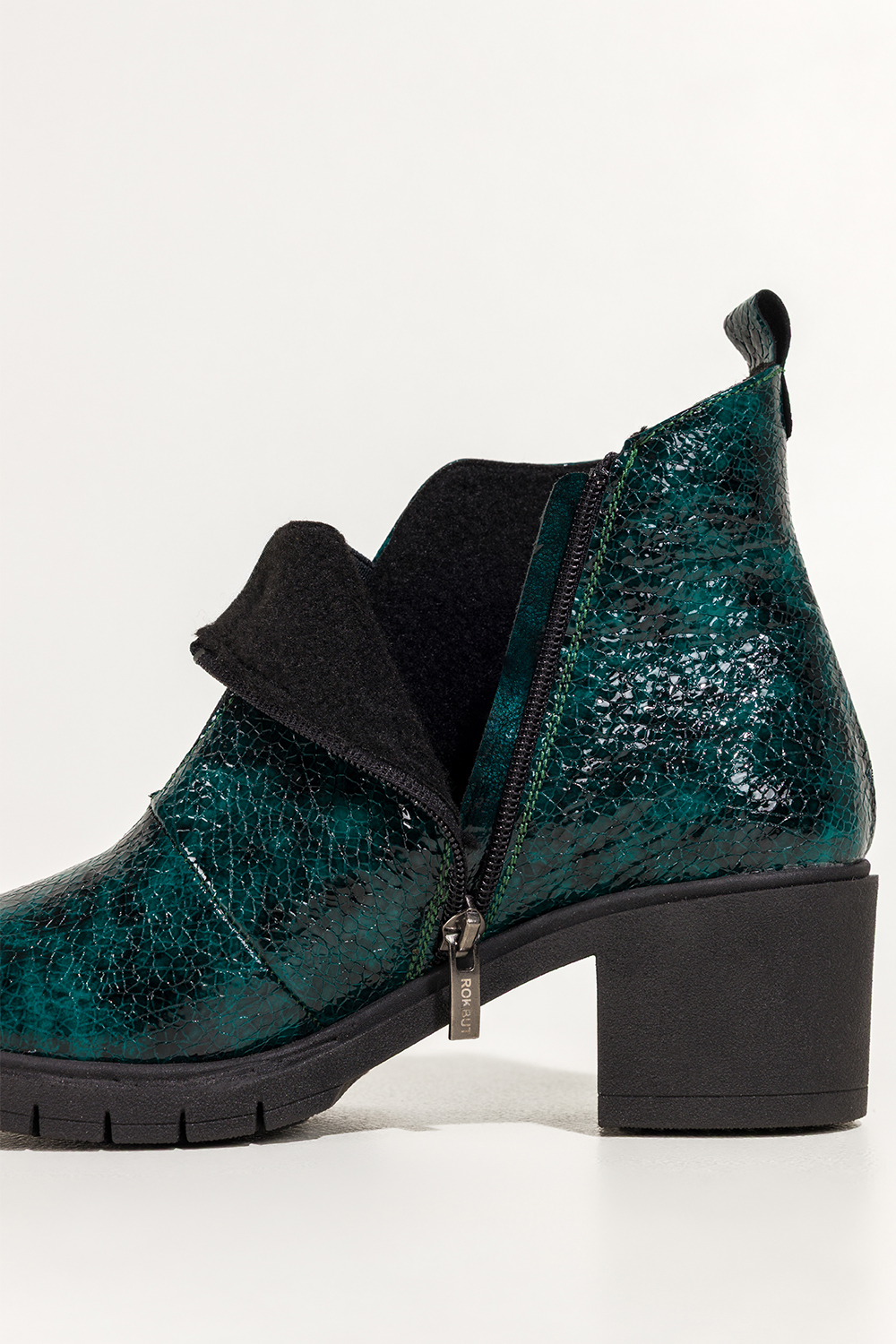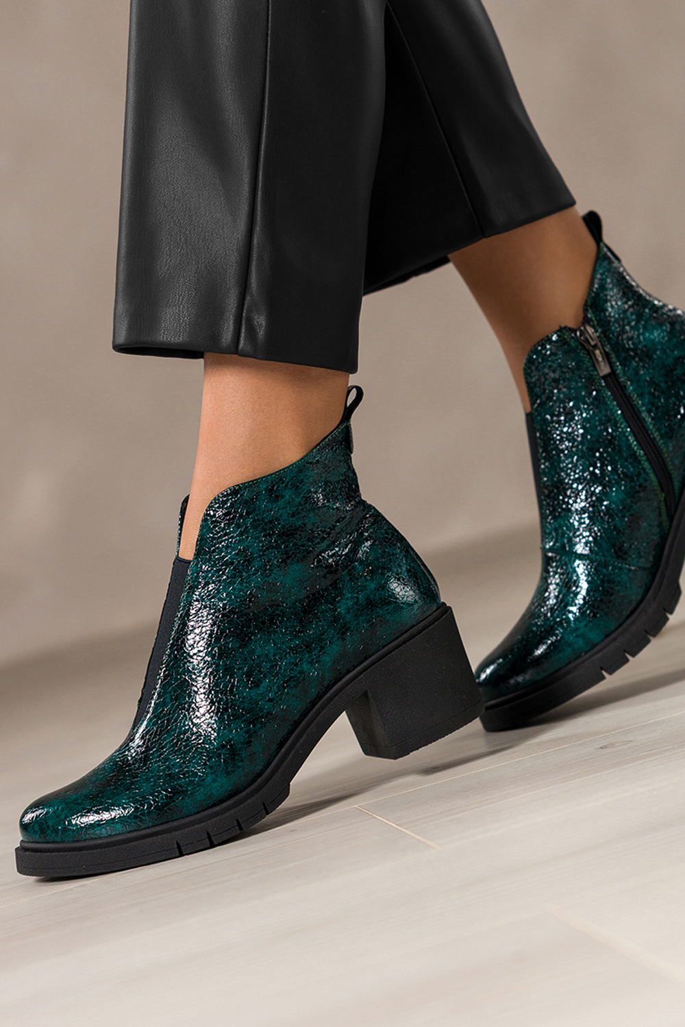Zielone botki skórzane damskie lakierowane z wzorem wężowym obcas klocek szeroka elastyczna guma na przodzie PRODUKT POLSKI Casu model 376. Wykonane z wysokogatunkowej skóry lakierowanej, prezentują się niezwykle elegancko, a oryginalny wężowy wzór dodaje im wyrazistego charakteru. Botki są ocieplone miękkim kocem obuwniczym, co sprawia, że świetnie sprawdzą się w chłodniejsze dni. Lakierowana powierzchnia przepięknie odbija światło, tworząc niezwykle elegancki efekt wizualny. Stabilny obcas typu klocek oraz zaokrąglony nosek sprawiają, że botki są nie tylko modne, ale i wygodne w codziennym użytkowaniu. Dzięki uniwersalnej kolorystyce w odcieniu głębokiej zieleni świetnie komponują się z jeansami, sukienkami, a nawet biurowymi stylizacjami. Szeroka elastyczna guma umieszczona na przodzie cholewki nie tylko ułatwia zakładanie, ale również zapewnia idealne dopasowanie do kształtu stopy. Zamek błyskawiczny po wewnętrznej stronie cholewki podnosi wygodę użytkowania. Botki sprawdzą się zarówno na co dzień, jak i na bardziej formalne wyjścia, gwarantując niezrównany komfort i styl przez cały dzień. Cechy wyróżniające Wysokogatunkowa skóra lakierowana z wężowym wzorem Stabilny obcas klocek dla większego komfortu Miękkie ocieplenie z koca obuwniczego Szeroka elastyczna guma na przodzie, idealne dopasowanie Polska produkcja, wysoka jakość wykonania Uniwersalna, głęboka zieleń pasująca do wielu stylizacji Odkryj nowy poziom elegancji i komfortu, robiąc zakupy w sklepie Casu, miejscu, gdzie moda spotyka się z jakością!