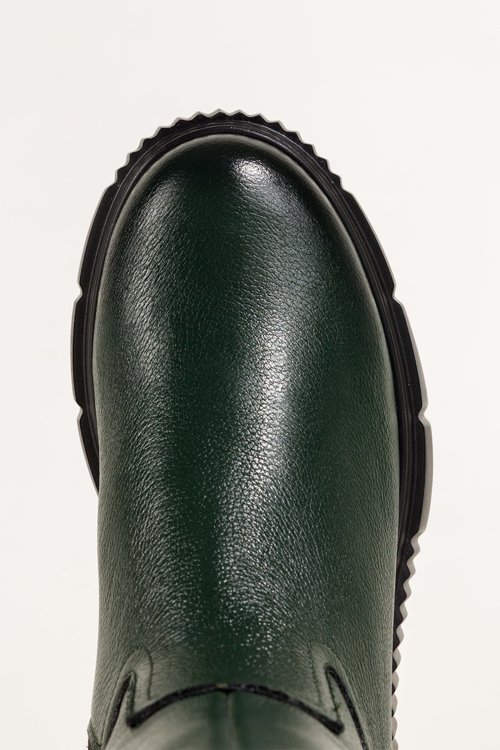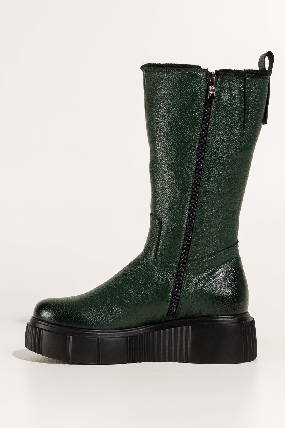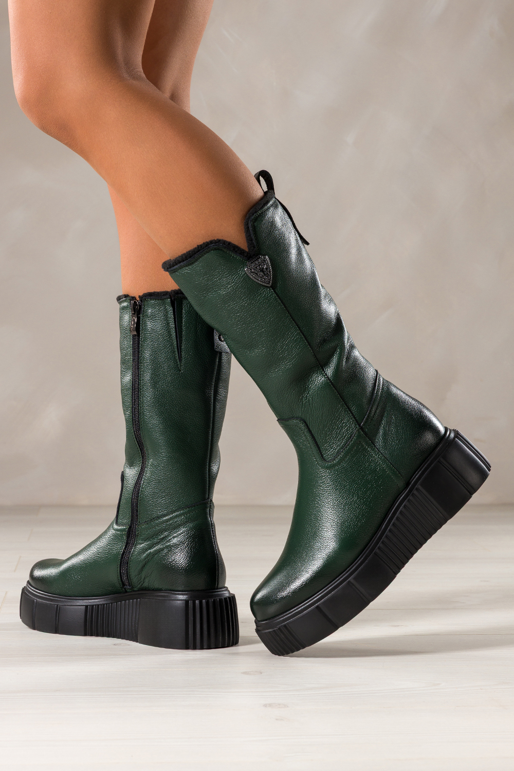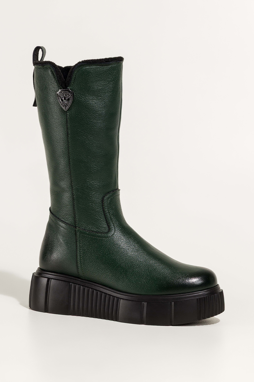 Zielone kozaki skórzane damskie przed kolano na żłobionej platformie wycięta cholewka stalowa ozdoba PRODUKT POLSKI Casu 29878. Wykonane z miękkiej, naturalnej skóry o głębokim, szlachetnym odcieniu zieleni, zachwycają nie tylko wyglądem, ale także trwałością. Ocieplane kożuszkiem, zapewniają komfort w chłodne dni, a solidna żłobiona platforma gwarantuje stabilność i świetną przyczepność nawet na śliskim podłożu. To obuwie, które łączy klasyczne rzemiosło z nowoczesnym designem, spełniając oczekiwania najbardziej wymagających kobiet. Wycięta cholewka z efektownym wykończeniem z kożuszka oraz stalowa ozdoba na boku nadają kozakom wyrazistego, niepowtarzalnego charakteru. Ten model przyciąga spojrzenia i staje się centralnym punktem każdej stylizacji, zarówno miejskiej, jak i casualowej. Ich zaokrąglony nosek i smukła linia cholewki optycznie wydłużają nogi, dodając sylwetce lekkości. Kozaki świetnie komponują się z płaszczami, dzianinowymi sukienkami czy legginsami, tworząc stylowe i ciepłe zestawy na co dzień i na specjalne okazje. Zamek błyskawiczny na wewnętrznej stronie ułatwia szybkie zakładanie, a solidna konstrukcja i wysokiej klasy materiały gwarantują długowieczność produktu. To idealne buty dla kobiet ceniących komfort, modę i funkcjonalność. Świetnie sprawdzą się podczas zimowych spacerów, zakupów w mieście, a także spotkań towarzyskich. Ich ponadczasowy design i wygoda użytkowania sprawiają, że to inwestycja na wiele sezonów. Przemyślany fason i detale projektowe odpowiadają na potrzeby nowoczesnych kobiet, niezależnych, stylowych i pewnych siebie. Cechy wyróżniające Naturalna, wysokogatunkowa skóra w intensywnym kolorze zieleni Wycięta cholewka z kożuszkowym wykończeniem Stabilna, żłobiona platforma zapewniająca przyczepność Efektowna stalowa ozdoba dodająca charakteru Miękkie ocieplenie z kożuszka Praktyczne zapięcie na zamek Polska produkcja, gwarancja jakości i dbałości o detale Postaw na polską jakość, modny design i uniwersalność. Zamów już dziś na Casu i odkryj nowy wymiar kobiecego stylu! Kozaki posiadają wąską cholewkę, dlatego najlepiej sprawdzą się na szczupłą łydkę.