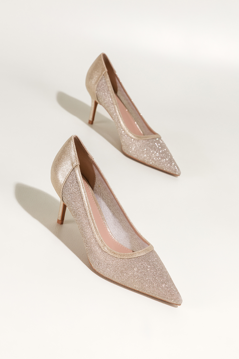 Złote czółenka damskie szpilki z siateczką ozdobione cyrkoniami odkryta pięta Carla N876